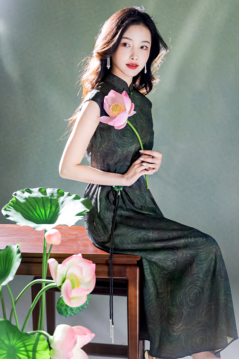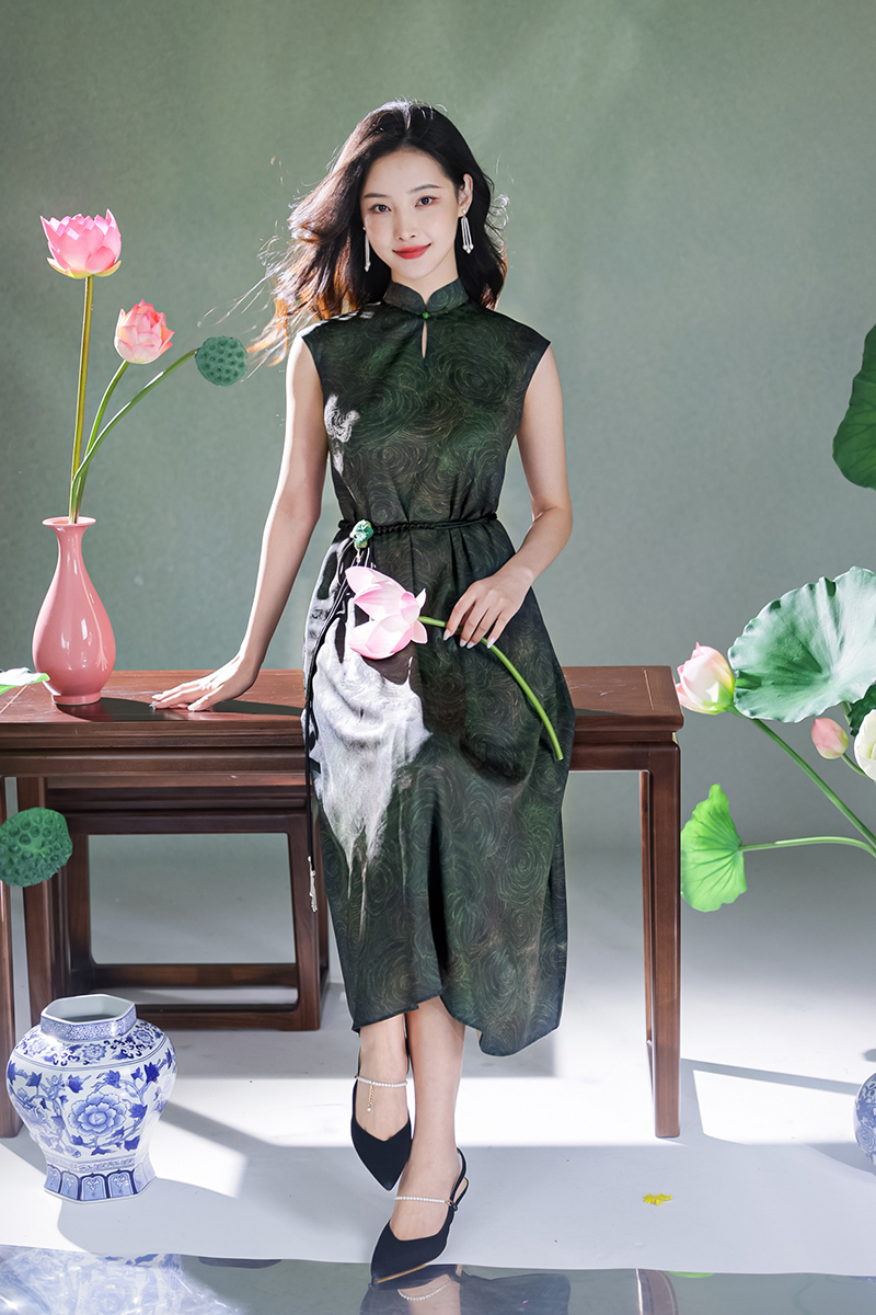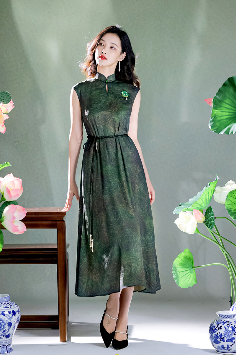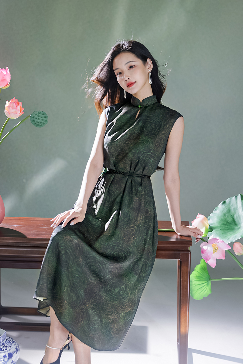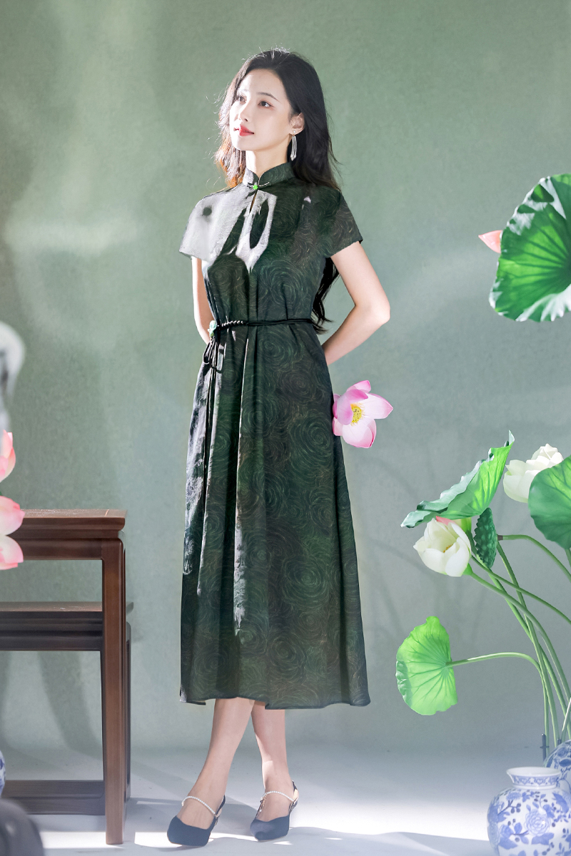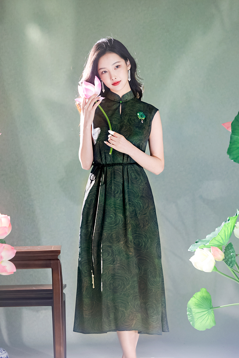 灵感源自江南水乡的朦胧诗意,以深绿与浅绿交织的玫瑰提花为魂,像烟雨中摇曳的荷塘月色...~