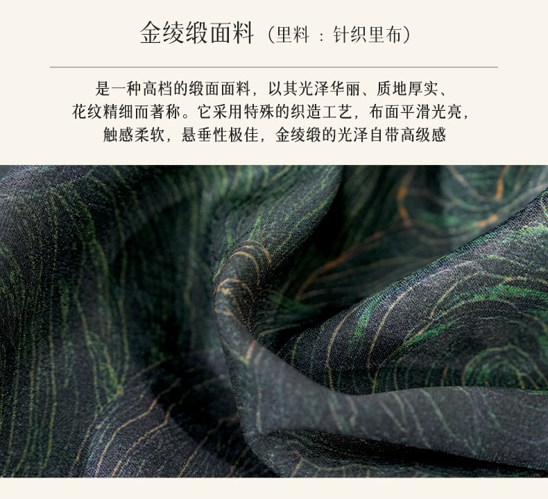 是一种高档的缎面面料。主体采用金绫缎,经纬交织间流淌着丝绸的柔滑与缎面的华贵。特殊织造工艺赋予其月光倾泻般的光泽,触手温润如玉,悬垂如瀑,举手投足间尽显雍容气度。