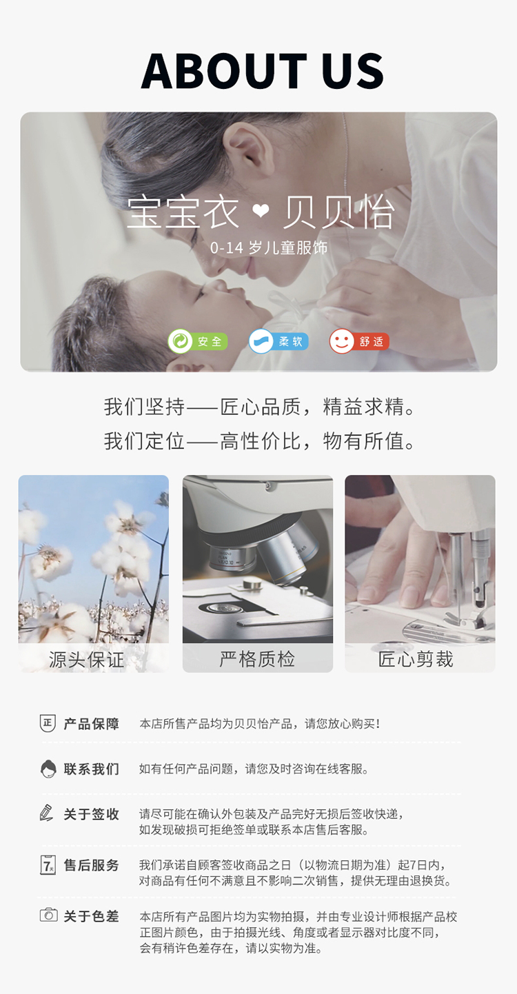 - 贝贝怡专注0-6岁婴幼儿服饰,坚持安全、柔软、舒适的产品理念,为千万中国家庭提供超高品质、安全可靠的婴幼儿服饰产品,妈妈放心,宝宝开心!