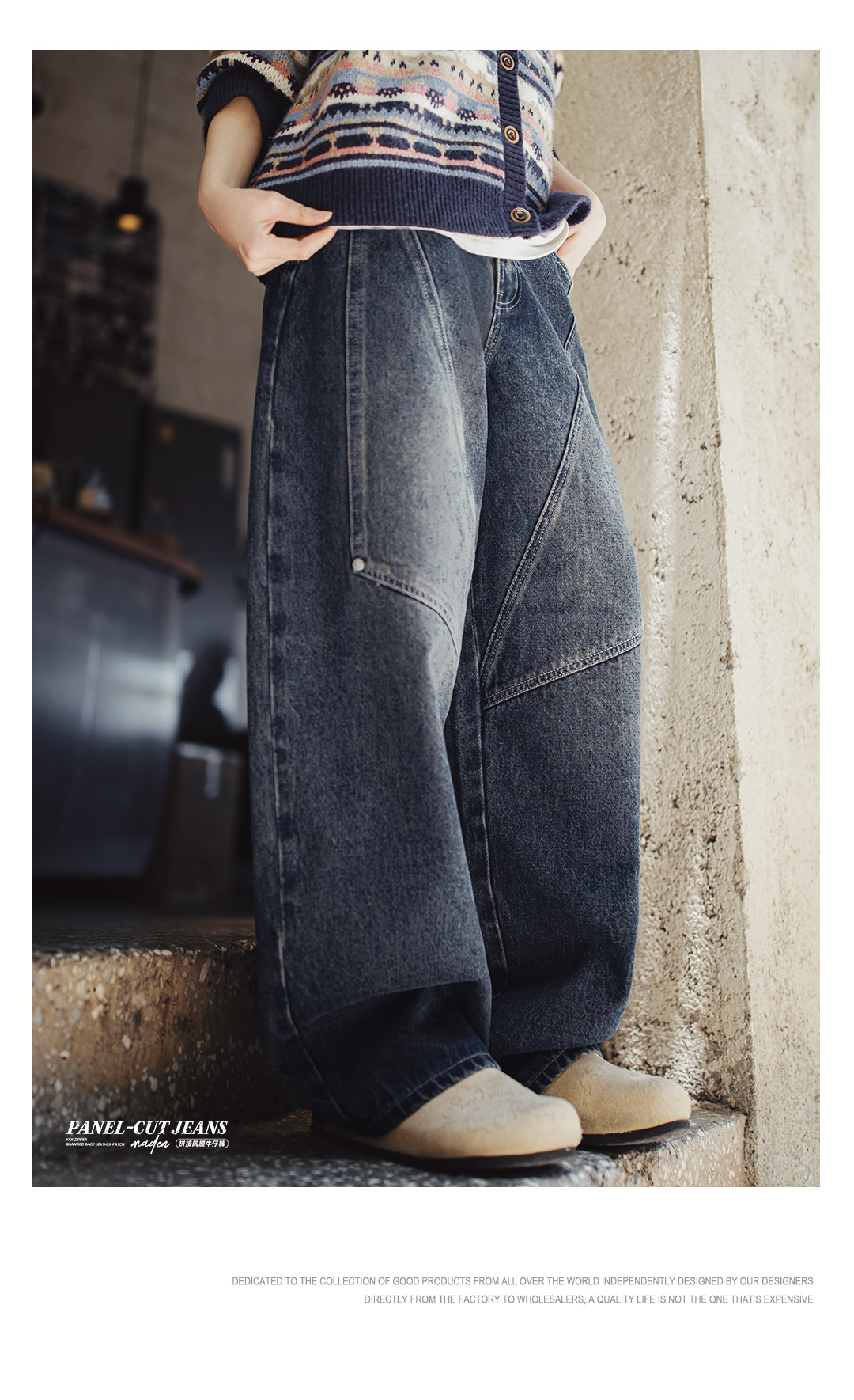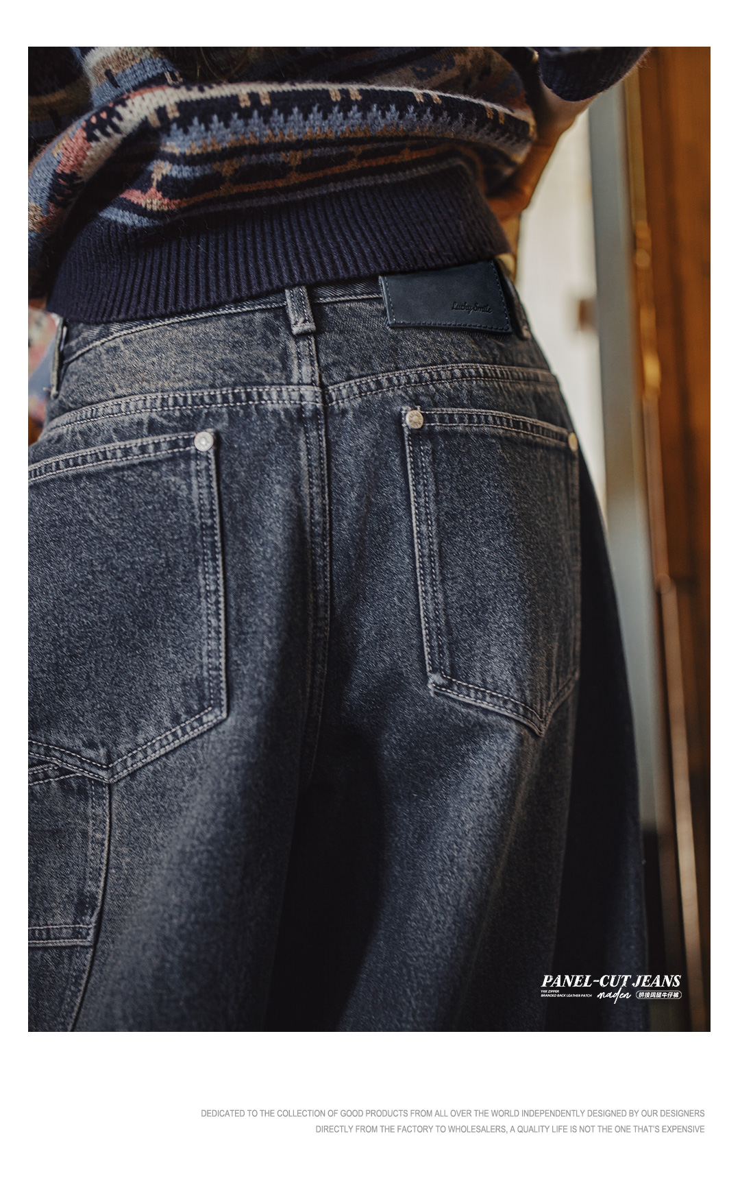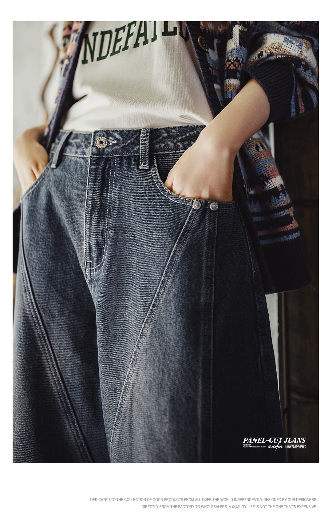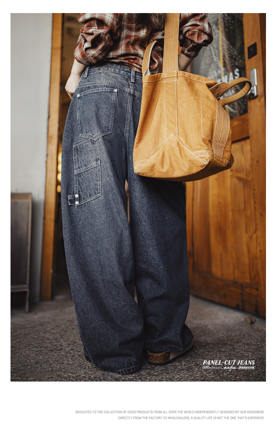 马登美式复古水洗拼接宽松阔腿显瘦香蕉镰弯刀工装牛仔裤子女士秋