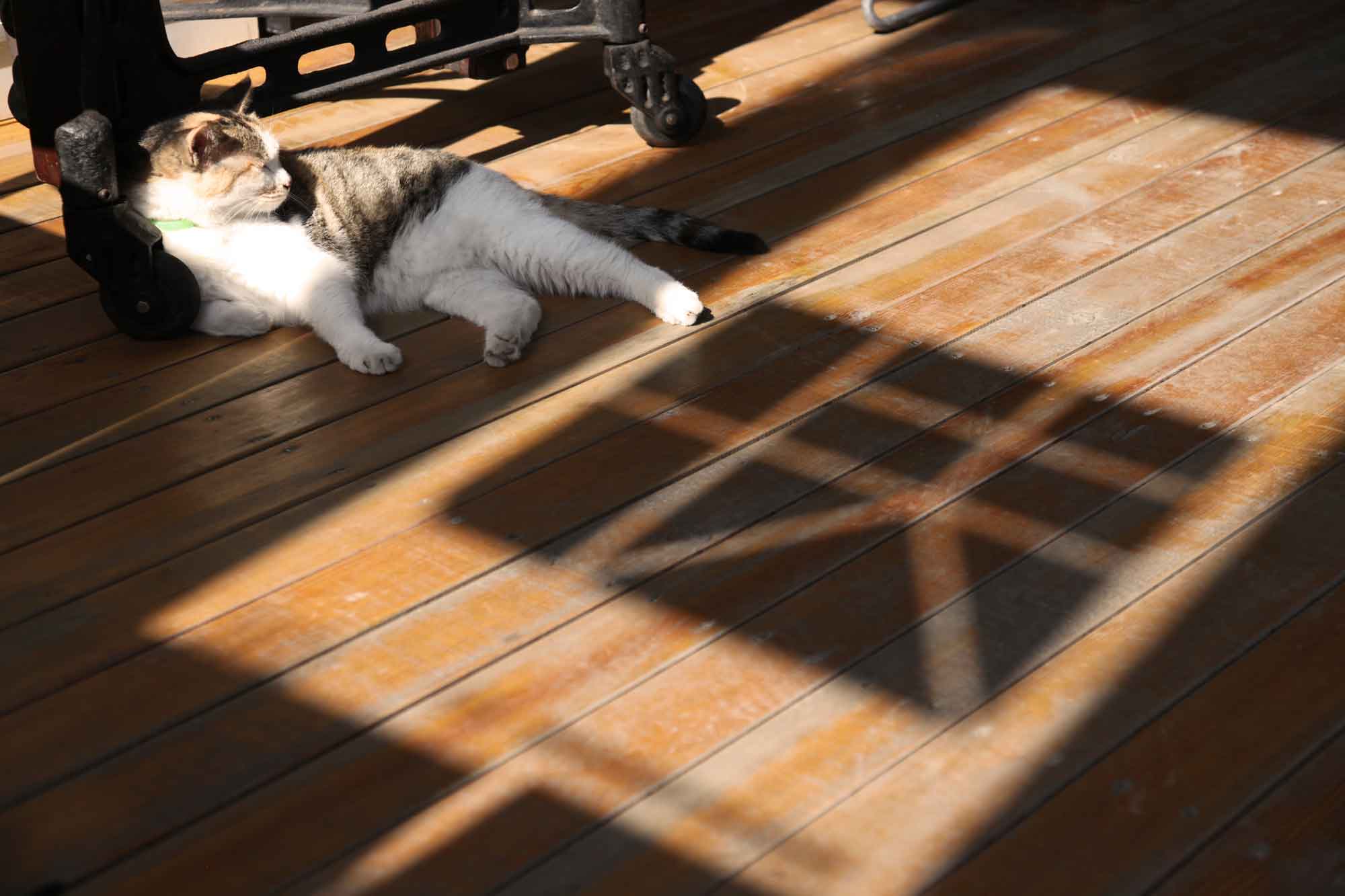 你站在画廊看风景,风景中有猫在画廊看着你。
