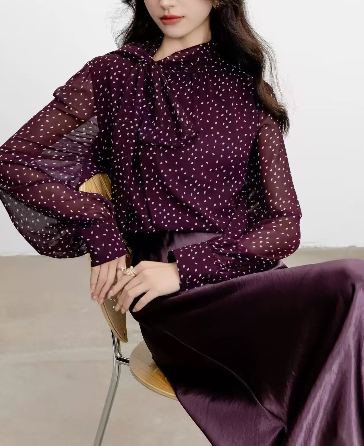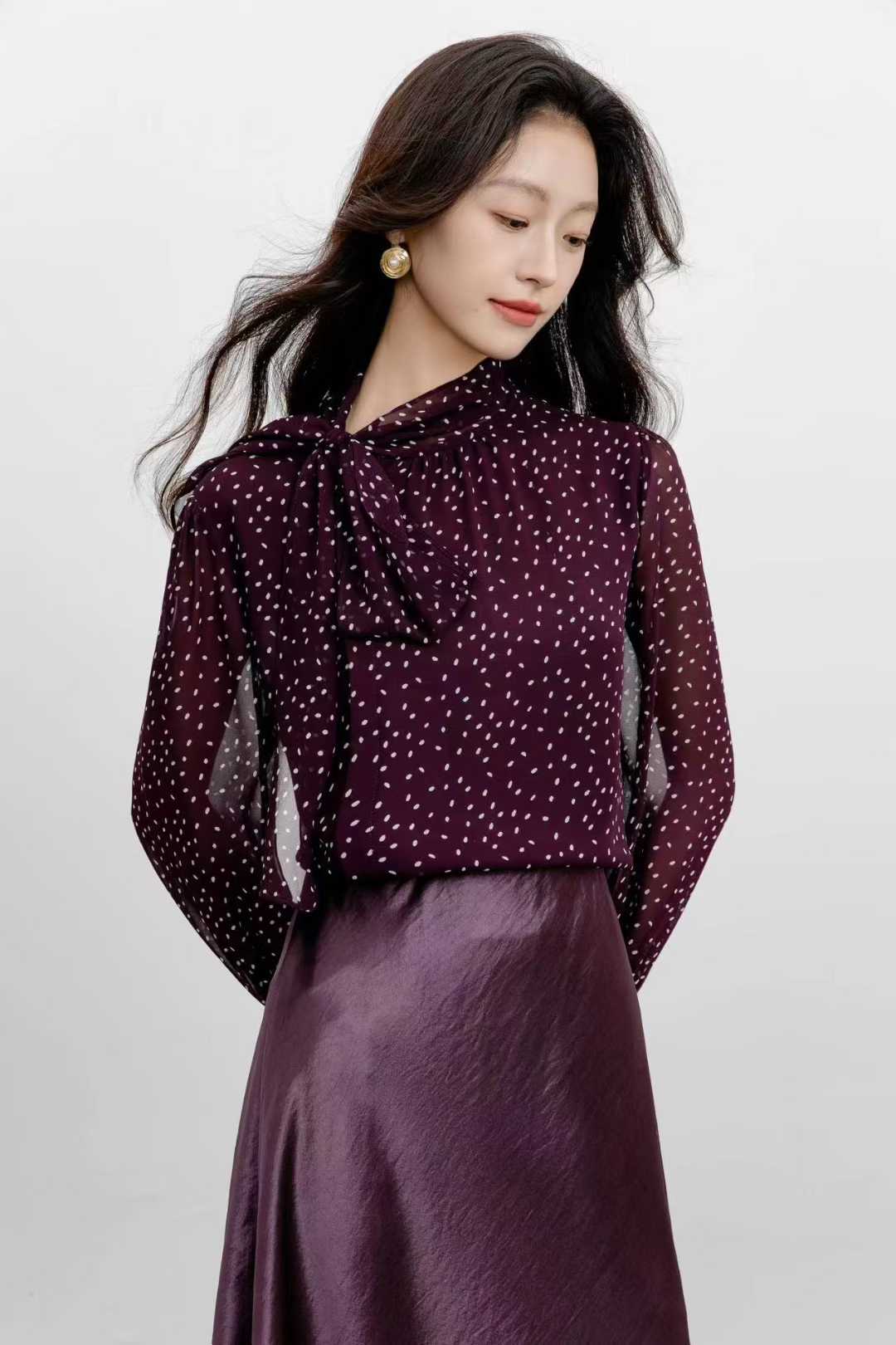 SZ3F53_魏紫色_衬衫_春秋_飘带蝴蝶结长袖波点印花垂感雪纺_高级女装_BERNIEELEN 伯妮斯茵