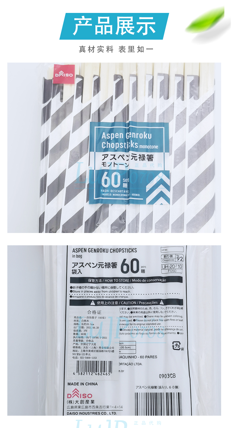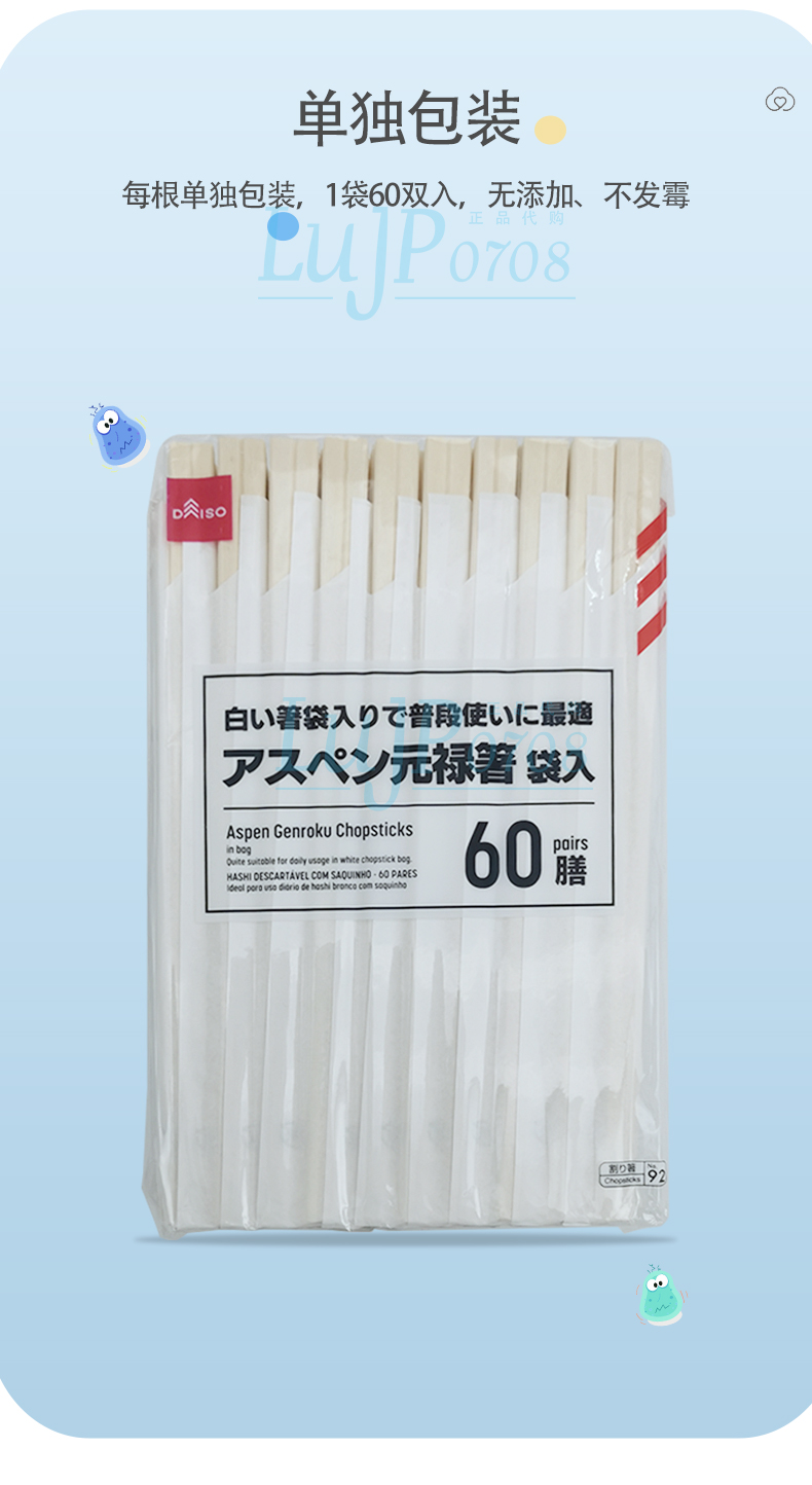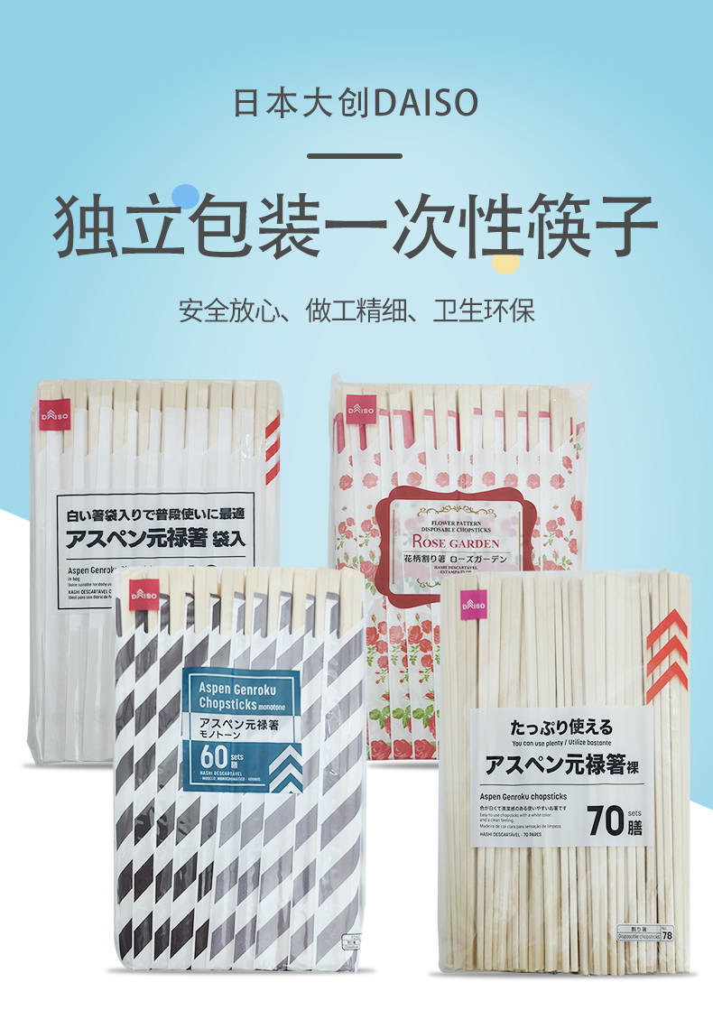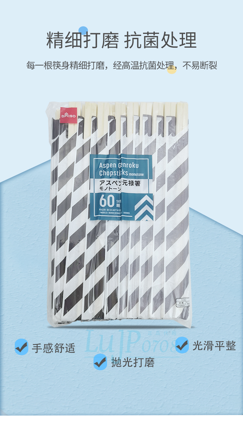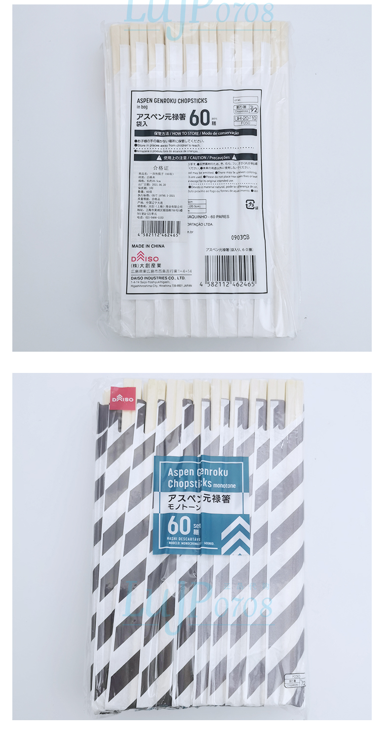 日本大创白杨木环保筷独立包装卫生筷灰白条纹60双/袋