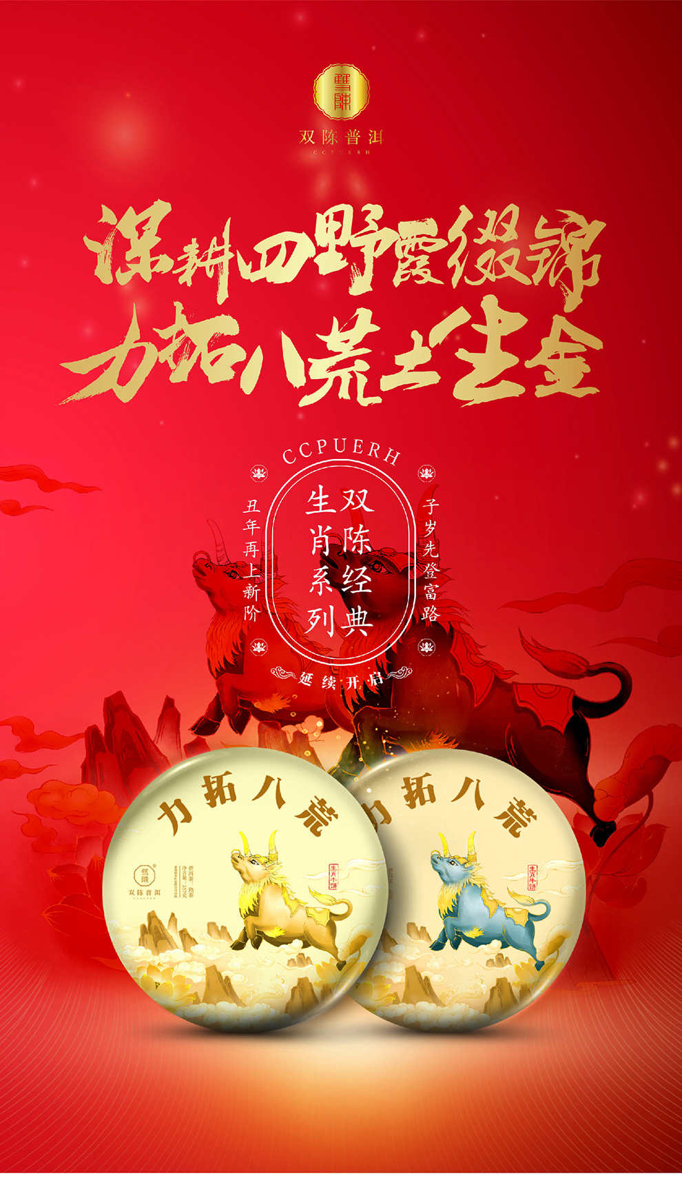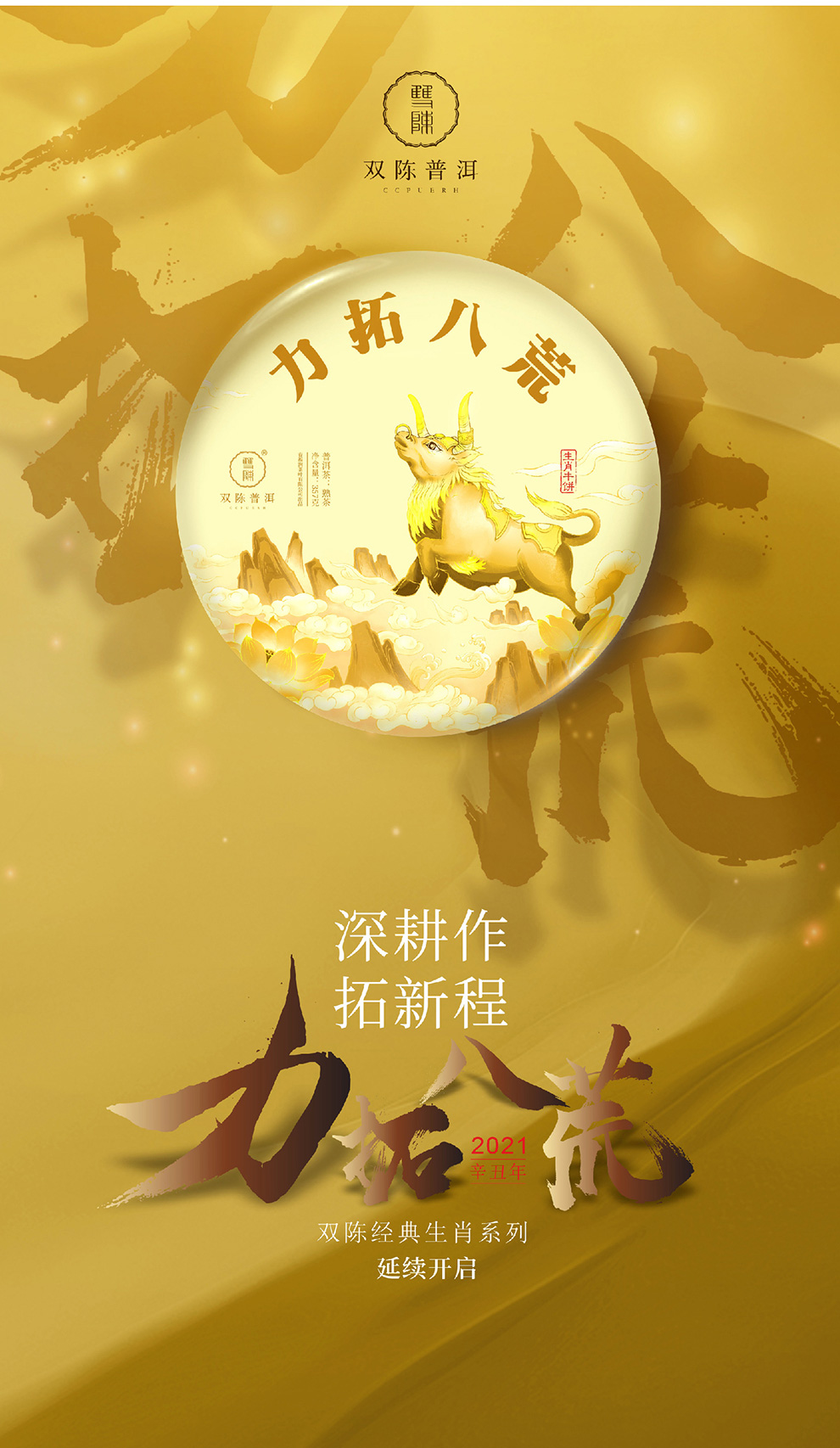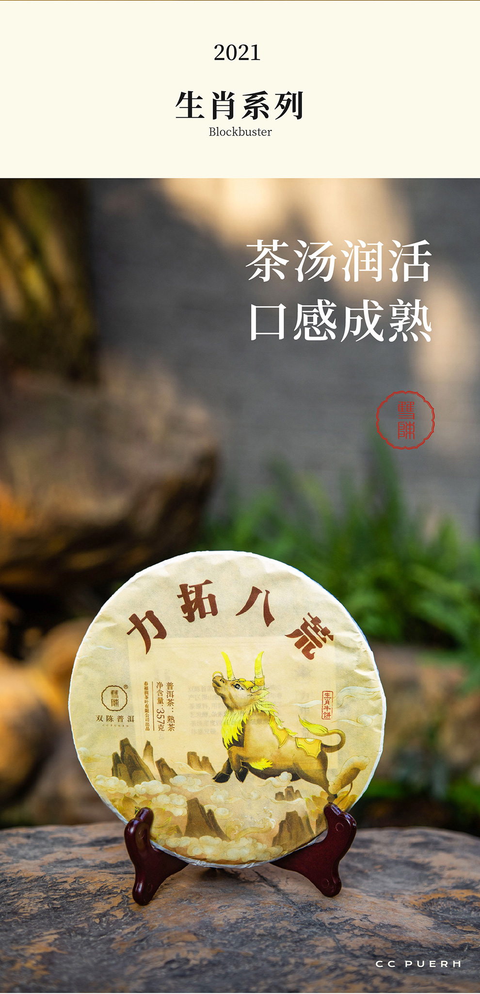 2021年生肖牛饼【力拓八荒】普洱茶熟茶茶饼1筒(7*357克)