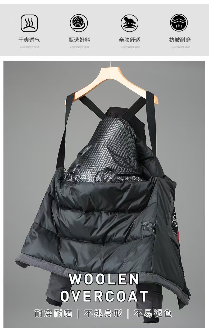 有筋骨的高端工装羽绒服,上身挺阔。