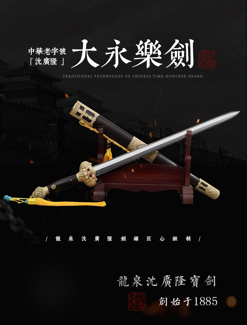 - 龙泉沈广隆剑舖创始于1885年(清光绪)位于浙江省龙泉市,是当地唯一一家“子承父业”一脉相承的中华老字号宝剑生产企业,是国家级非物质文化遗产龙泉宝剑项目保护单位,并以“天下第一剑”闻名于海内外....