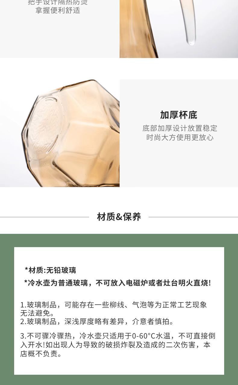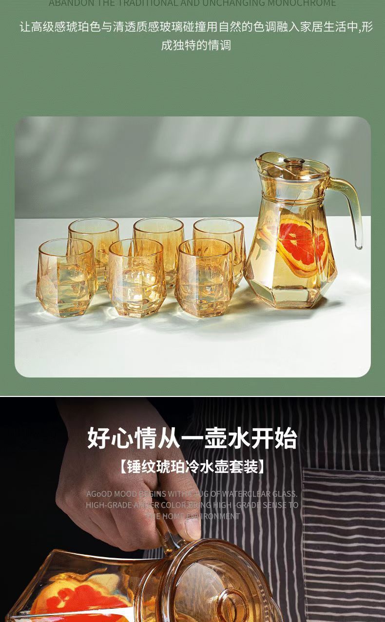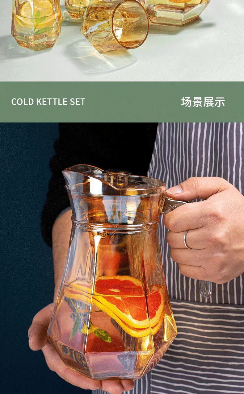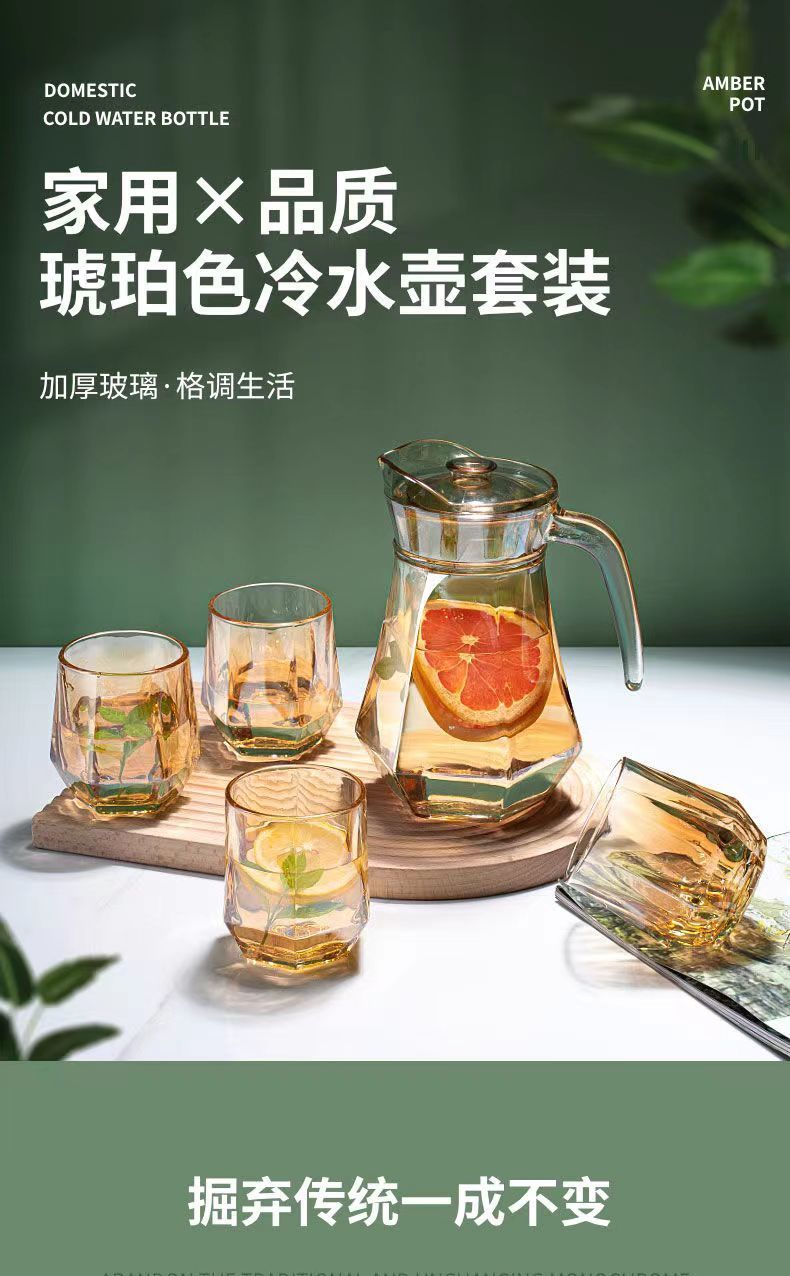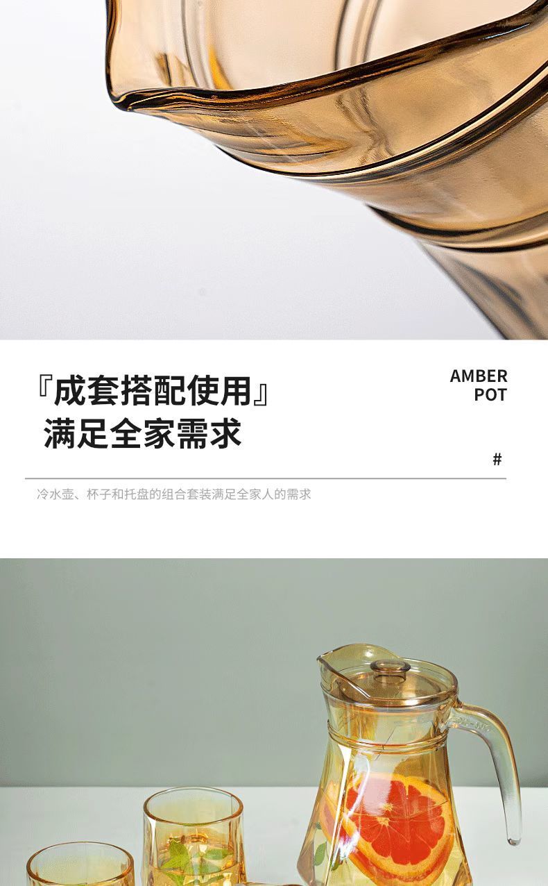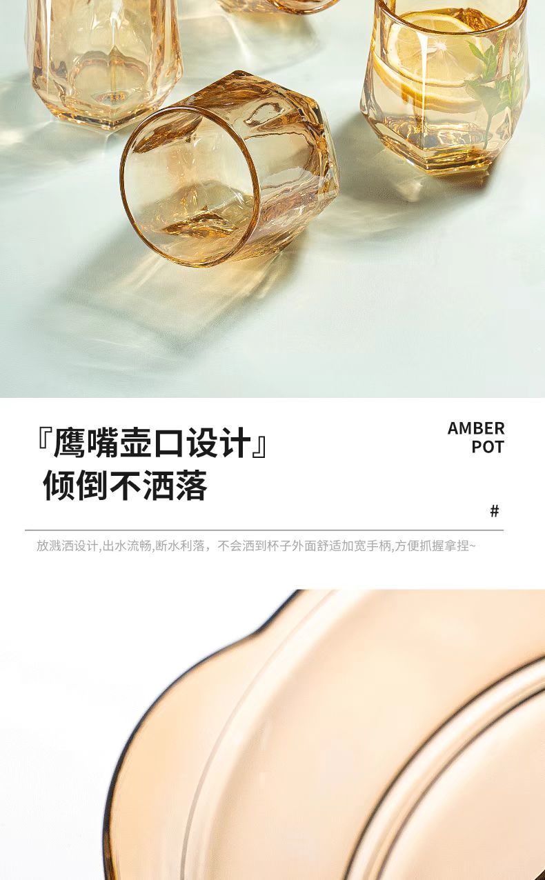 【六棱琥珀壶+4只琥珀杯】钻石玻璃六棱壶客厅家用水壶大容量加厚水杯冷水壶琥珀透明水具