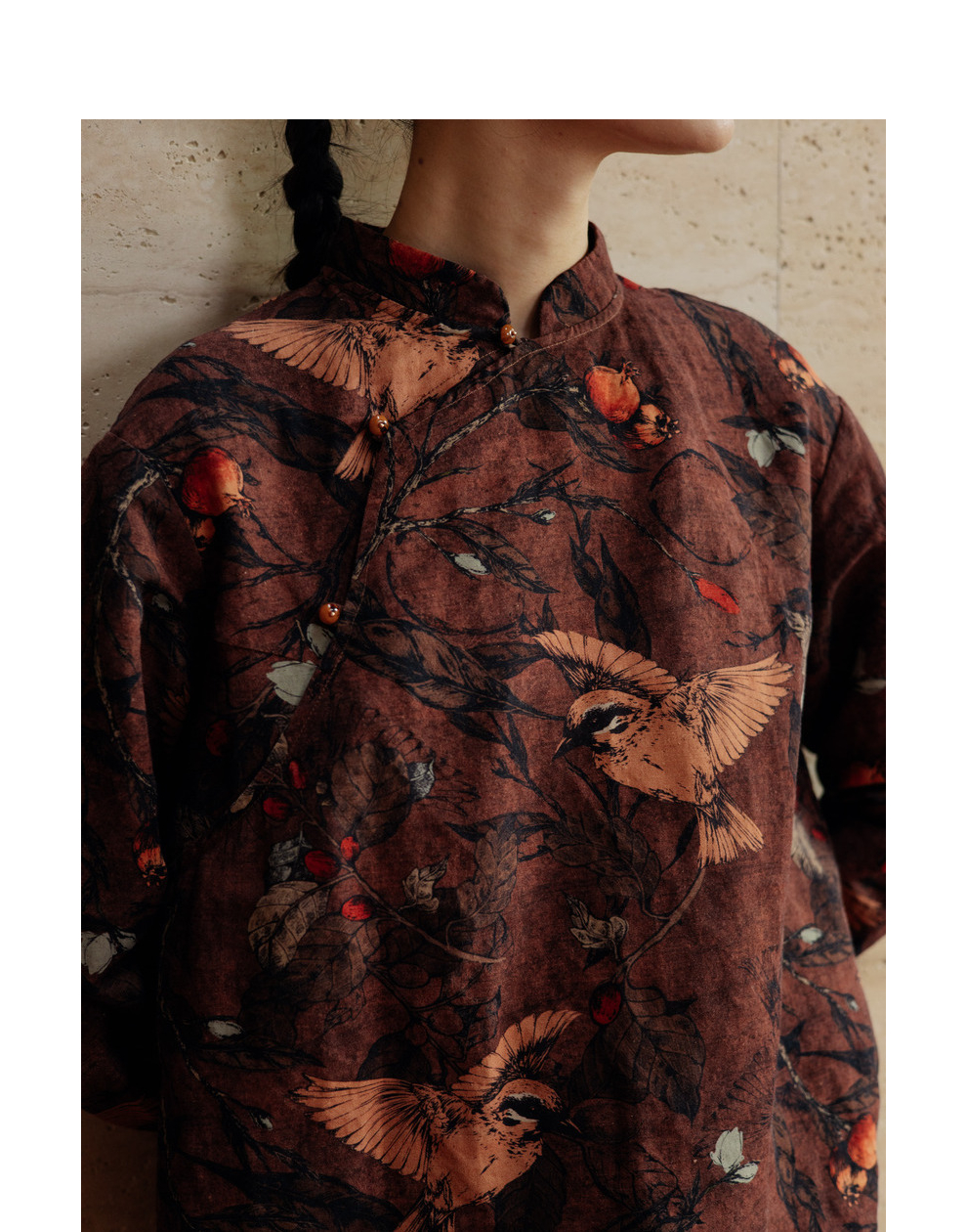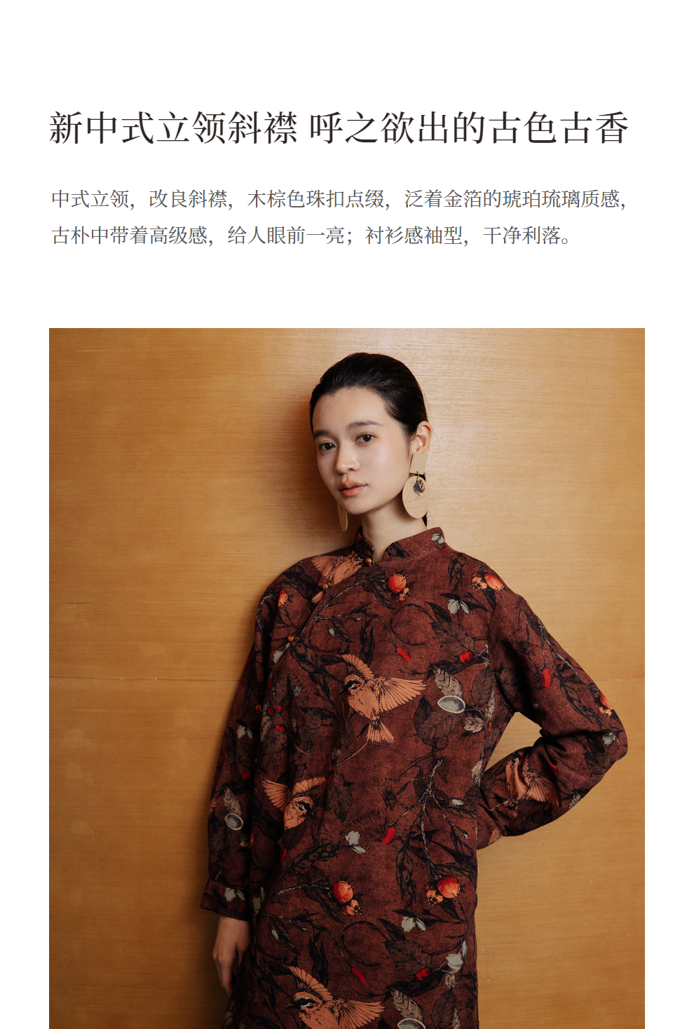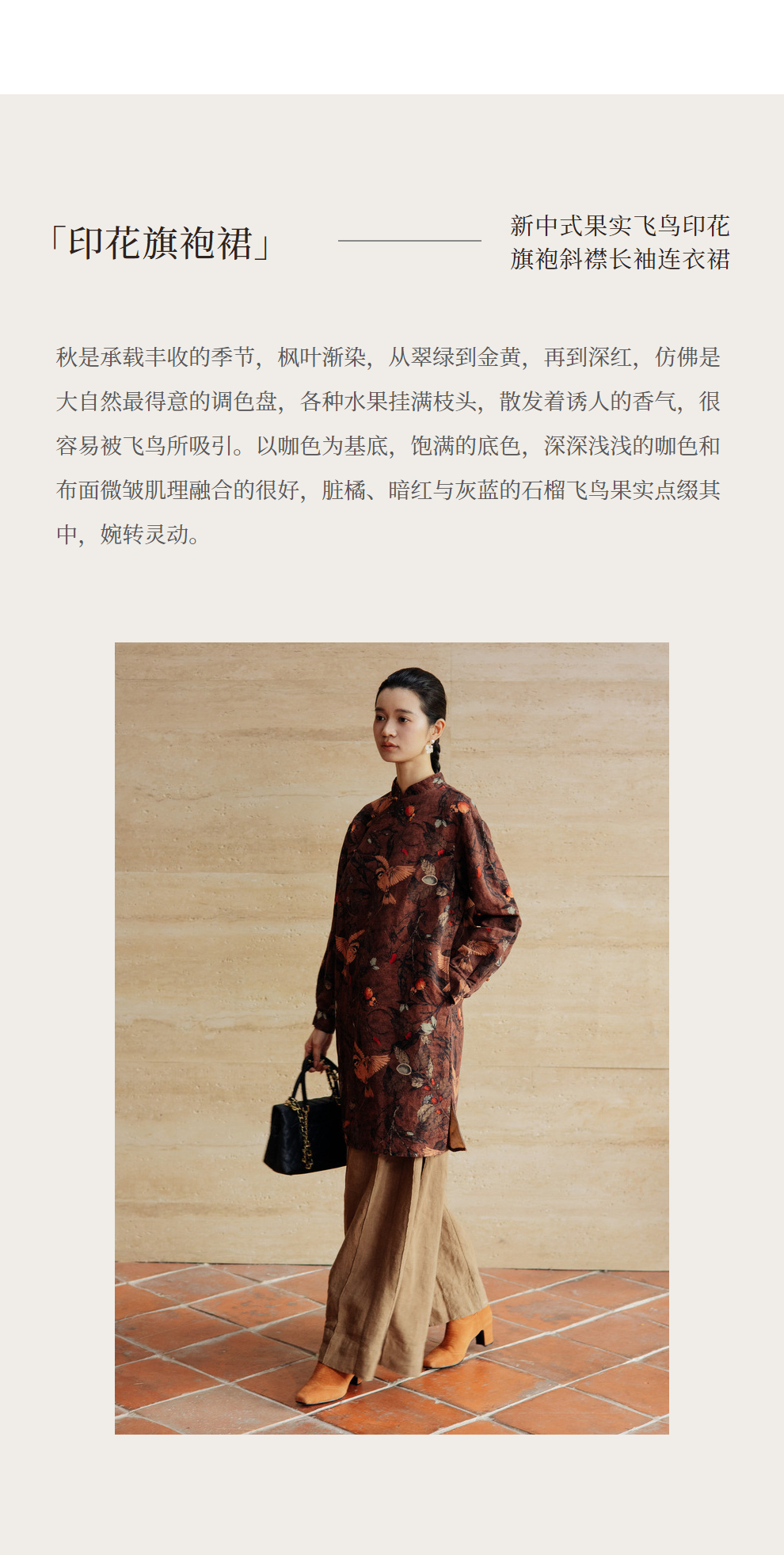 绽放旅行女装740朵/新中式果实飞鸟印花旗袍斜襟短款长袖连衣裙