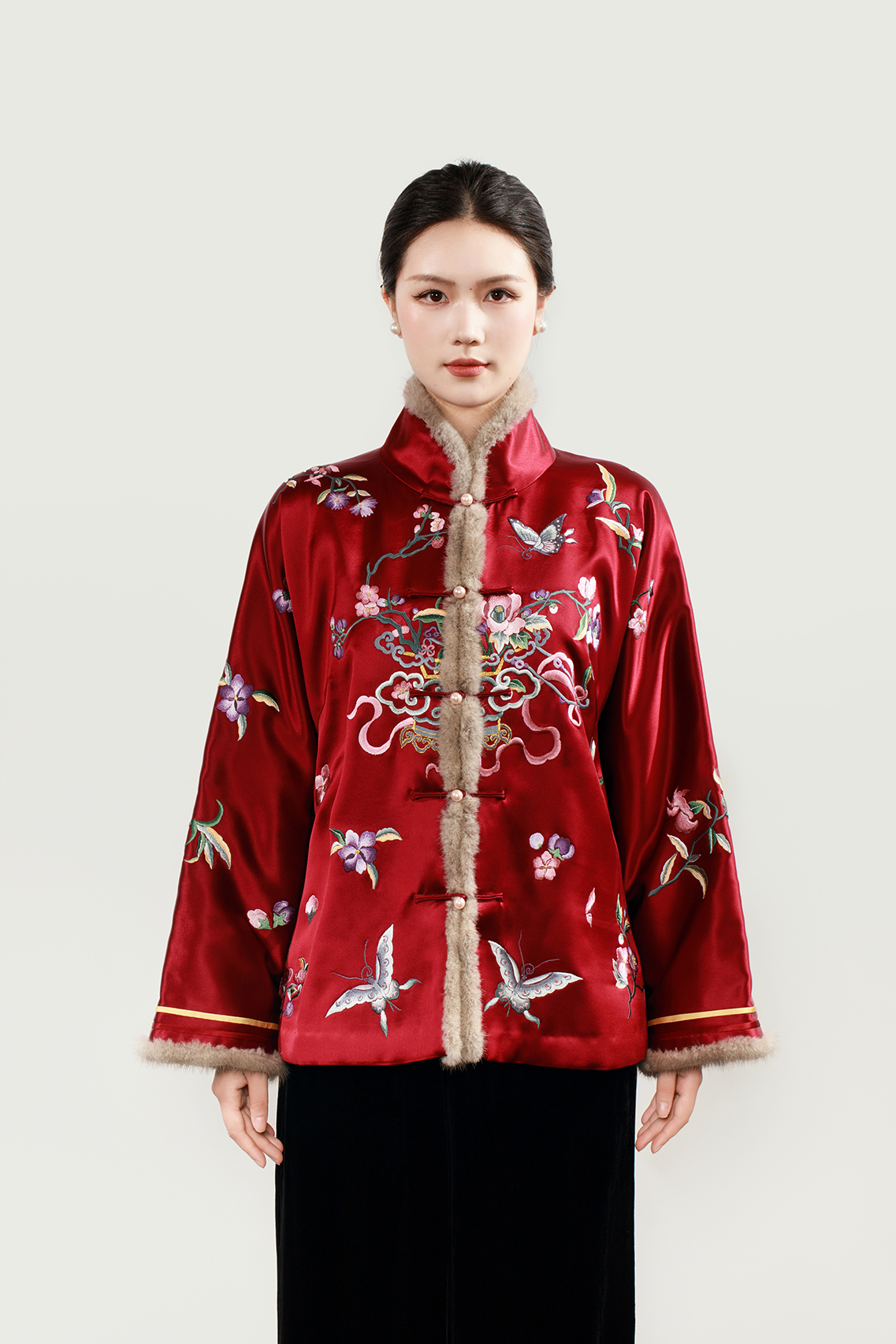 盛唐牡丹大师系列 | 真丝手推绣水貂花篮吉服棉袄(盛唐牡丹与非遗传承人王小潇联名系列)