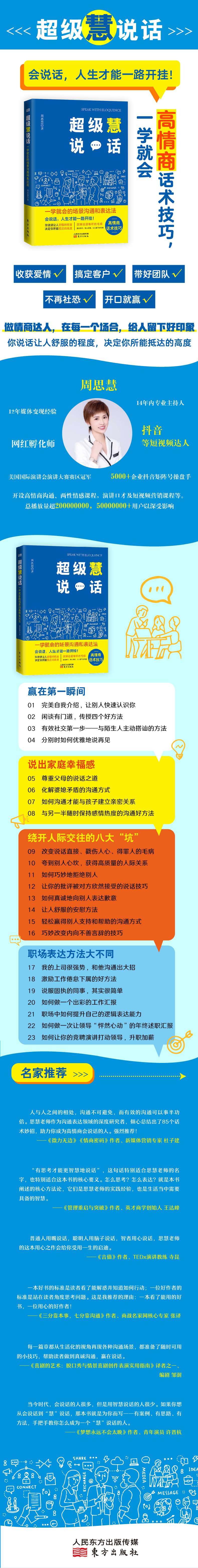 人与人之间的相处,沟通不可避免,而有效的沟通可以事半功倍。思慧老师作为沟通表达领域的深度研究者,倾心总结出了85个话术妙招,助力你成为高情商会说话的人。强烈推荐!
