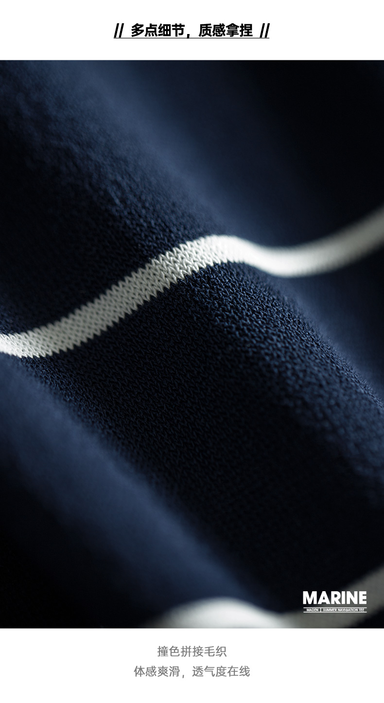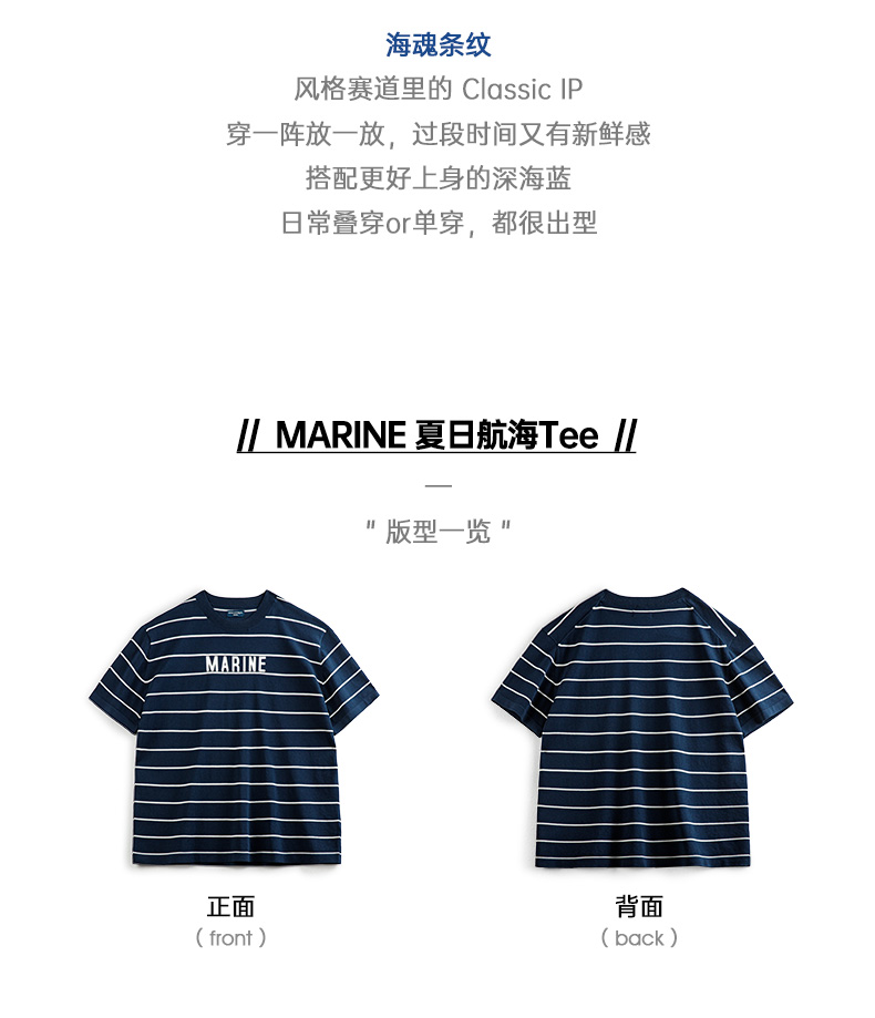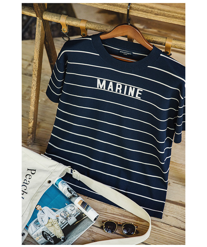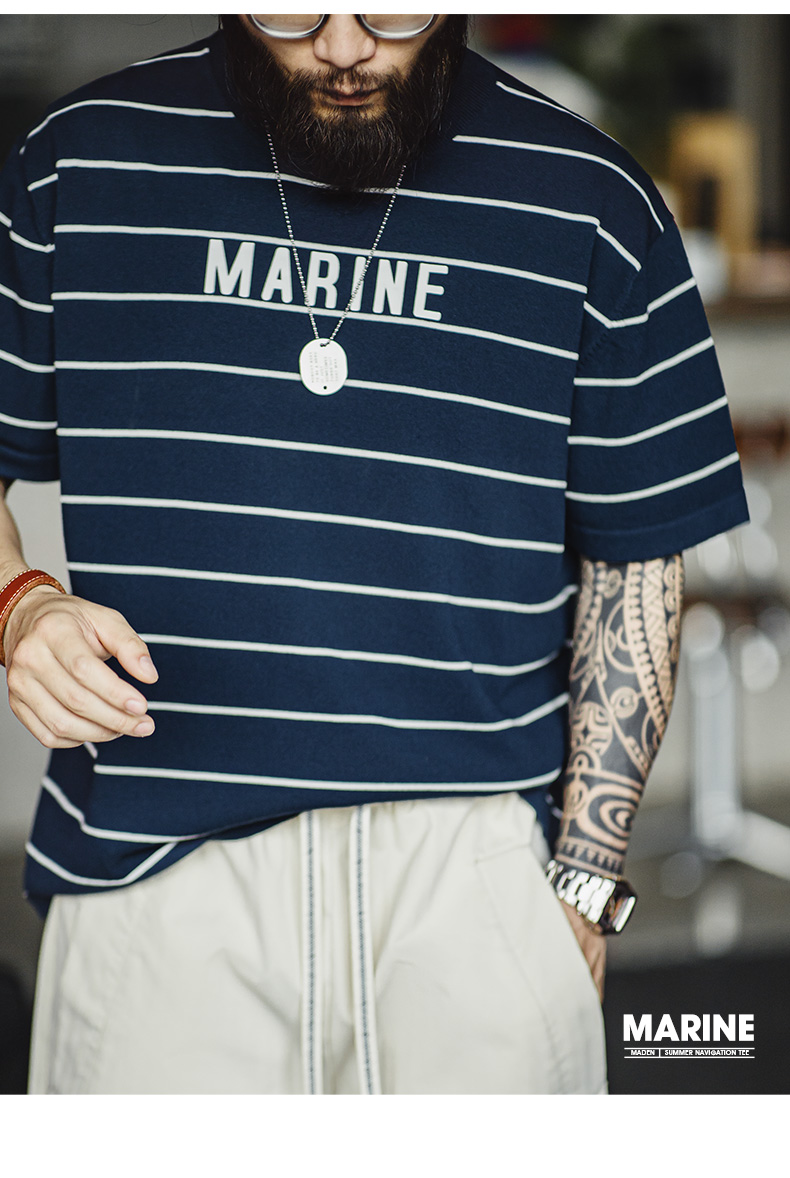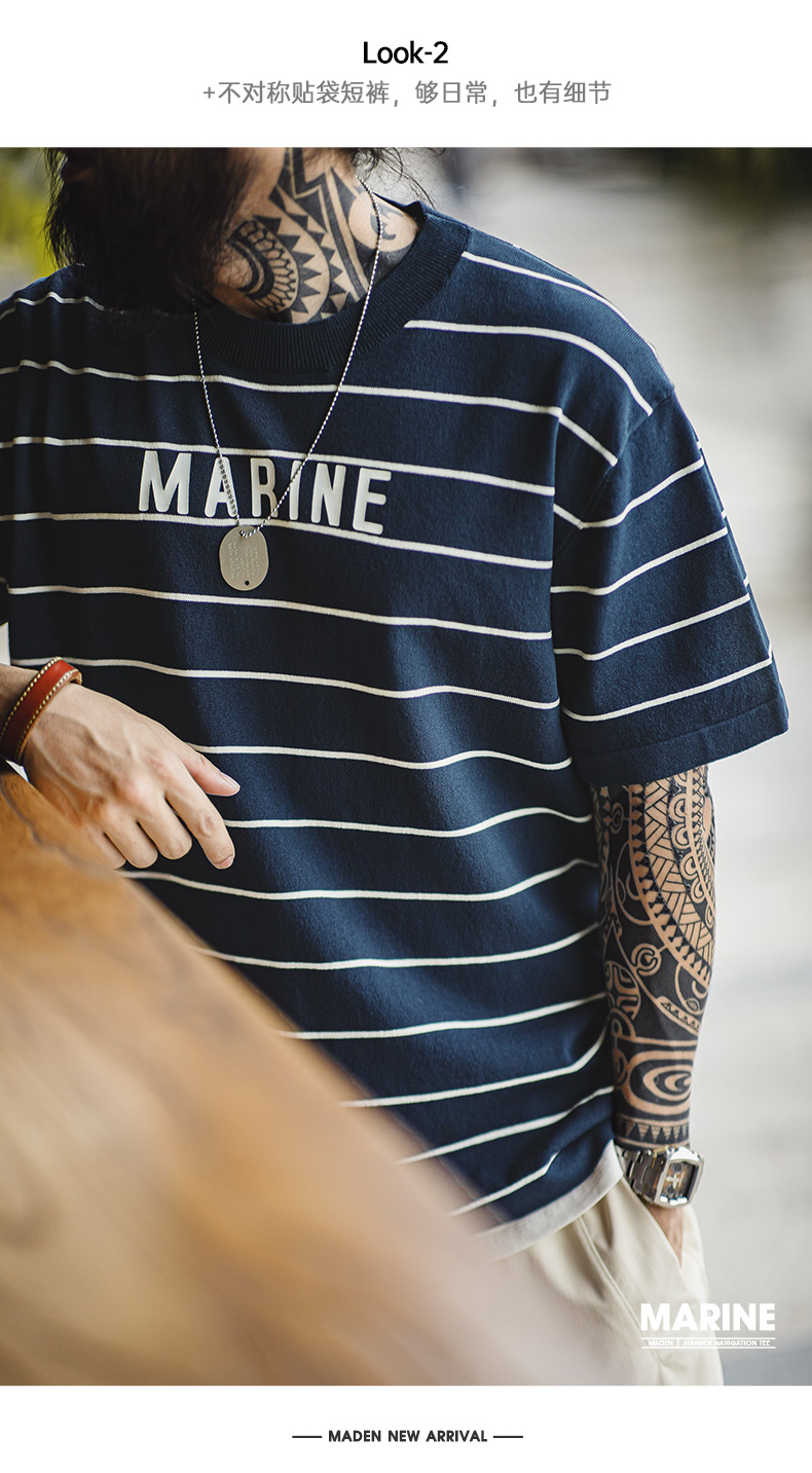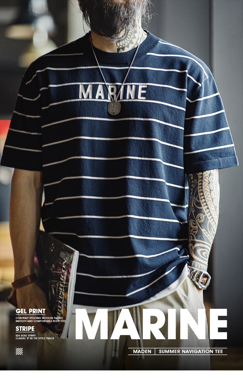 马登工装 美式复古撞色条纹短袖T恤字母印花半袖海魂衫体恤男夏季