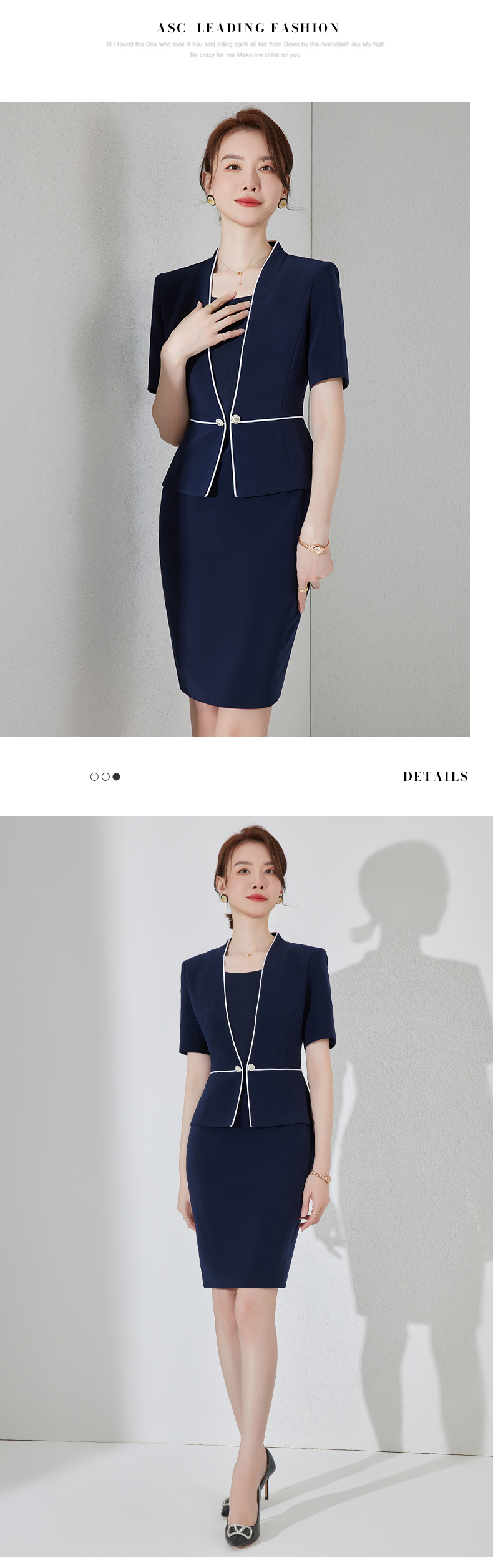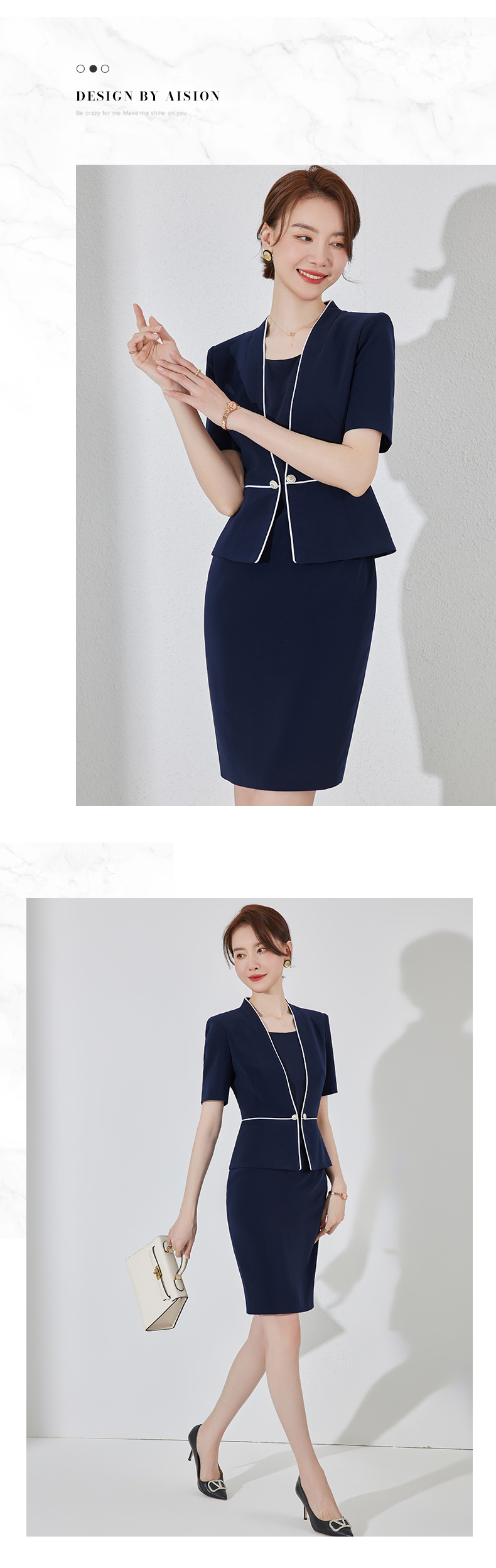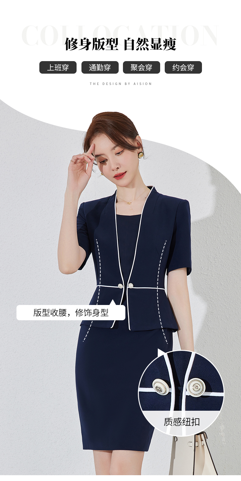藏青色假两件连衣裙女夏职业装高端案场客服工作服通勤套装包臀裙