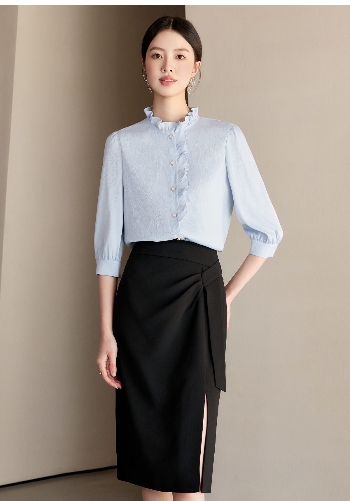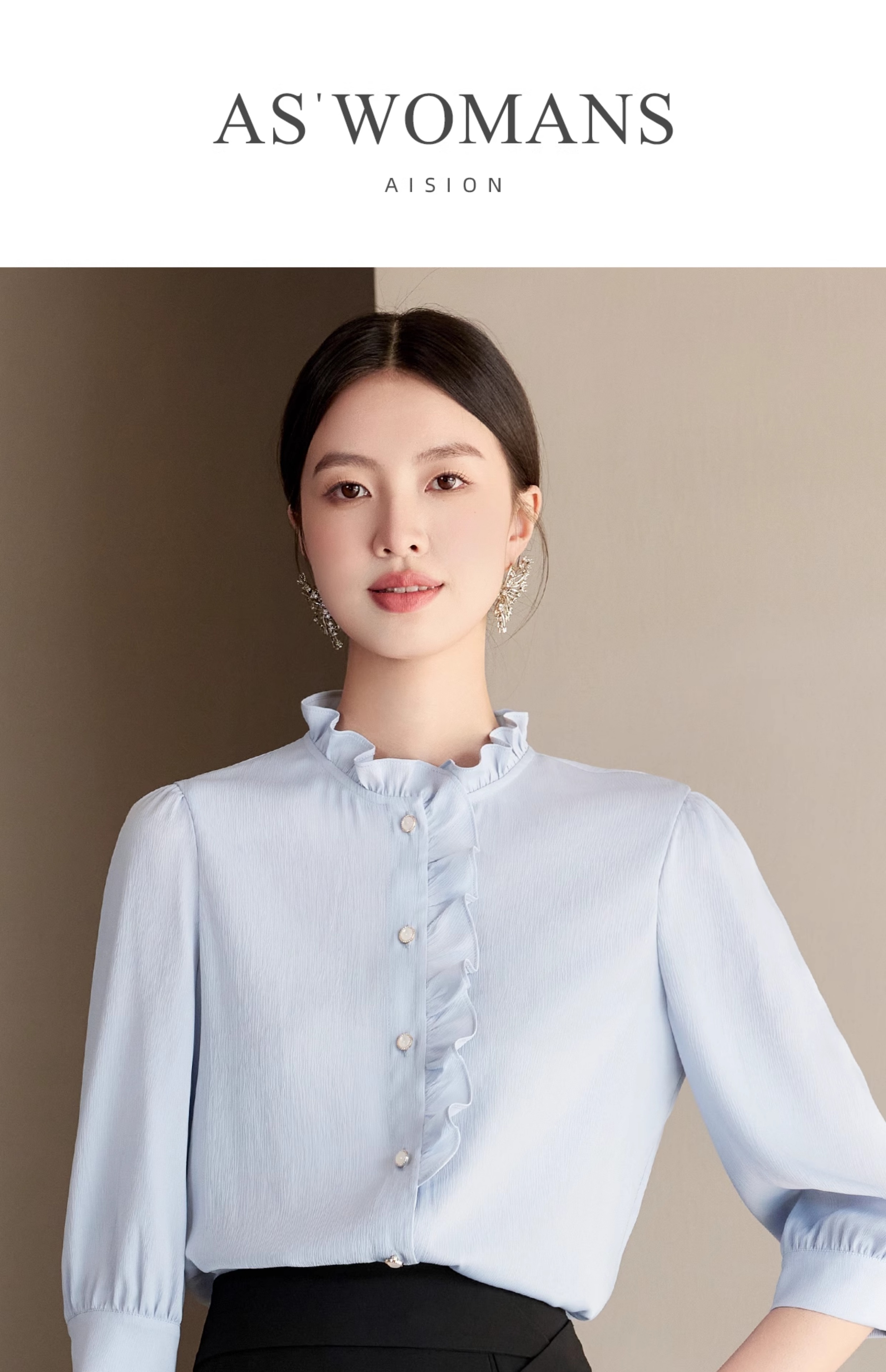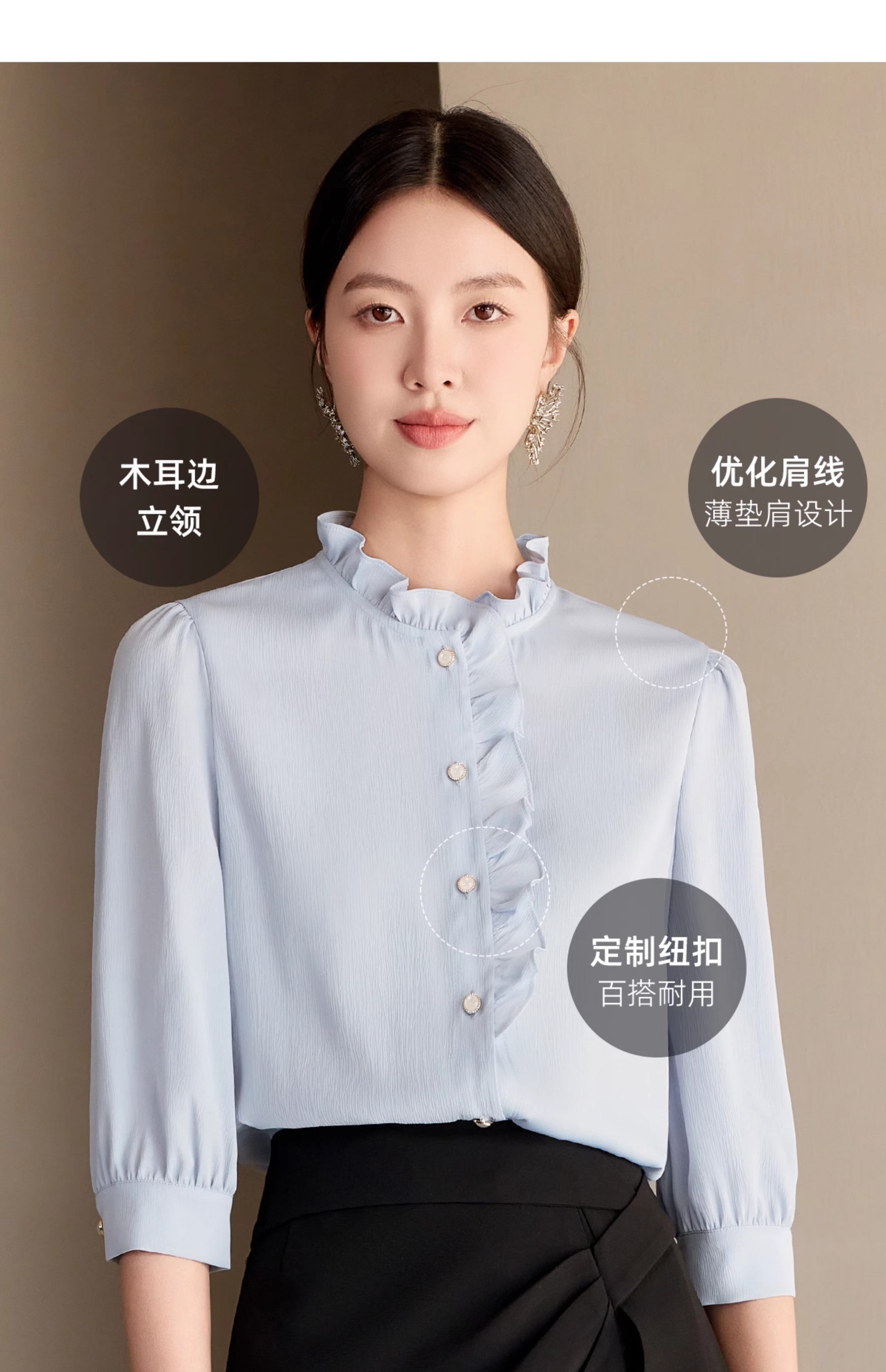艾尚臣木耳边衬衫女2025夏新款七分袖纯色上衣高级感减龄洋气衬衣