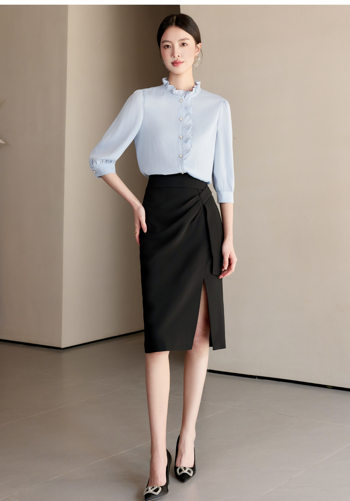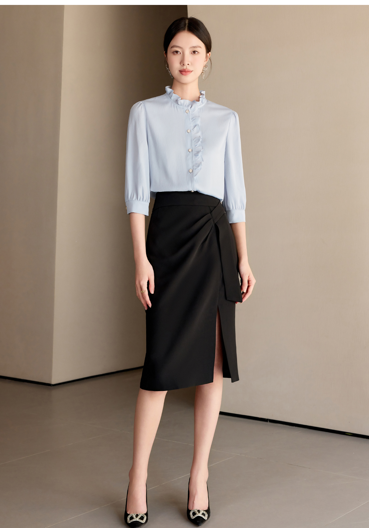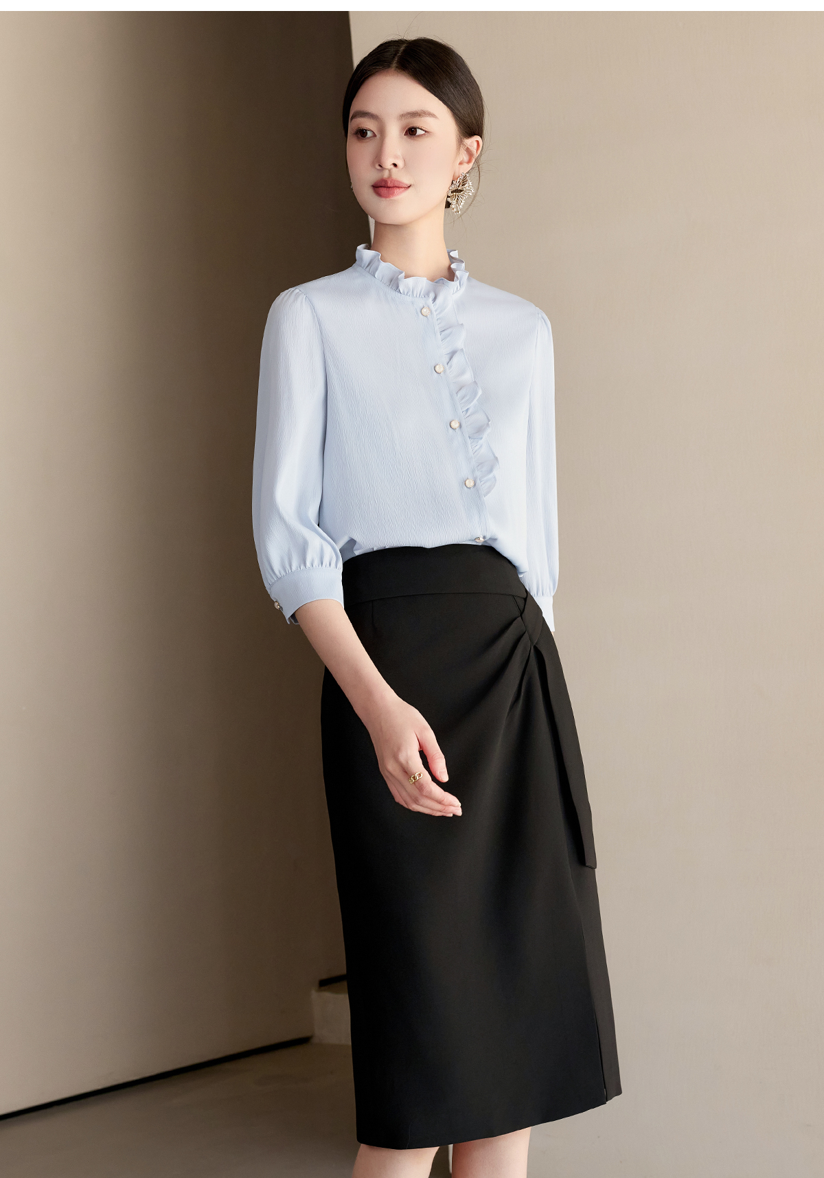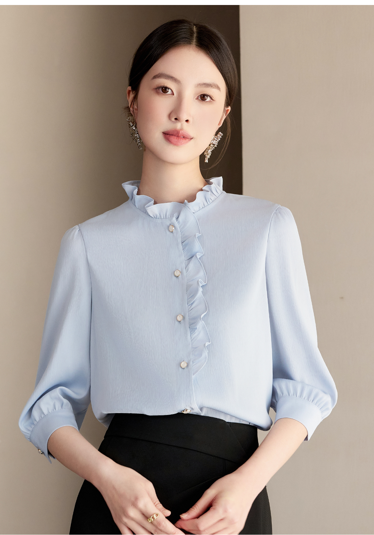 艾尚臣木耳边衬衫女2025夏新款七分袖纯色上衣高级感减龄洋气衬衣