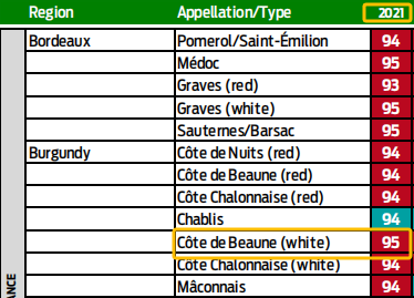 勃艮第的此年份是一个经典低产年份,葡萄酒酸度、新鲜度和平衡度非常棒,结构和陈年潜力突出。《葡萄酒爱好者》(Wine Enthusiast)给予这一年的伯恩丘干白整体 95 分好评。