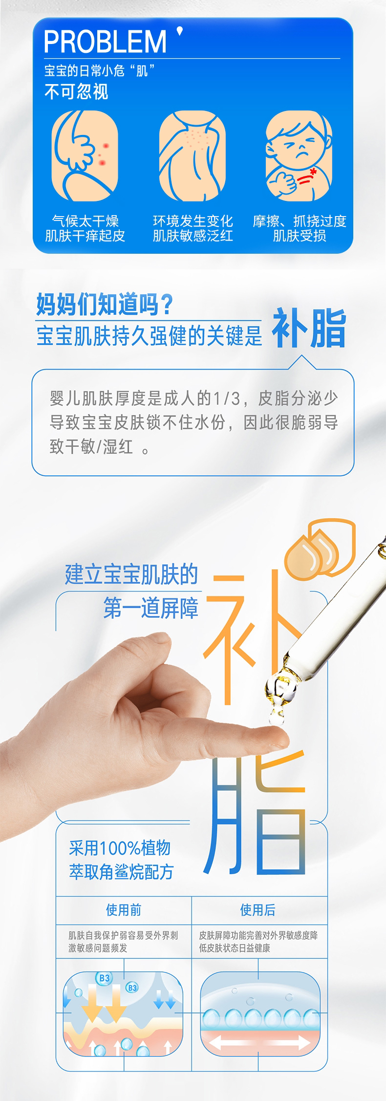 保湿重要补脂才是关键,角鲨烷为接近人体皮脂的一种脂类,亲和力强能够与人类自身的皮脂膜融为一体,在皮肤表层形成一层天然的屏障。