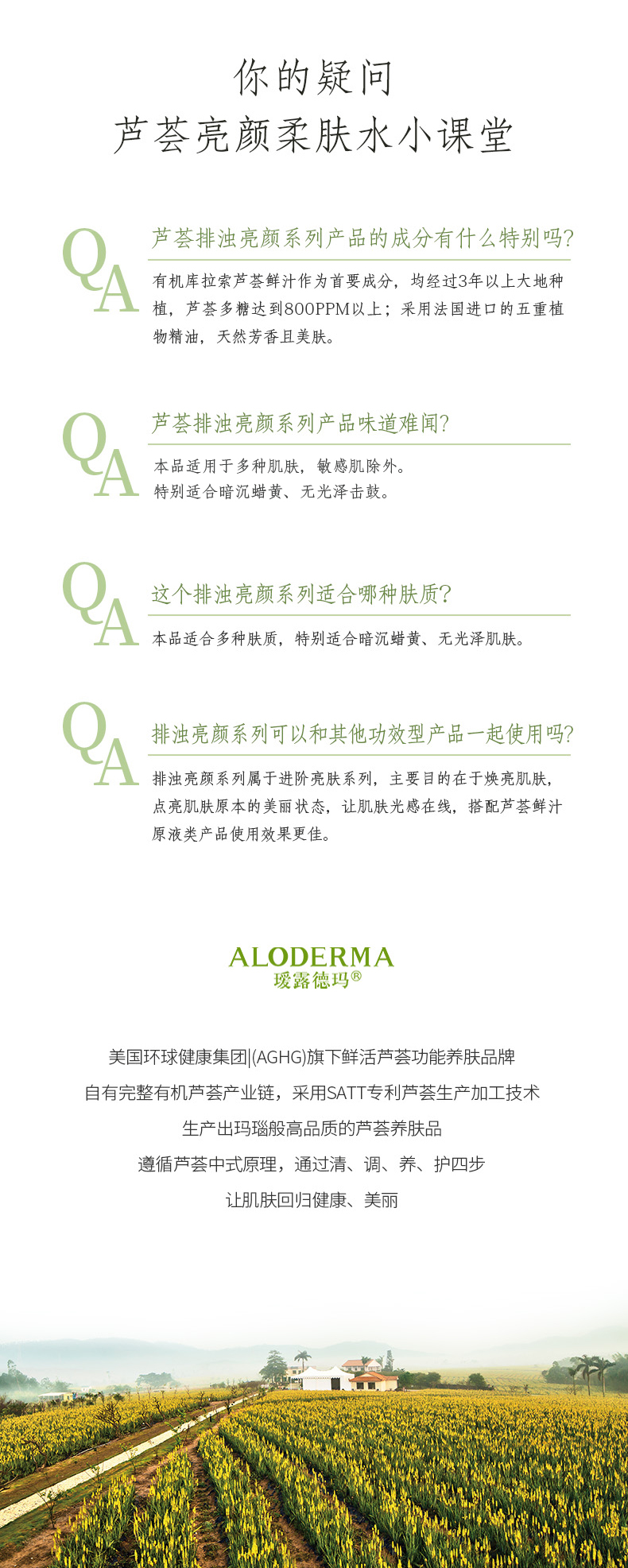 瑷露德玛是美国环球健康集团全资子公司台山美环健芦荟制品有限公司旗下的芦荟护肤品牌,我们产品均采用SATT独家专利技术生产,纯新鲜,不添加水,不添加芦荟冻干粉,不添加防腐剂。鲜纯芦荟,自然更美。