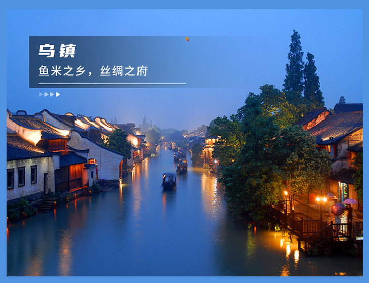 -下午|适时前往乌镇,预计在黄昏时到达,小桥流水人家、夕阳西下,淳朴秀美的江南水乡风景,绝对让您流连忘返。乌镇迷人的夜景,让你仿佛回到了古代,蓦然回首、那人却在灯火阑珊处!