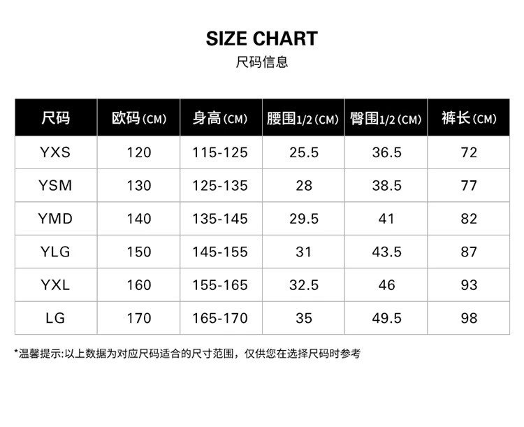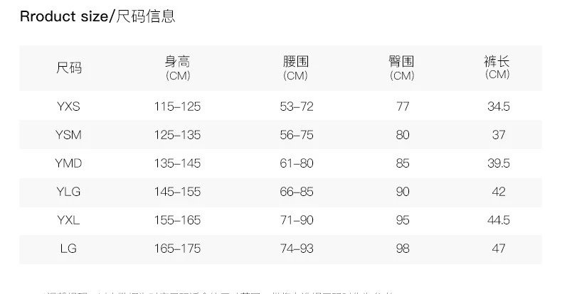 尺码:YSM(125-135)\YMD(135-145)\YLG(145-155)\YXL(155-165)\LG(175-185)