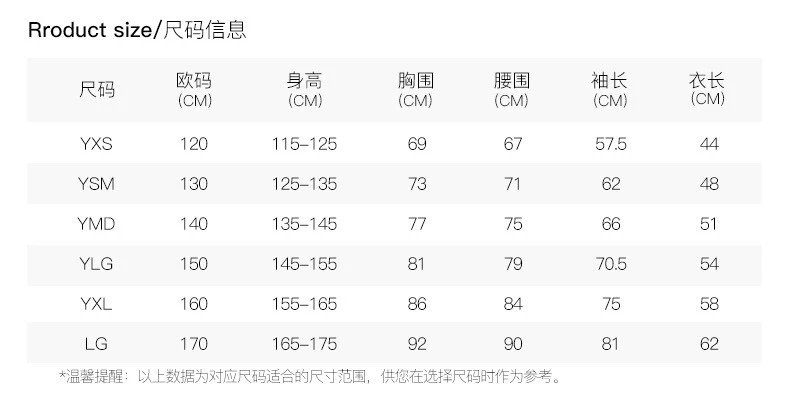 尺码:YSM(130)\YMD(140)\YLG(150)\YXL(160)\LG(170)