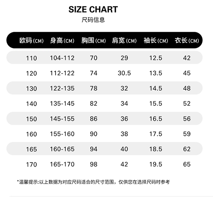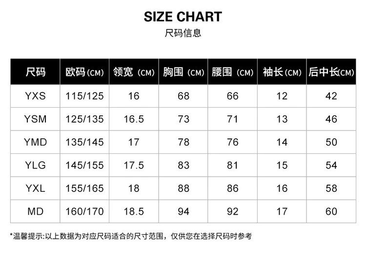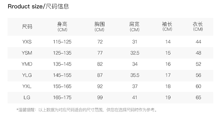 尺码:YSM(125-135)\YMD(135-145)\YLG(145-155)\YXL(155-165)\MD(160-170)