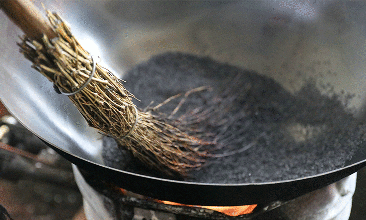 再经过大火快速翻炒,炒至用手一捻,芝麻就噼里啪啦的爆开,香气弥漫;这样做成饼后吃着满口酥脆,口感绝妙不已。