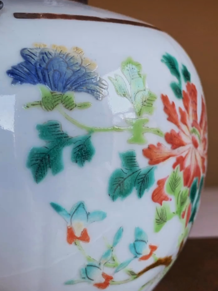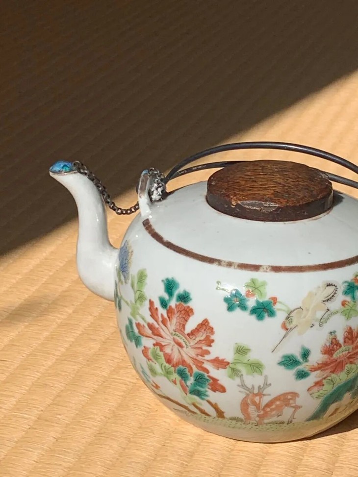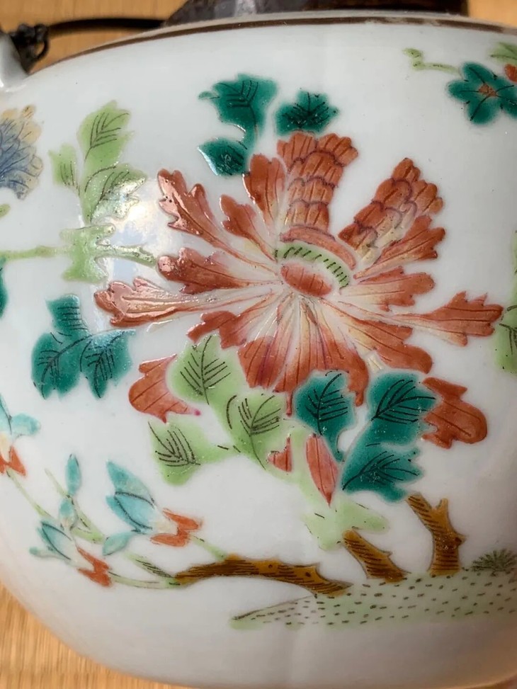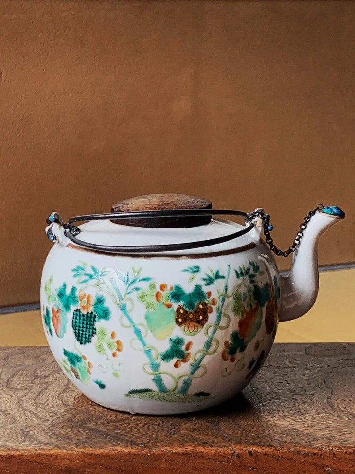 此粉彩绘花果纹烧蓝银把茶壶胎釉细致,造型规整,粉彩色泽明亮艳丽、绘画典雅,整体贵气却不落俗套,是传承景德镇御窑厂技艺烧制的瓷器精品。此茶壶是一位日本老华侨家族典藏多年的藏品。