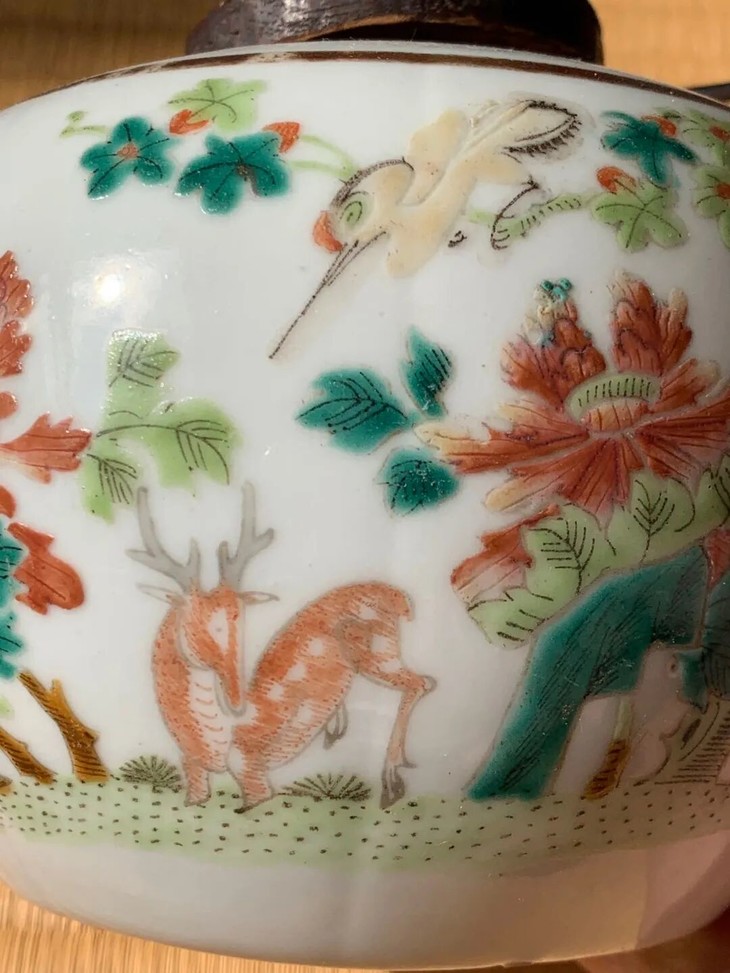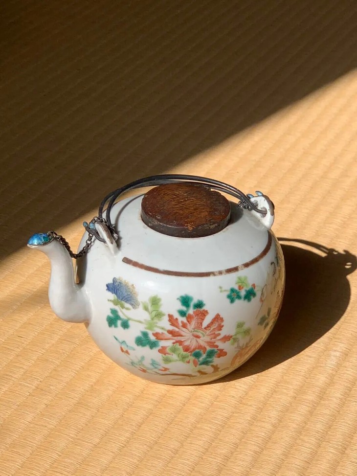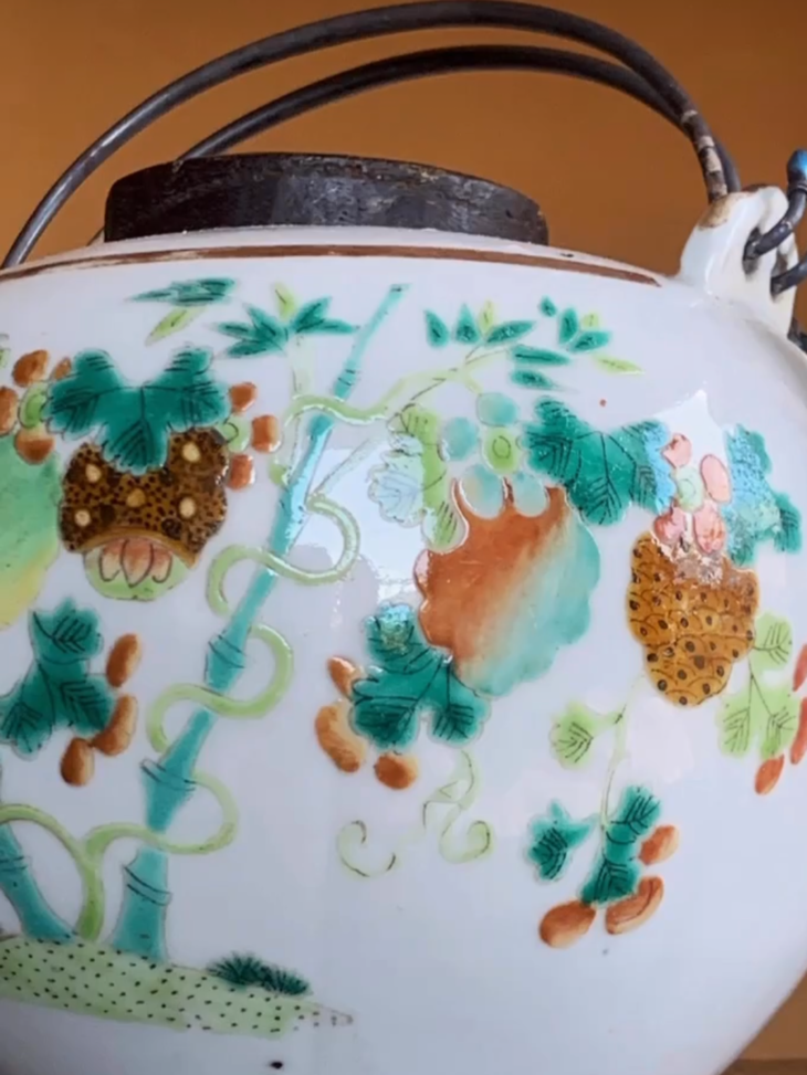 这是一件烧制于景德镇的粉彩绘花果纹的瓜棱壶身细壶流的茶壶,搭配烧珐琅纯银提梁把的精緻老茶壶或是酒壶,以景德镇御窑厂特别擅长的白瓷烧造工艺,烧制出白釉瓜棱深细壶流的优雅器型,釉上绘典雅细緻的花卉、仙鹤、梅花鹿、与各类瓜藤蔬果等吉祥纹饰,鲜艳的各色粉彩颜料绘画生动流畅,平底保留一圈小支钉痕,瓷胎薄、质地洁净细白,仍然保留老烧珐琅点缀的纯银提梁把手以及木盖,是一件景德镇为王公贵族烧制的高端实用瓷器,整体形式优雅、纹饰华丽貴氣。