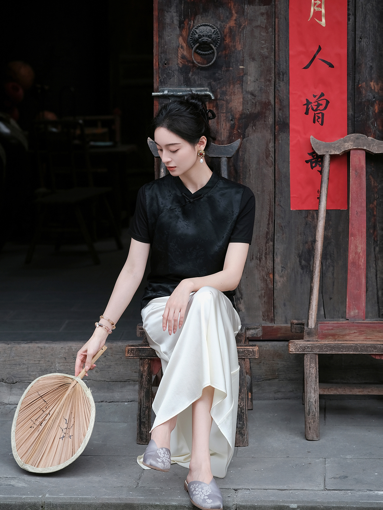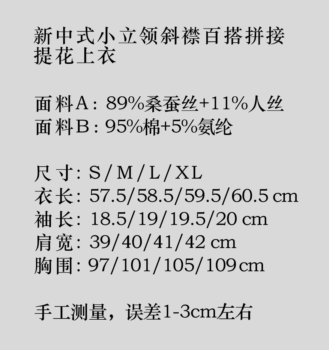 盛唐婧| 新中式小立领斜襟百搭拼接提花上衣-黑色