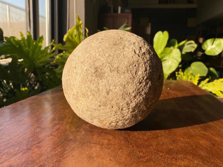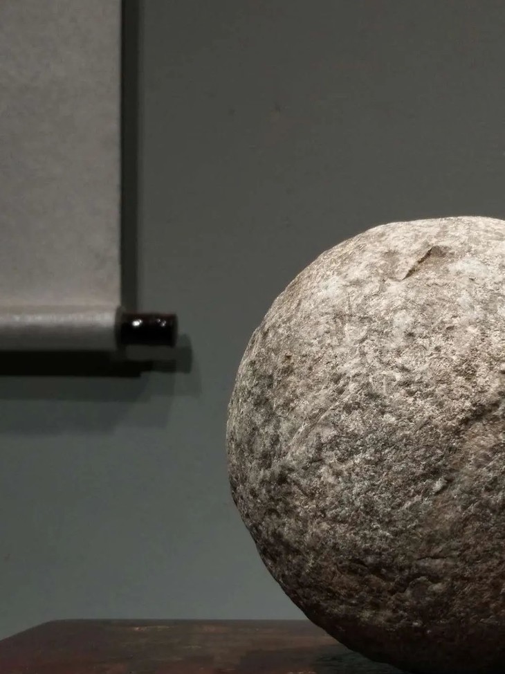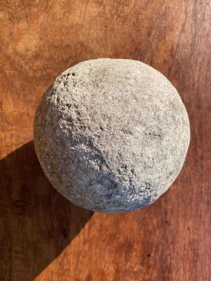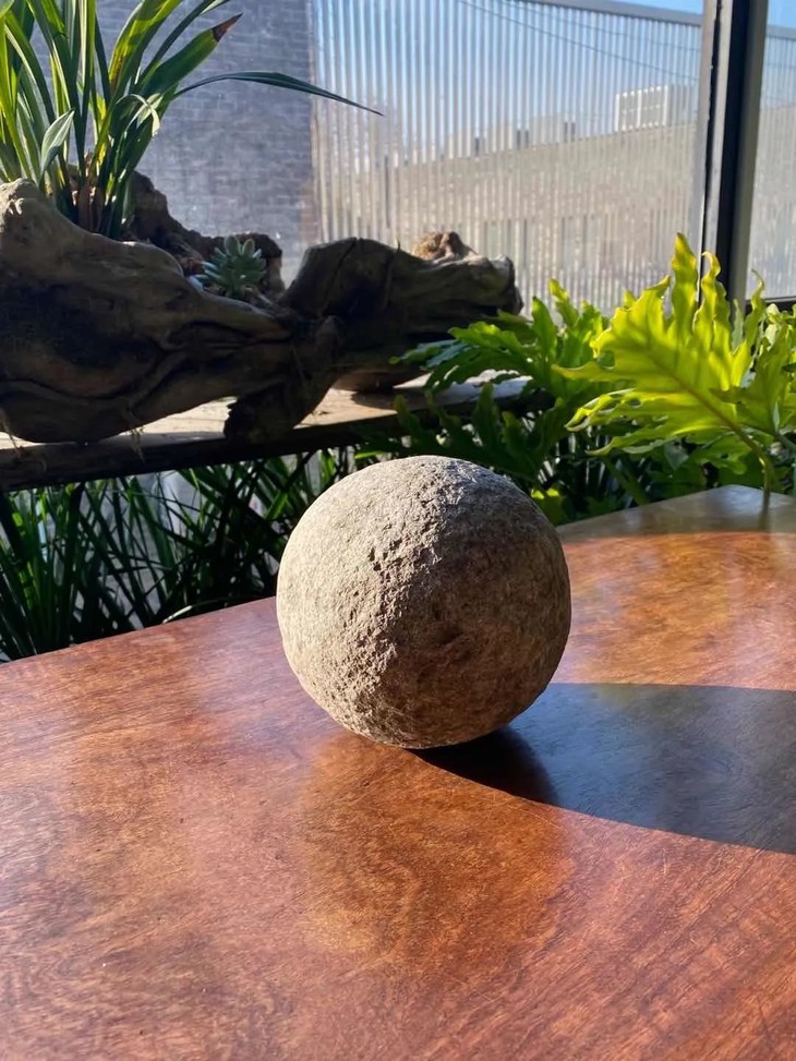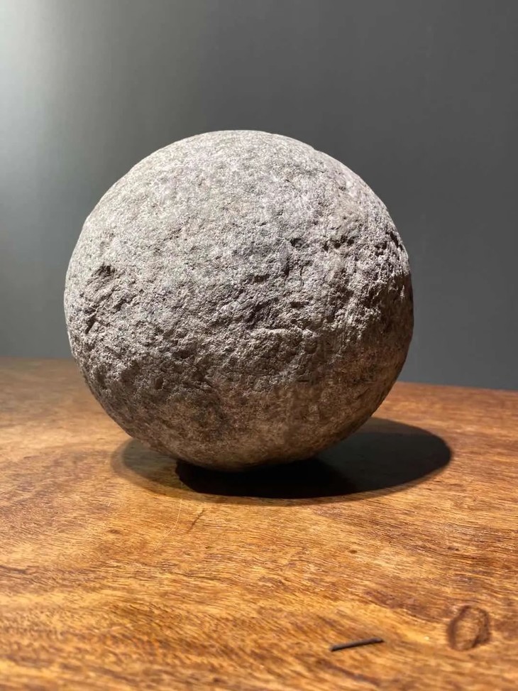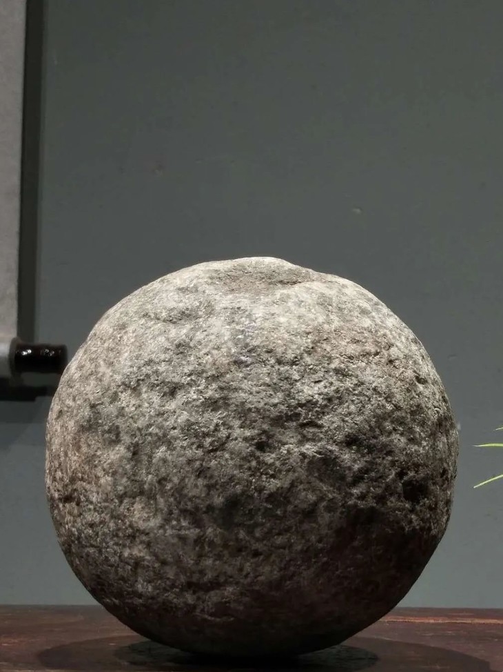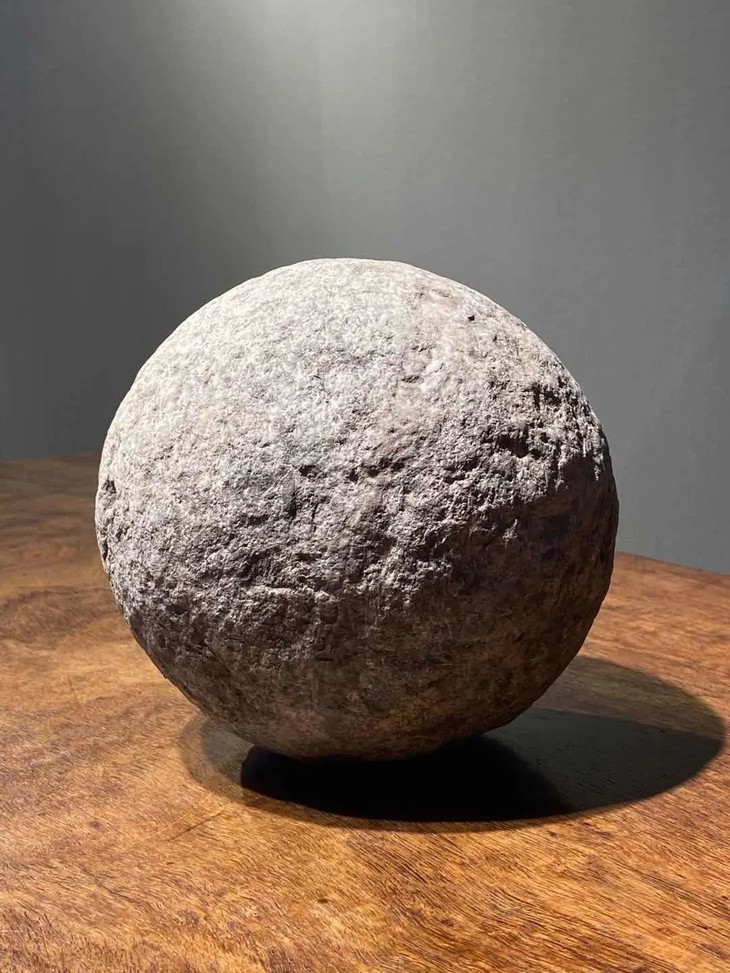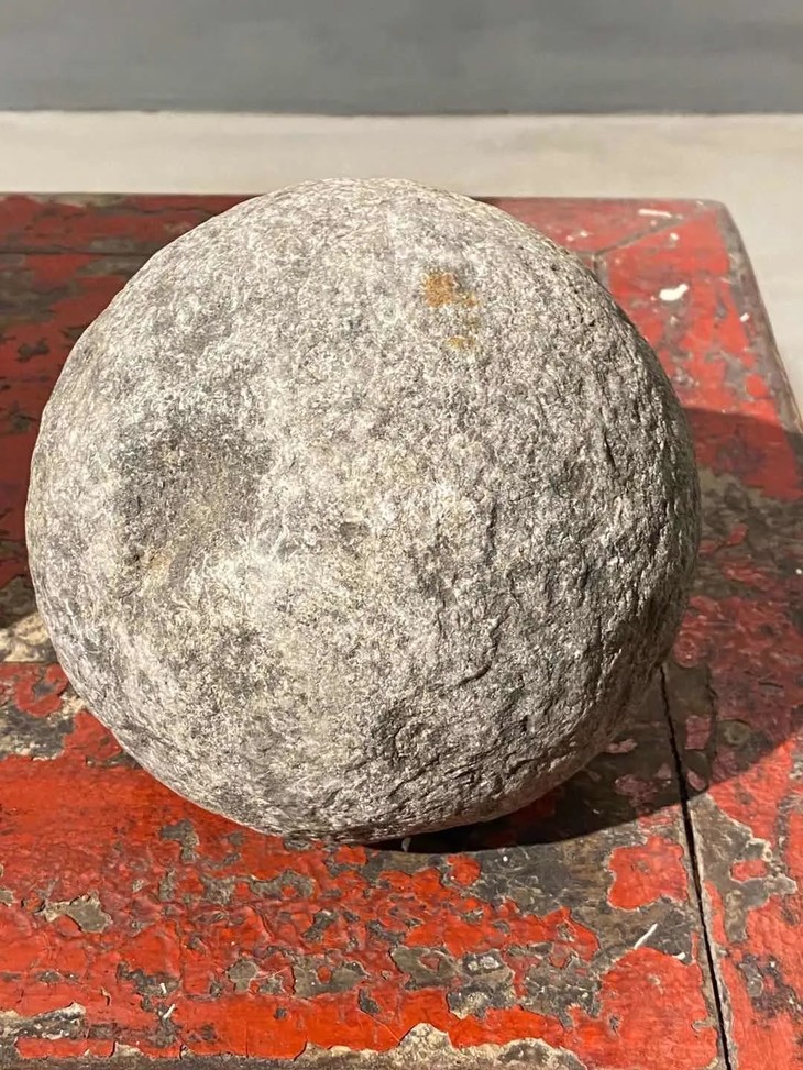 此太湖石大圆球直径约十五厘米,重约五公斤,表面多年摆放,自然风化与包浆皮壳清晰可见,应是琢磨后已经摆放逾百年的老风水球。是空间装饰或案头摆放的典雅佳器。