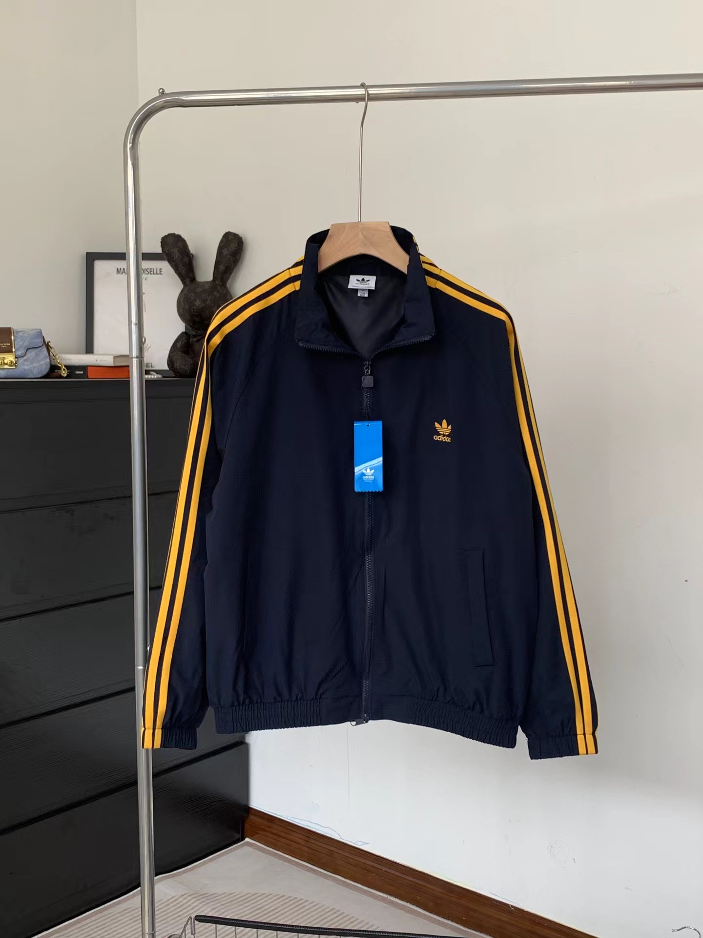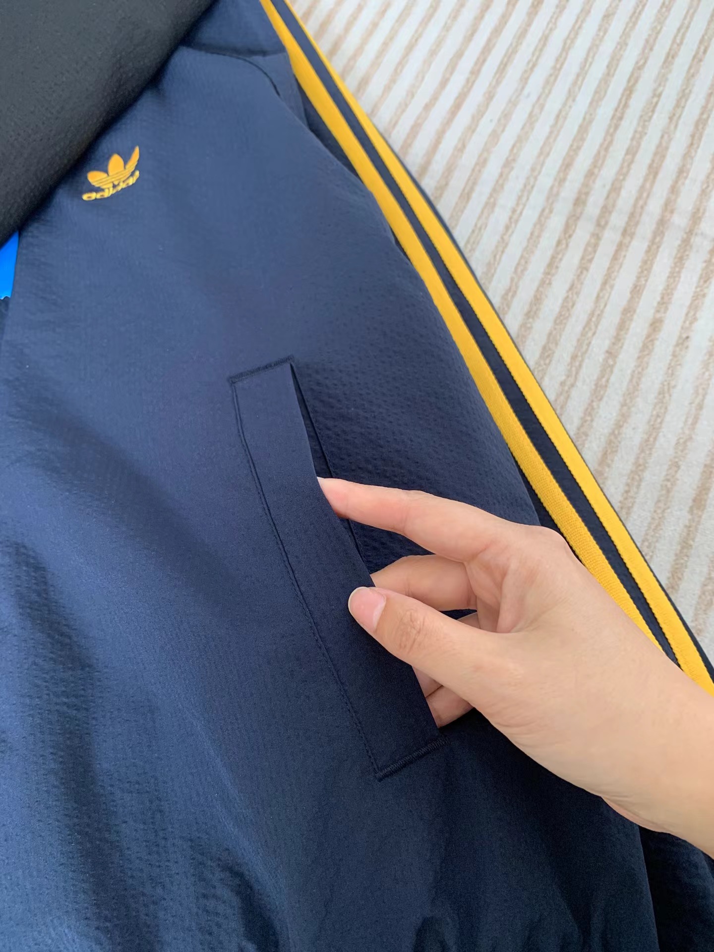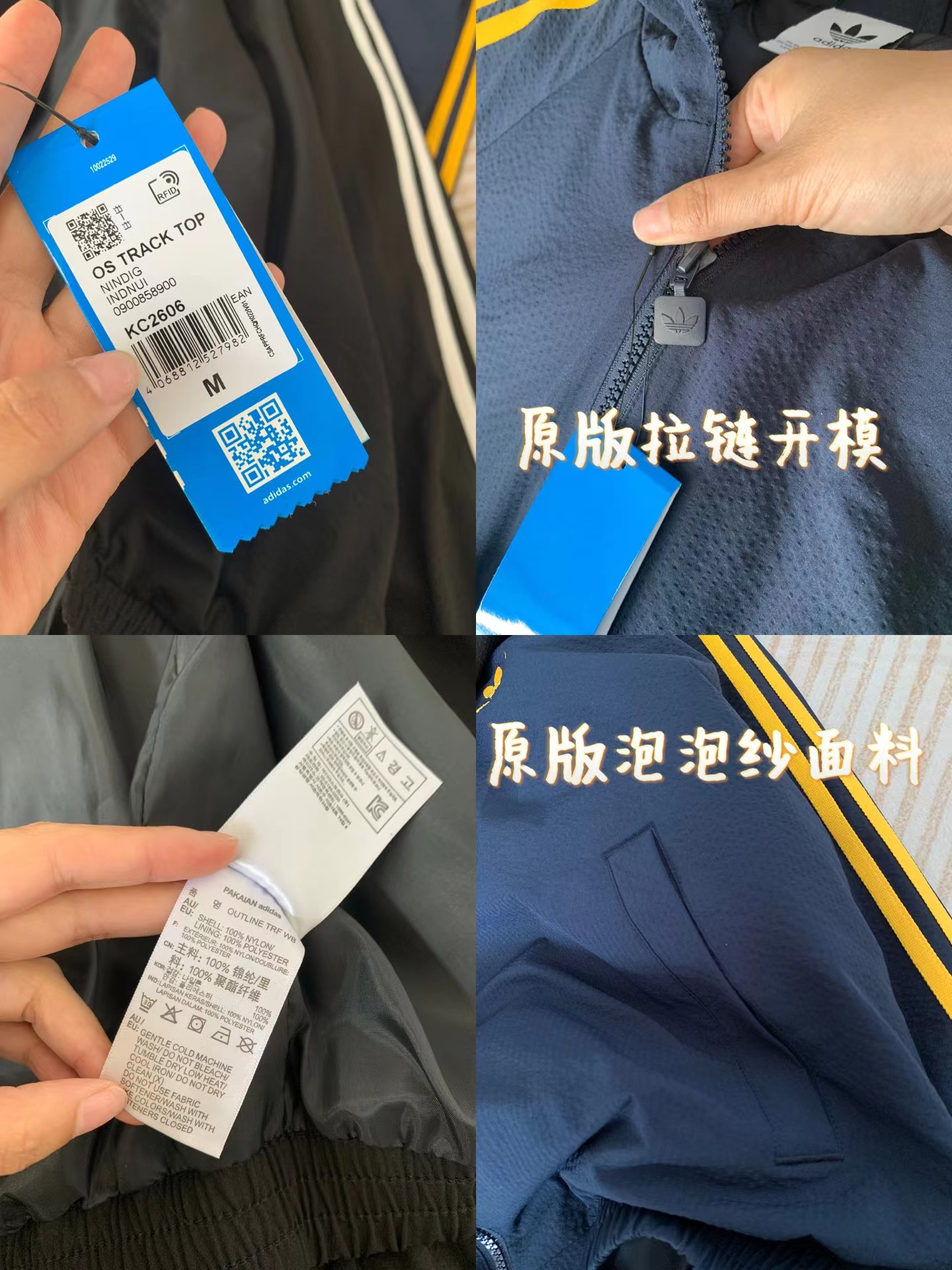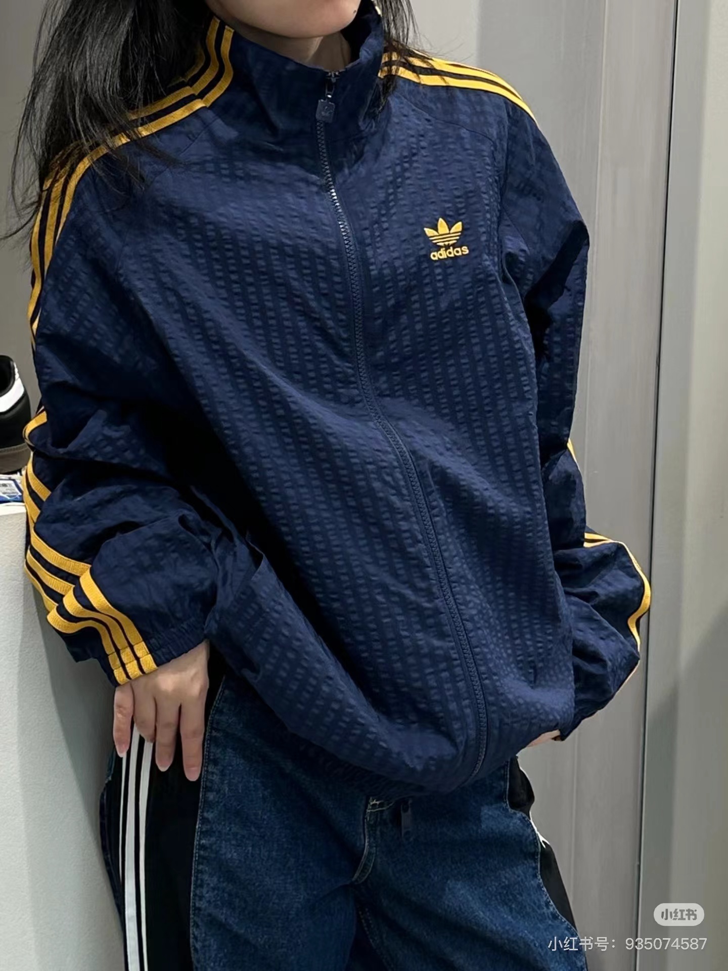 泡泡纱条纹外套 | 轻透有型的复古运动风,甄选泡泡纱肌理面料,表面自带细腻凹凸纹理,触感干爽不粘身,透气排湿性拉满,春夏穿着也不会闷汗。抗皱易打理:揉搓后不易留痕,日常通勤、出游随手一塞包里也能保持挺括。 轻盈无负担:比普通运动外套更轻薄,上身几乎无重量感,活动自如不束缚。质感独特:泡泡肌理自带羔级感,视觉上更显jing致,区别于普通光滑面料。立领插肩袖版型,兼顾利落感与舒适度:立领设计:修饰颈部线条,防风又显精神,日常通勤或运动都合适。插肩袖剪裁:弱化肩线,对溜肩、宽肩都很友好,藏住上半身小瑕疵。松紧下摆+袖口:贴合身形不跑风,同时避免臃肿,视觉上更显利落。适中衣长:刚好盖过腰线,搭配高腰裤/裙,轻松打造三七分好比例。三条杠条纹:延续三叶草标志性设计,黑白/藏黄配色复古又吸睛,辨识度拉满。全拉链开合:穿脱方便,可拉满立领显酷,也可半开当开衫穿,风格自由切换。拉链头开模定制三叶草标识,品质都在细节里。双侧插袋:实用又美观,放手边小物或插兜凹造型都合适。胸口刺绣Logo:三叶草刺绣,细节感满满,提升整体质感。