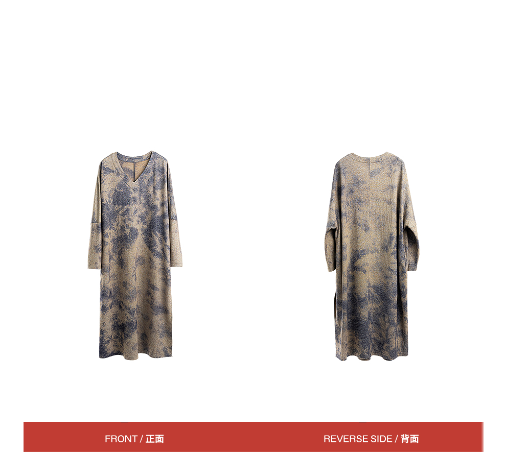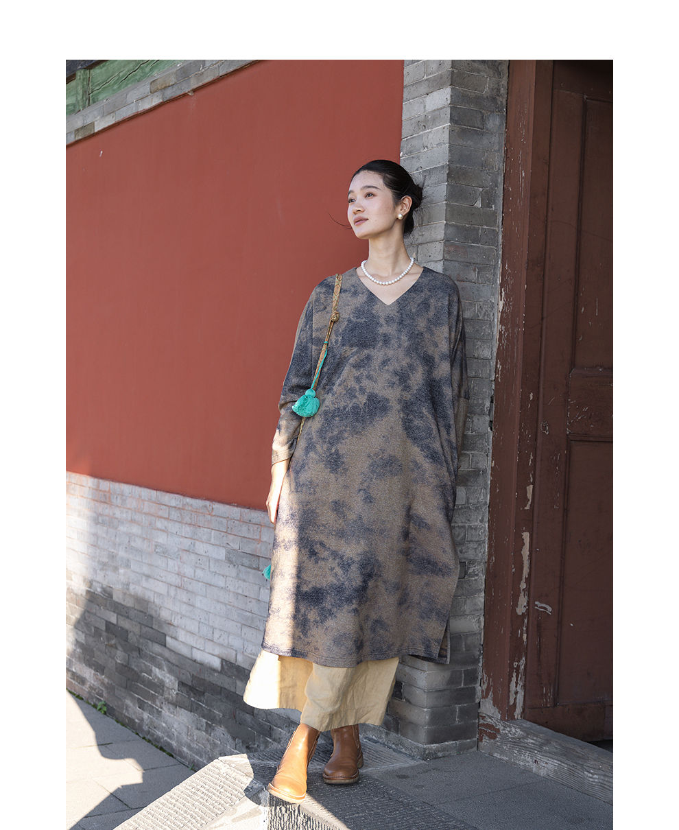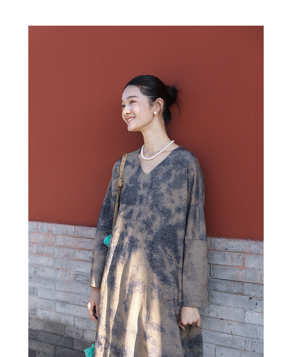绽放566朵/羊毛棉混纺艺术晕染设计感宽松v领毛织连衣裙秋冬新款