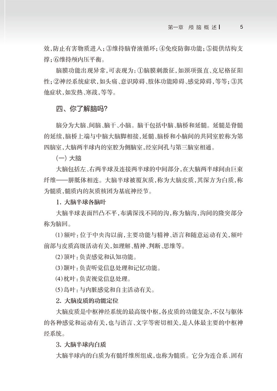 颅脑疾病是指影响大脑、小脑、脑干及脑周围组织的疾病,包括颅脑的损伤、肿瘤、畸形、炎症,以及遗传、免疫或代谢等原因引起的颅脑疾病。颅脑疾病多需住院治疗,部分患者出院后生活不能自理,会留有肢体偏瘫等后遗症,极大程度地影响着患者的健康与生存质量。因此,做好颅脑疾病患者的家庭延续护理,协助患者进行家庭康复,提高患者的生活质量,就显得尤为重要。为此我们组织了省内外三级甲等医院神经外科相关的护理专家共同编写了该书。全书共分为五章:第一章为颅脑概述,教会读者认识颅脑的结构及颅脑疾病;第二章是颅脑疾病家庭护理的常见问题,介绍了颅脑损伤、脑血管病、颅内肿瘤、中枢神经系统畸形、疼痛和功能性疾病及癫痫等在家庭护理中的常见问题;第三章是颅脑疾病的家庭急救,介绍了几种疾病的家庭急救方法;第四章是特殊情况的家庭护理,介绍了几种特殊情况如留置导管、气管切开患者的家庭护理;第五章是颅脑疾病康复锻炼,介绍了良肢位的摆放、瘫痪肢体的功能锻炼、失语患者的功能锻炼、吞咽障碍患者的训练等。该书不仅适合有颅脑疾病的患者及其家属阅读,也适合基层医院医护人员及进修人员使用。希望本书的出版能帮助更多的颅脑疾病患者恢复健康,提高他们的生活质量。该书在编写过程中得到了各参编单位的大力支持,特别是西安交通大学第二附属医院神经外科主任屈建强教授、神经外科副主任吕健教授对全书内容进行了把关,西安交通大学第二附属医院护理部主任杨惠云教授进行了悉心指导,空军军医大学第二附属医院心内科杨舒涵同志对图片进行了绘制,使得该书增添不少色彩,在此一并表示衷心的感谢。颅脑疾病的护理发展日新月异,尽管书中尽量使用了目前国内常用的照护方法,但不妥之处仍不能避免,敬请广大读者提出宝贵意见和建议,以便再版时修改。徐岁云 高 炀 王金娟2024 年8 月