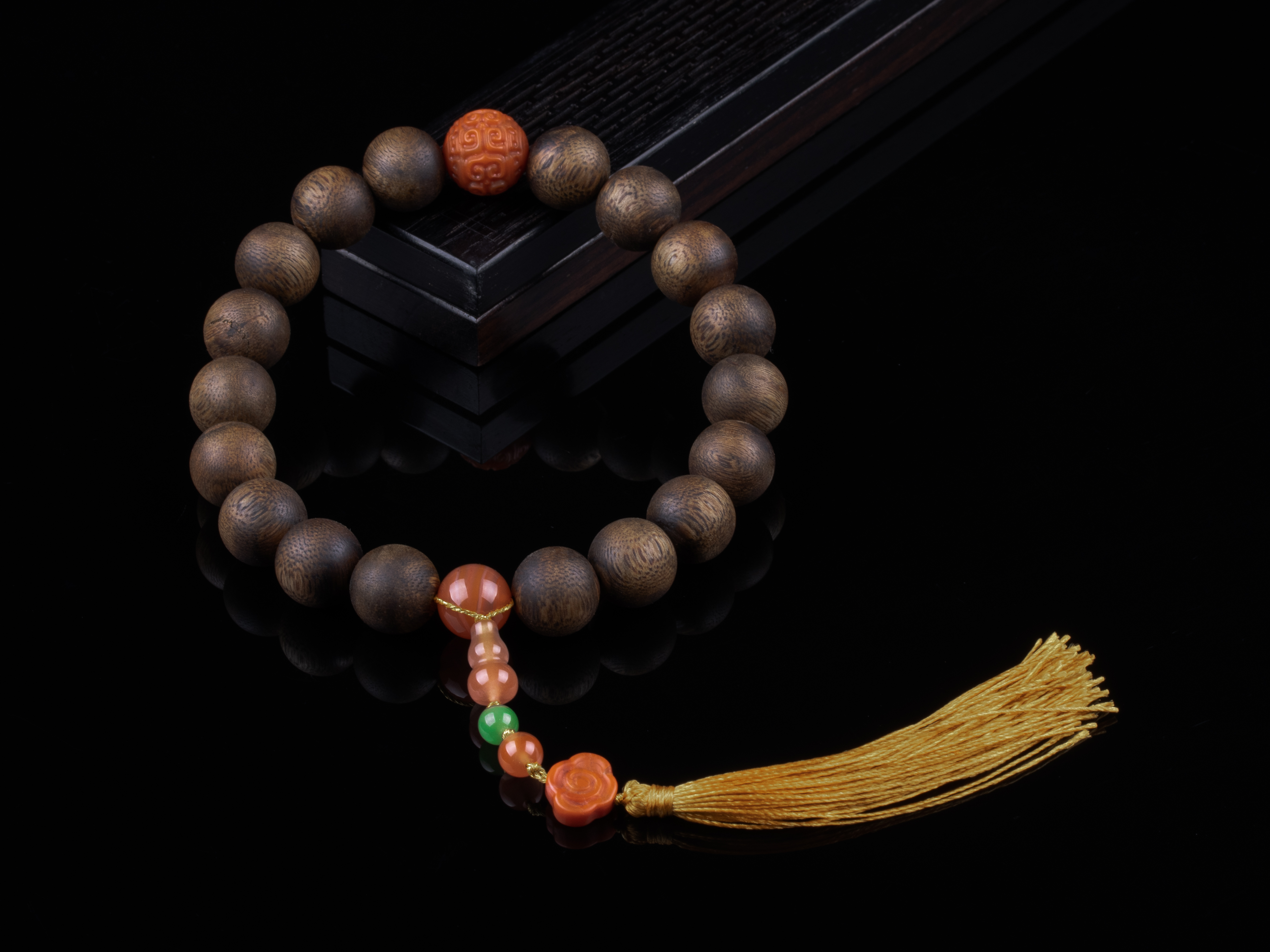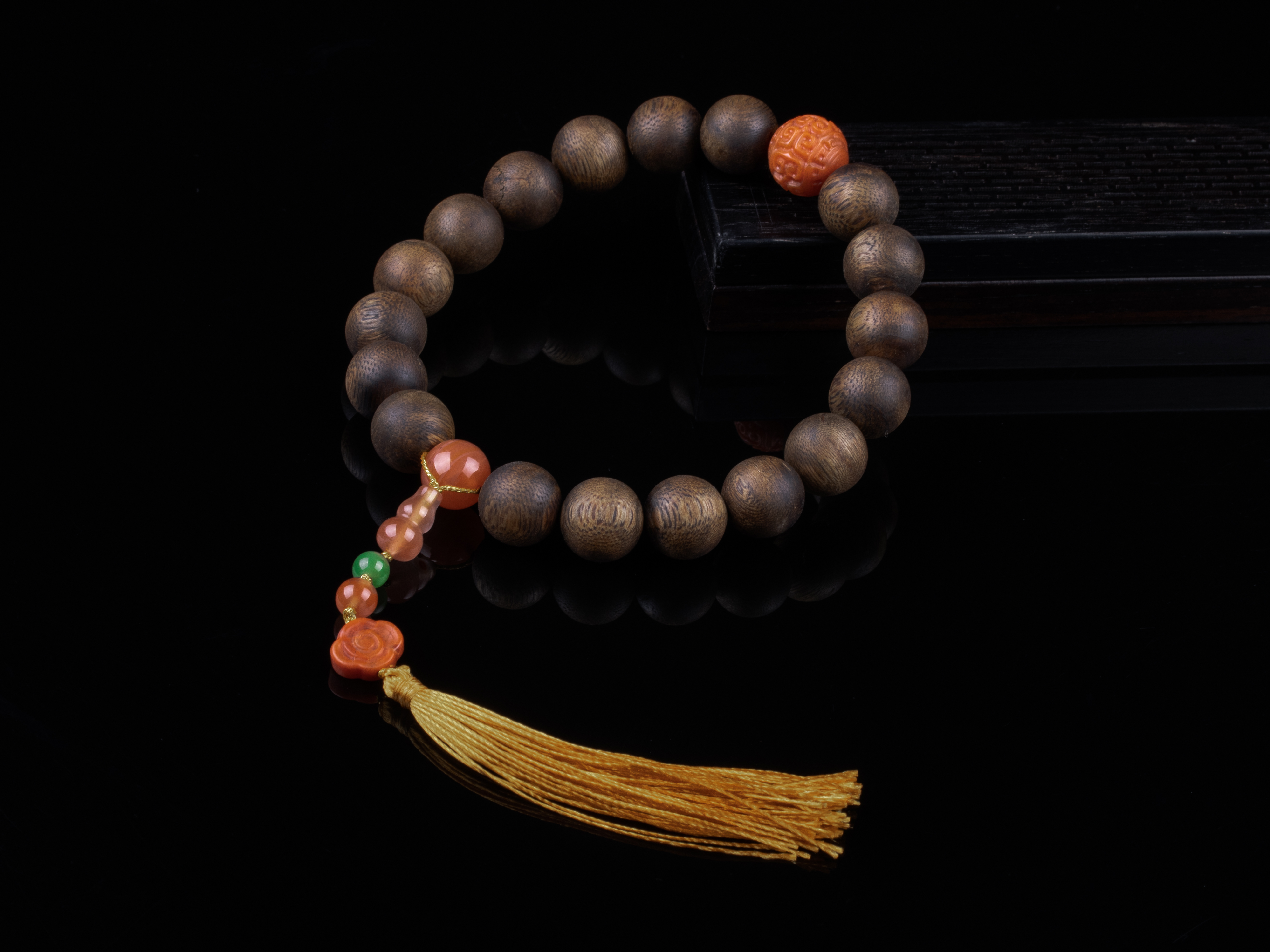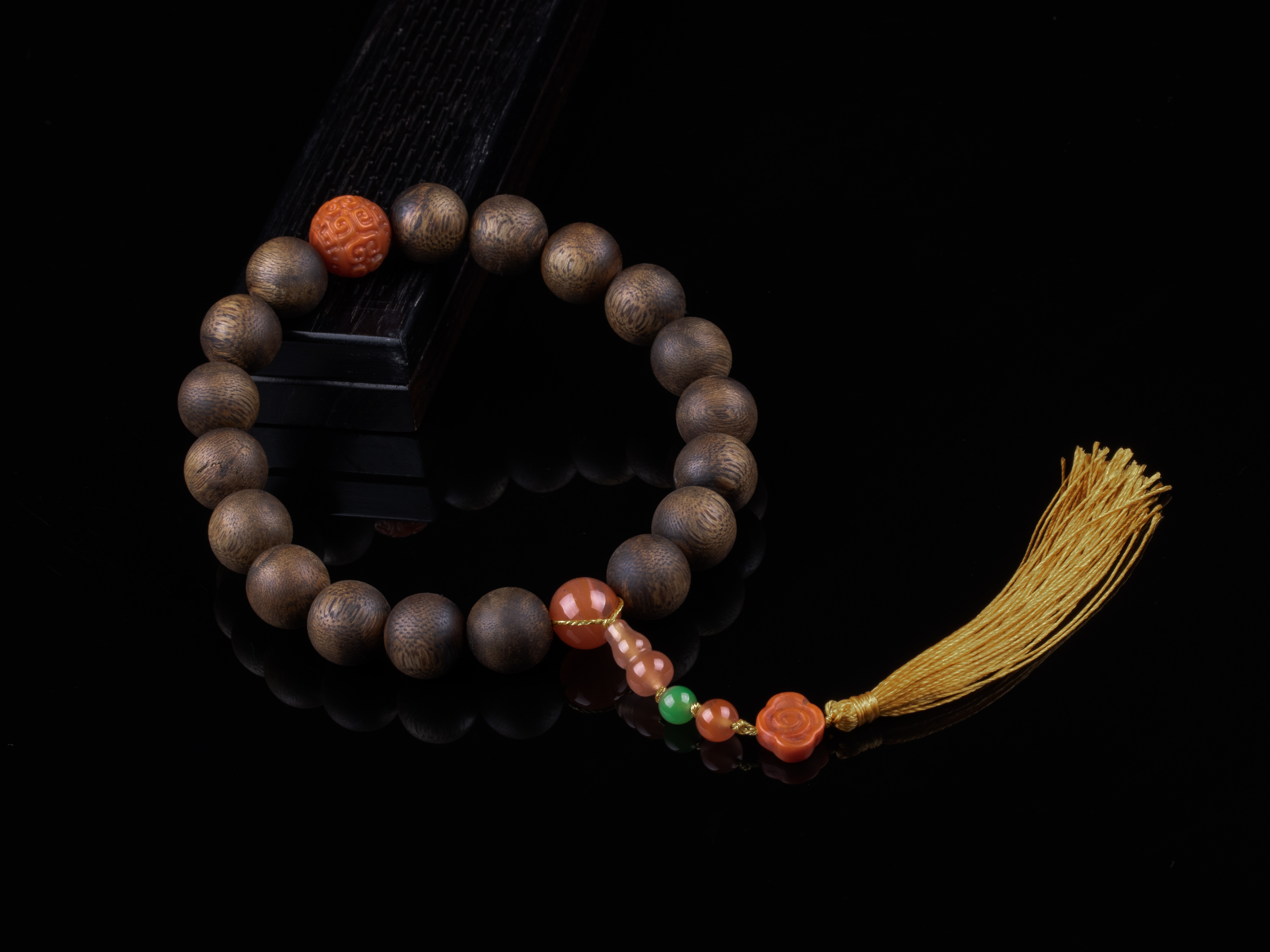 XY0250沉香+南红十八子手持念珠,天然沉香13.3mm,原色原味,香味自然清甜,满色肉的南红回纹珠+冰飘小葫芦、祥云流苏,一颗满绿碧玉点缀,款式经典,皇家风范,非常大气。