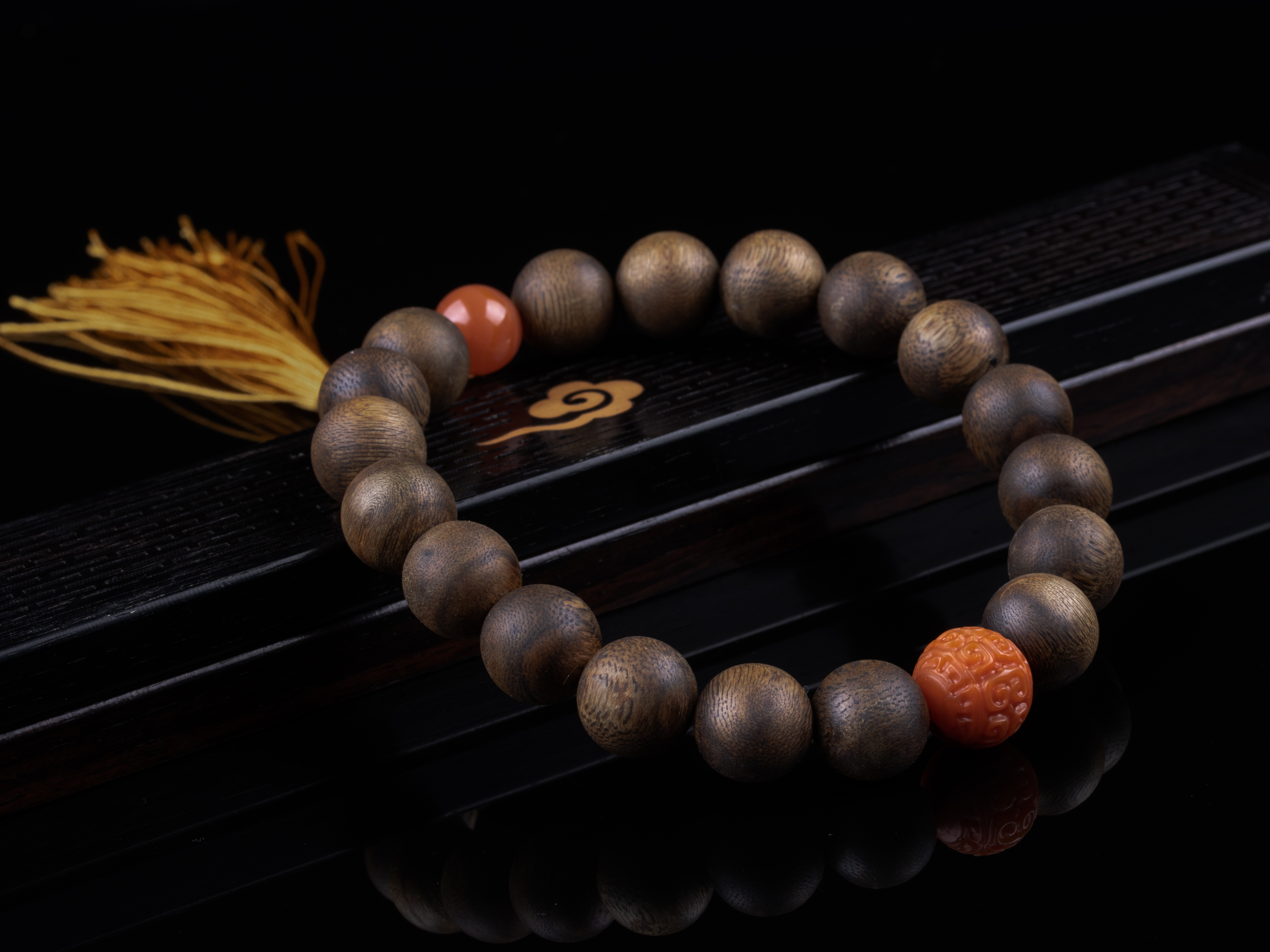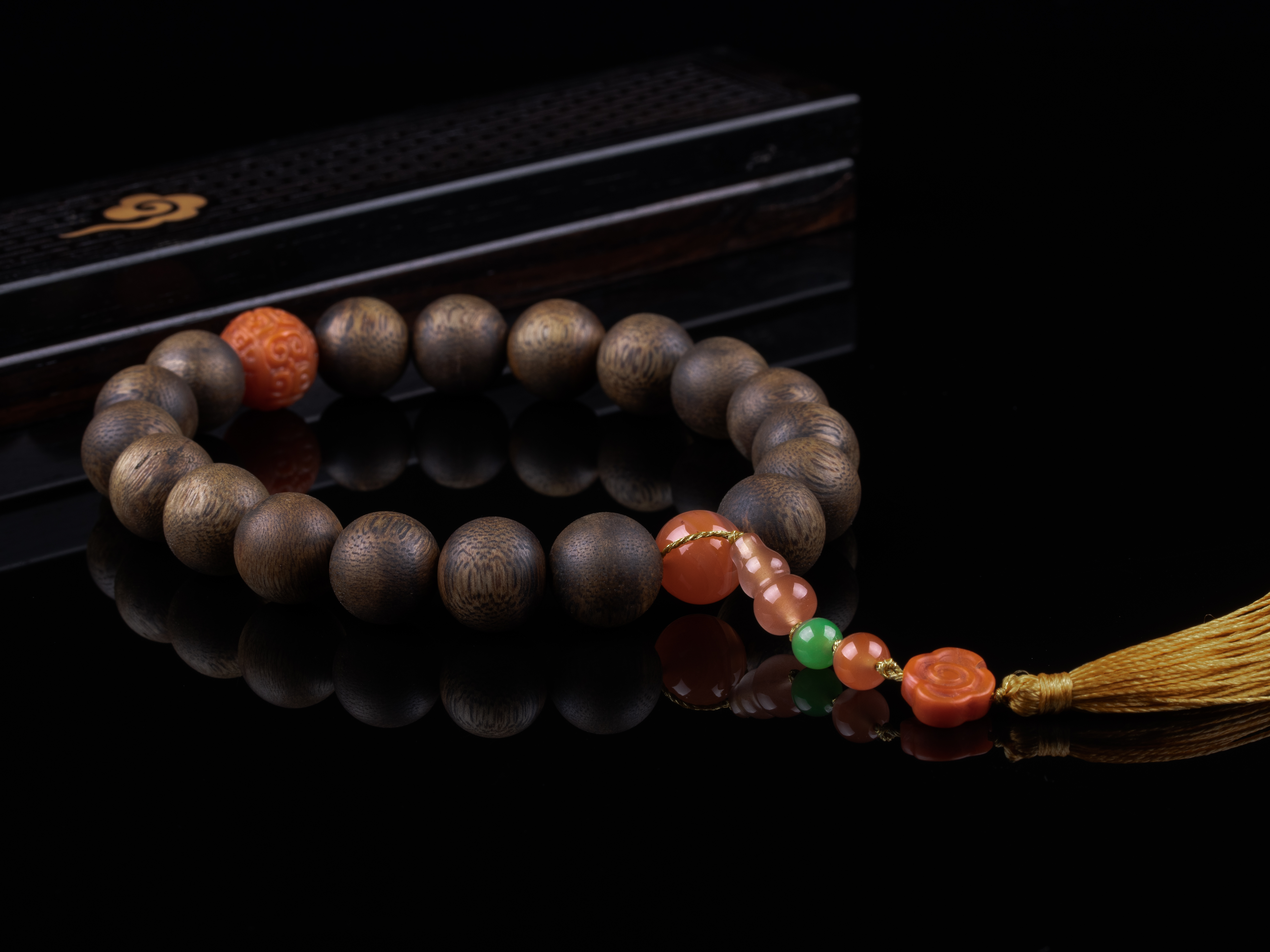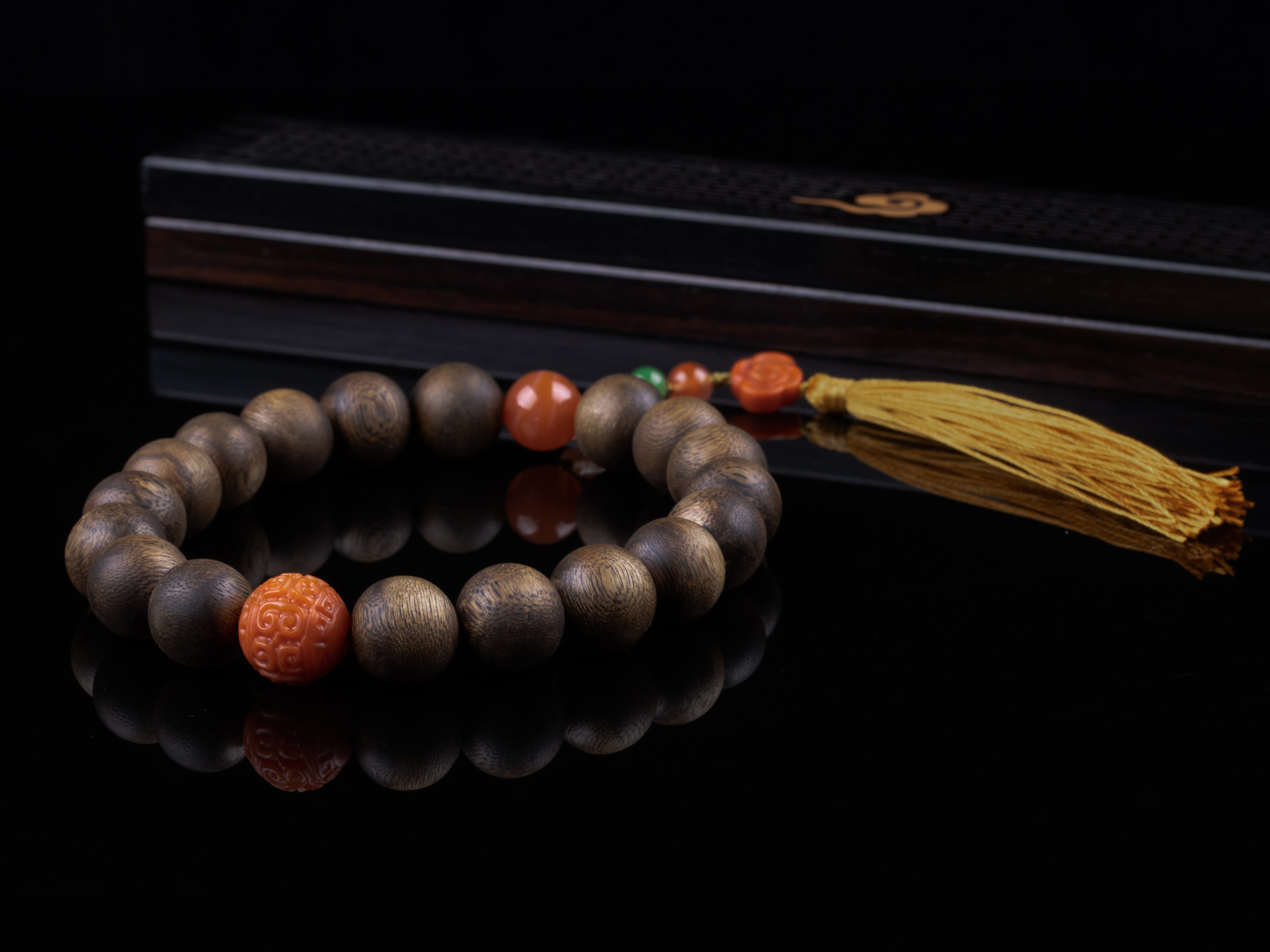 XY0250沉香+南红十八子手持念珠,天然沉香13.3mm,原色原味,香味自然清甜,满色肉的南红回纹珠+冰飘小葫芦、祥云流苏,一颗满绿碧玉点缀,款式经典,皇家风范,非常大气。