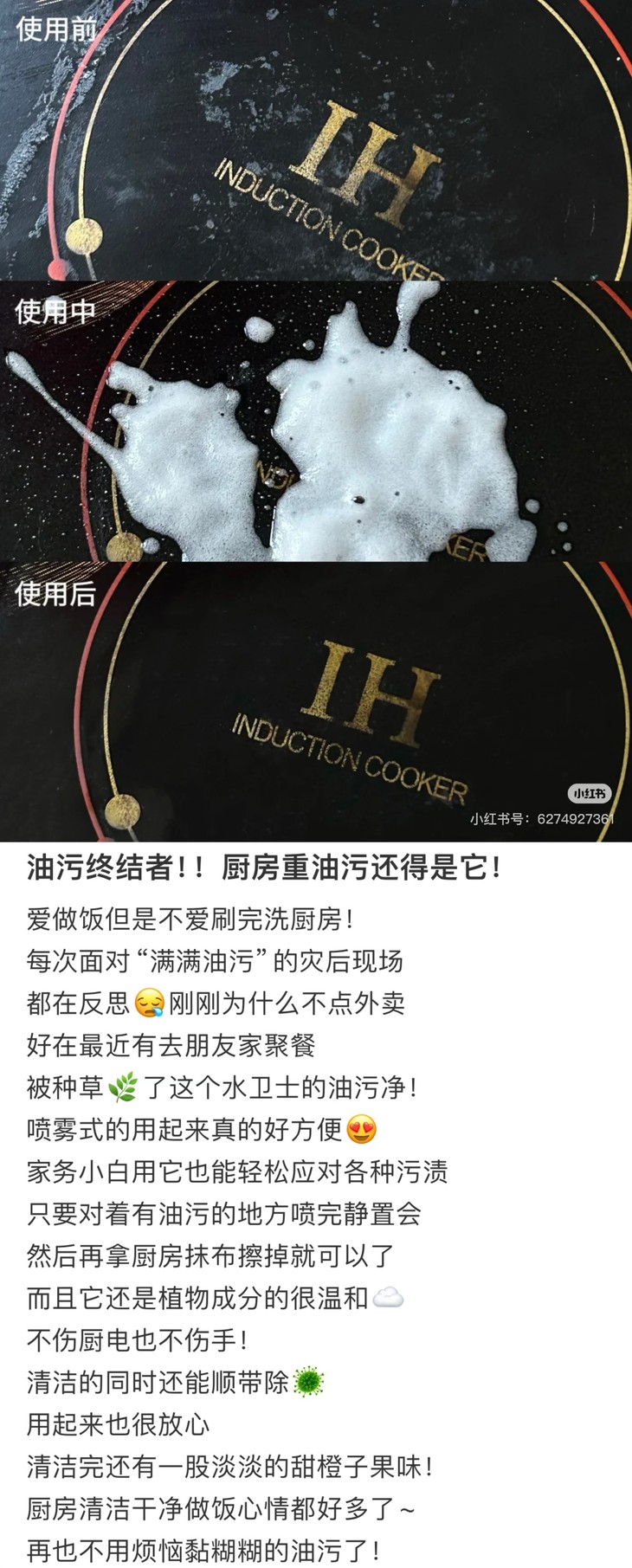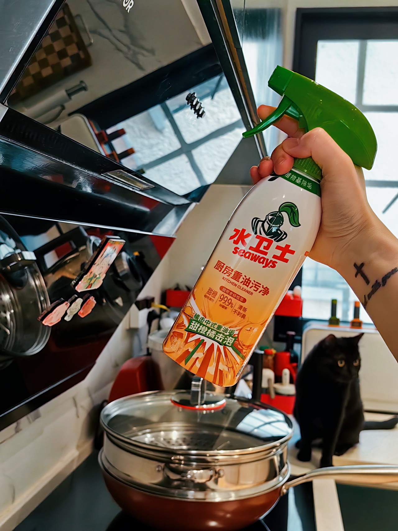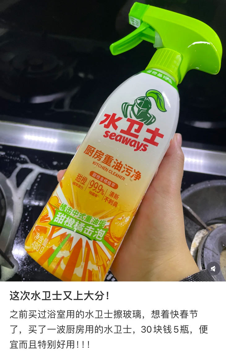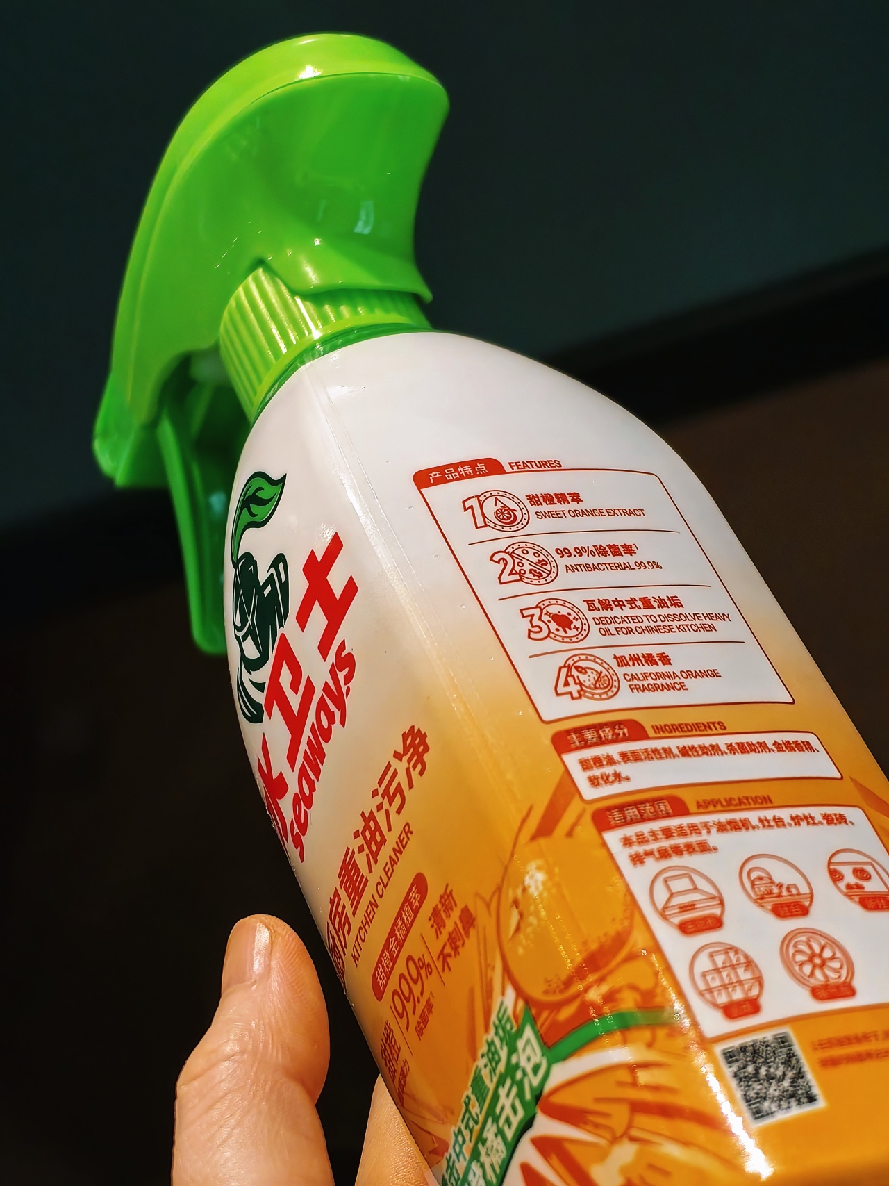 白倍极的机械乳在清仓中,很怕哪天就忽然下架了,就也是试了蛮多厨房清洁用品,作为备胎,毕竟油腻腻的灶台和油烟机,还有被溅得油渍斑斑的墙面和锅底……搞起卫生来真的让人头疼。水卫士这支,用的是甜橙油,重油污一喷一擦也是轻松搞定,而且,除菌抑菌,还很好闻,这两点也是很重要!