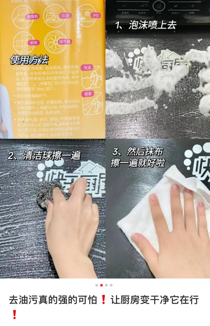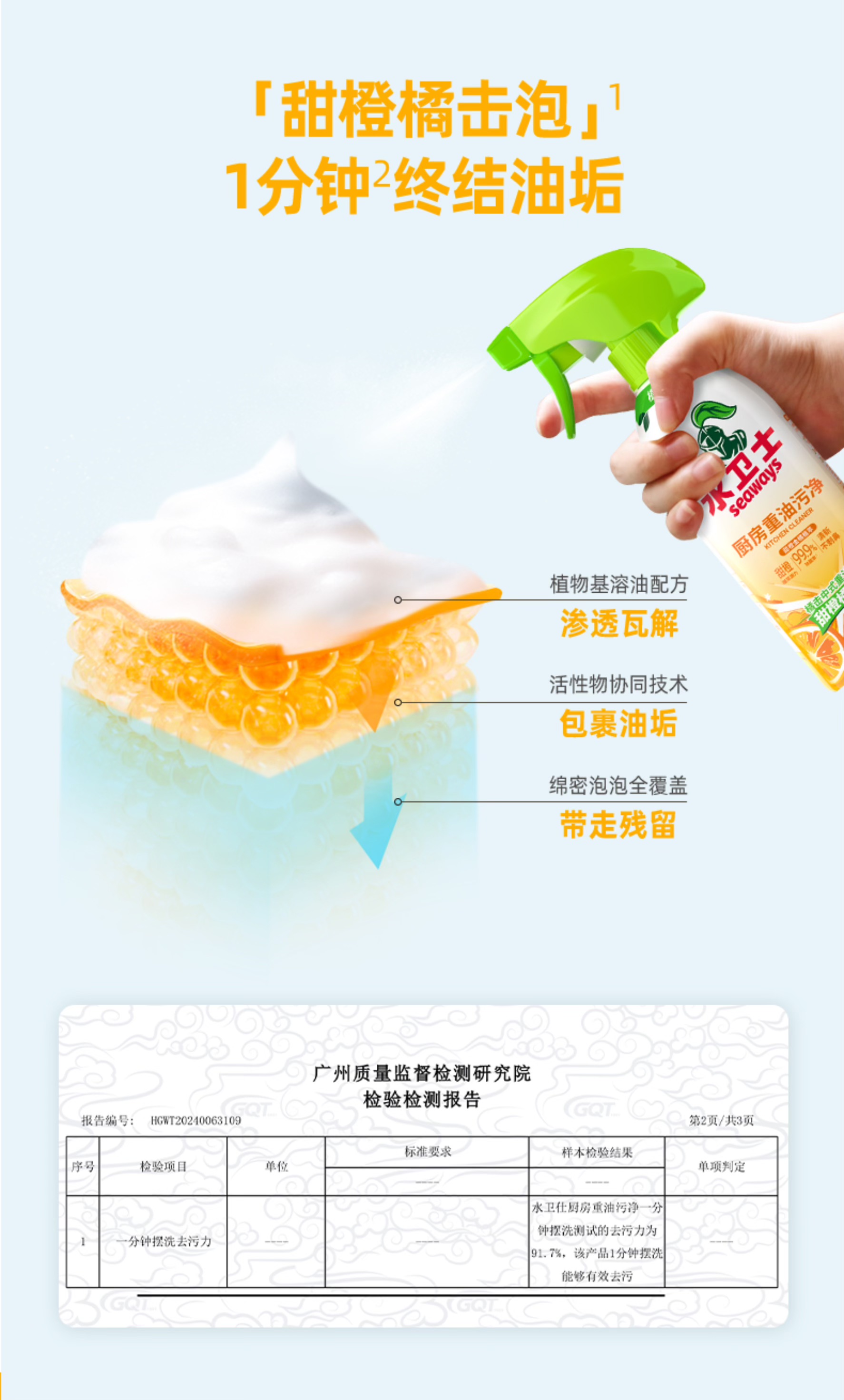 水卫士厨房重油污净还配备双功能喷头:泡沫模式闭合喷嘴网筛,绵密如云朵般附着在油污表面,持久挂壁,深入瓦解顽固油渍,除油效果拔群;喷雾模式打开喷嘴网筛,细腻均匀的喷雾能快速覆盖大面积油污区域,清洁省时省力。三步搞定:第一步“喷”,将清洁剂均匀覆盖在油污表面;第二步“等”,静候十几秒,让清洁剂与油污充分“博弈”,完成深度溶解;第三步“净”,用干净的海绵或毛巾轻轻擦拭,或用清水一冲,油污瞬间消失无踪,厨房即刻光洁如新!