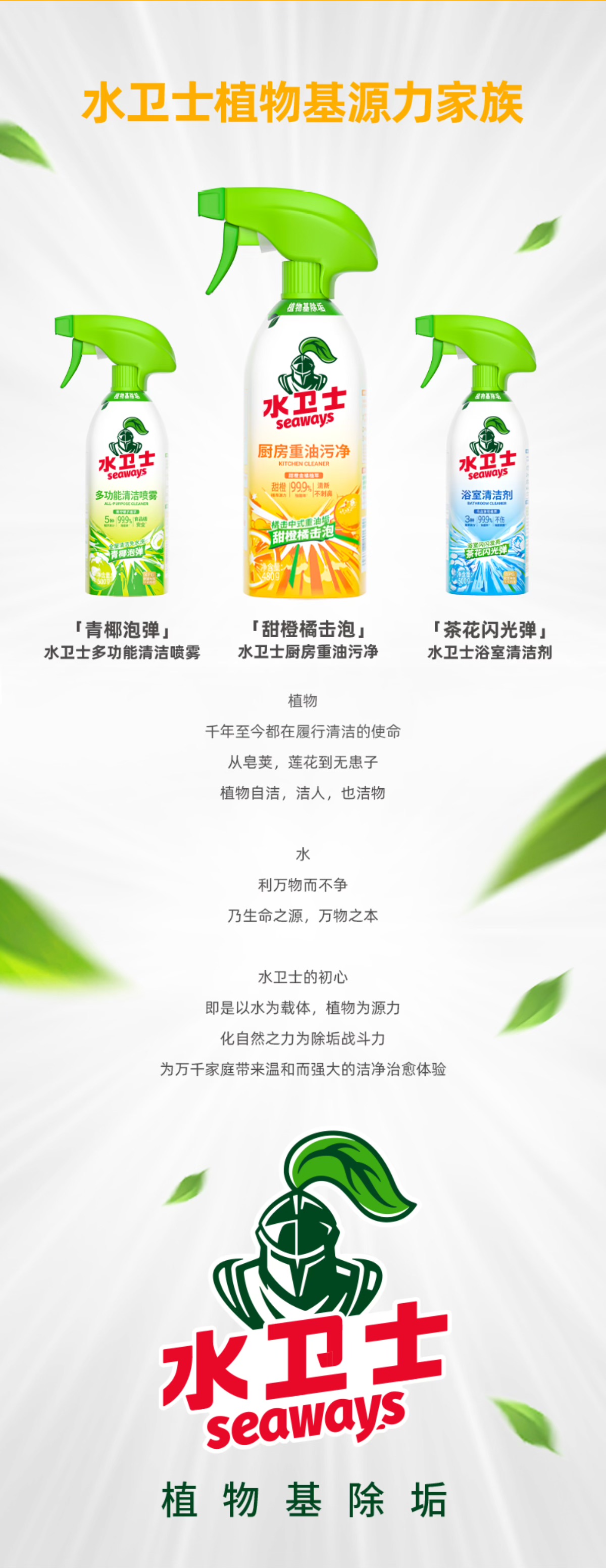 水卫士隶属植物基源力家族,始终秉持“以水为载体,植物为源力”的环保理念。多年深耕清洁领域,匠心研发温和而高效的清洁产品,只为给消费者带来治愈系的洁净体验。除厨房重油污净外,植物基源力家族还涵盖多种清洁好物,全方位满足不同场景下的清洁需求。