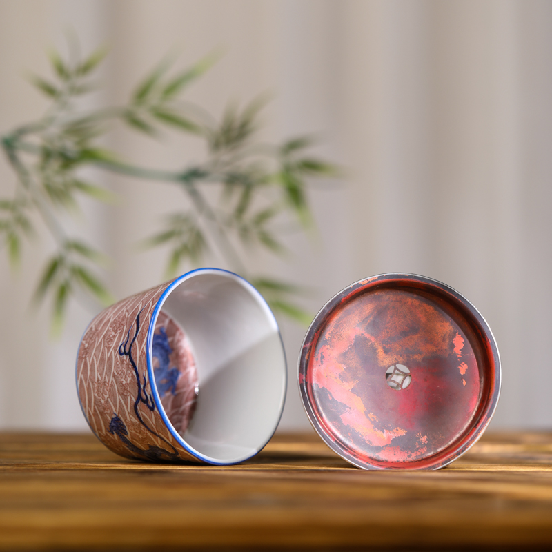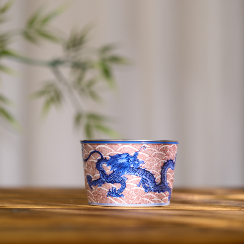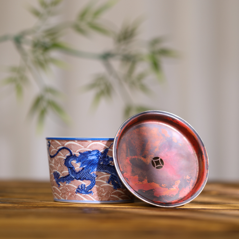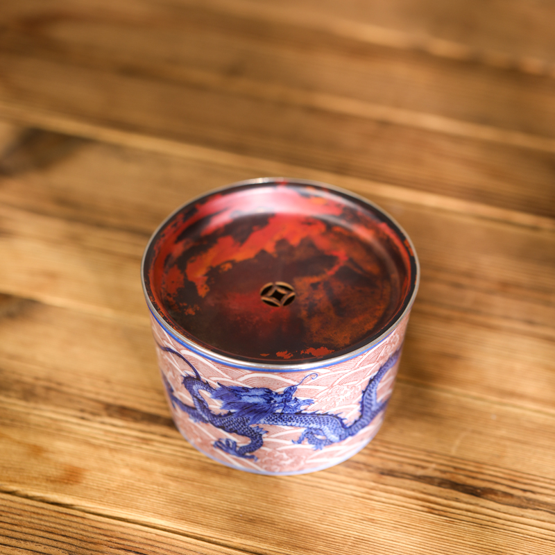 【忘言】 青花釉里红海水龙纹手工铜盖建水 曰何文人器
