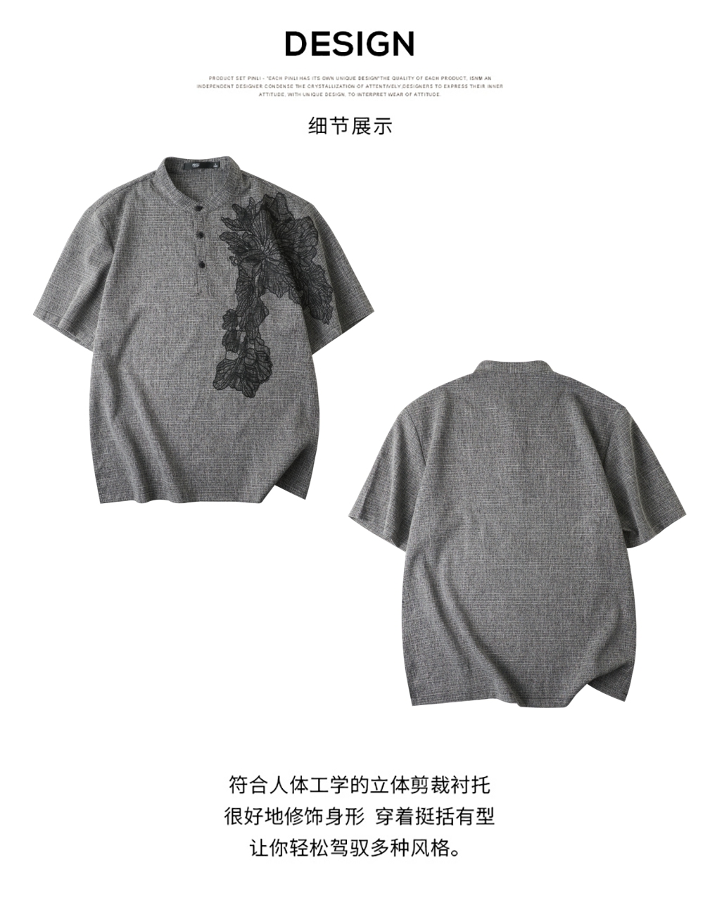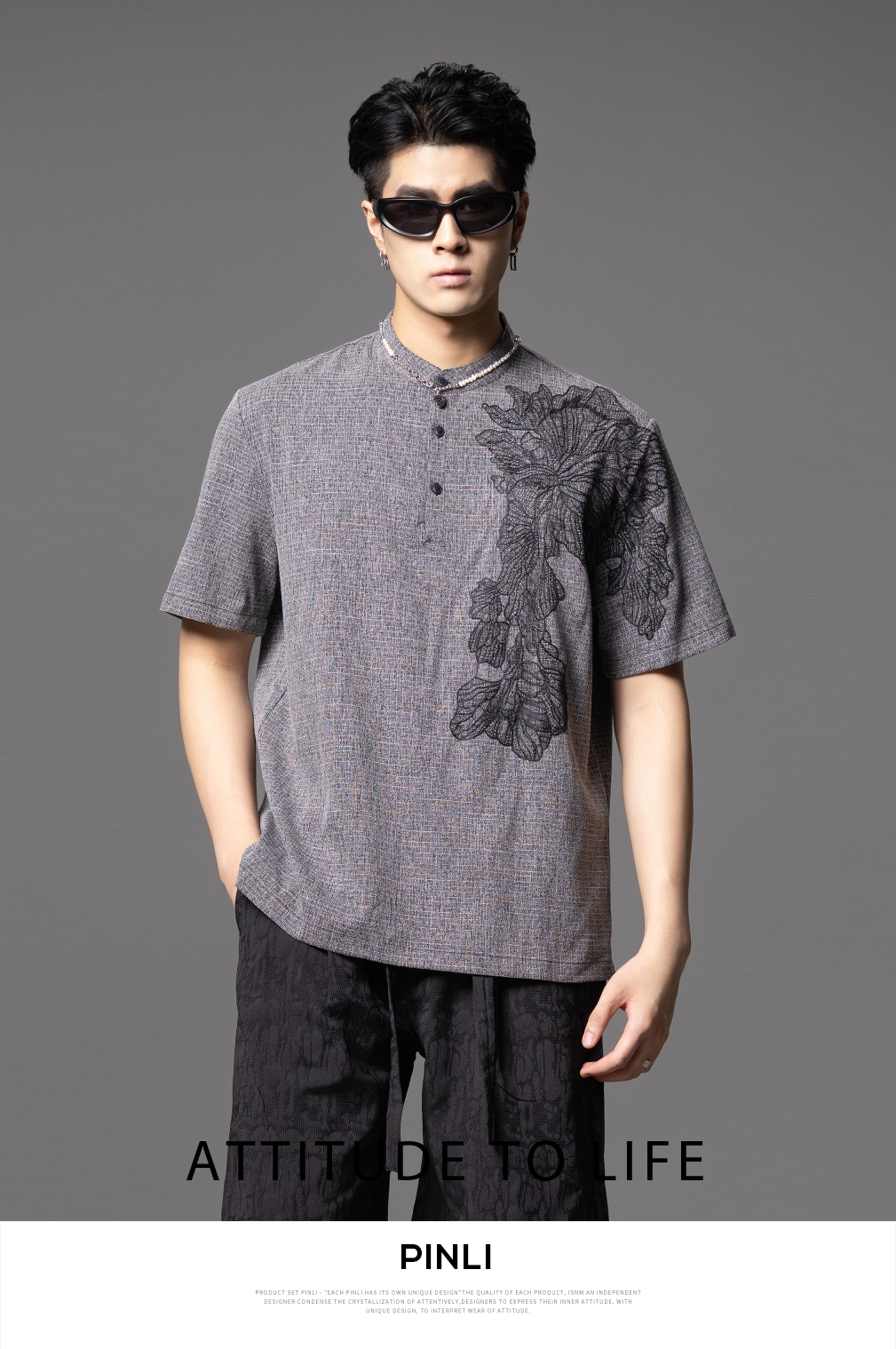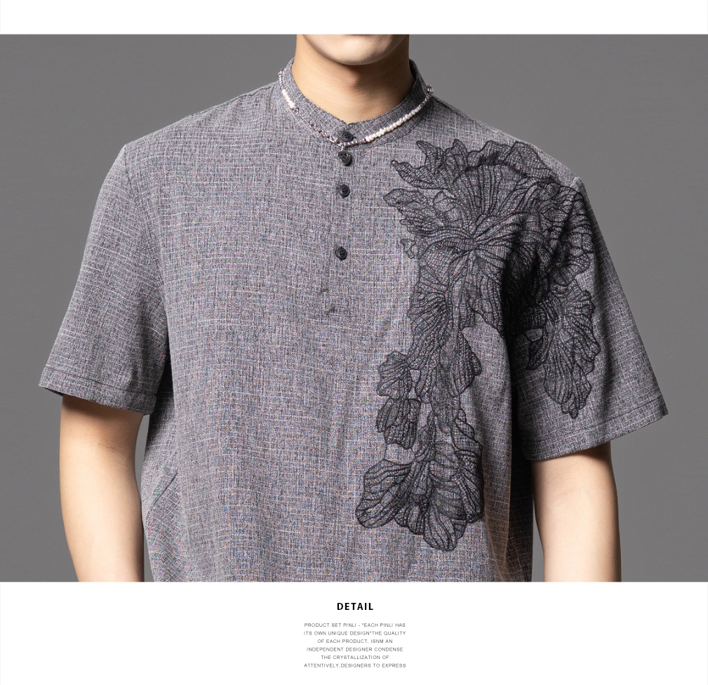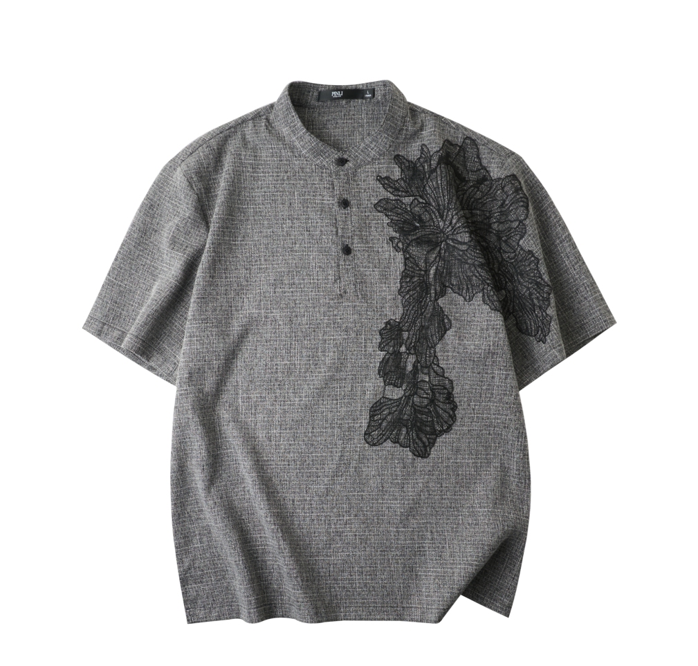PINLI品立2025夏季新款贴布绣立领短袖T恤潮流宽松男士休闲上衣服BG252111097