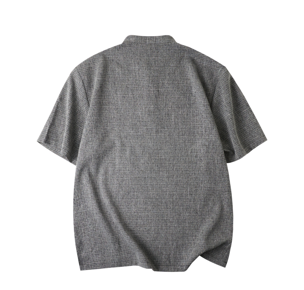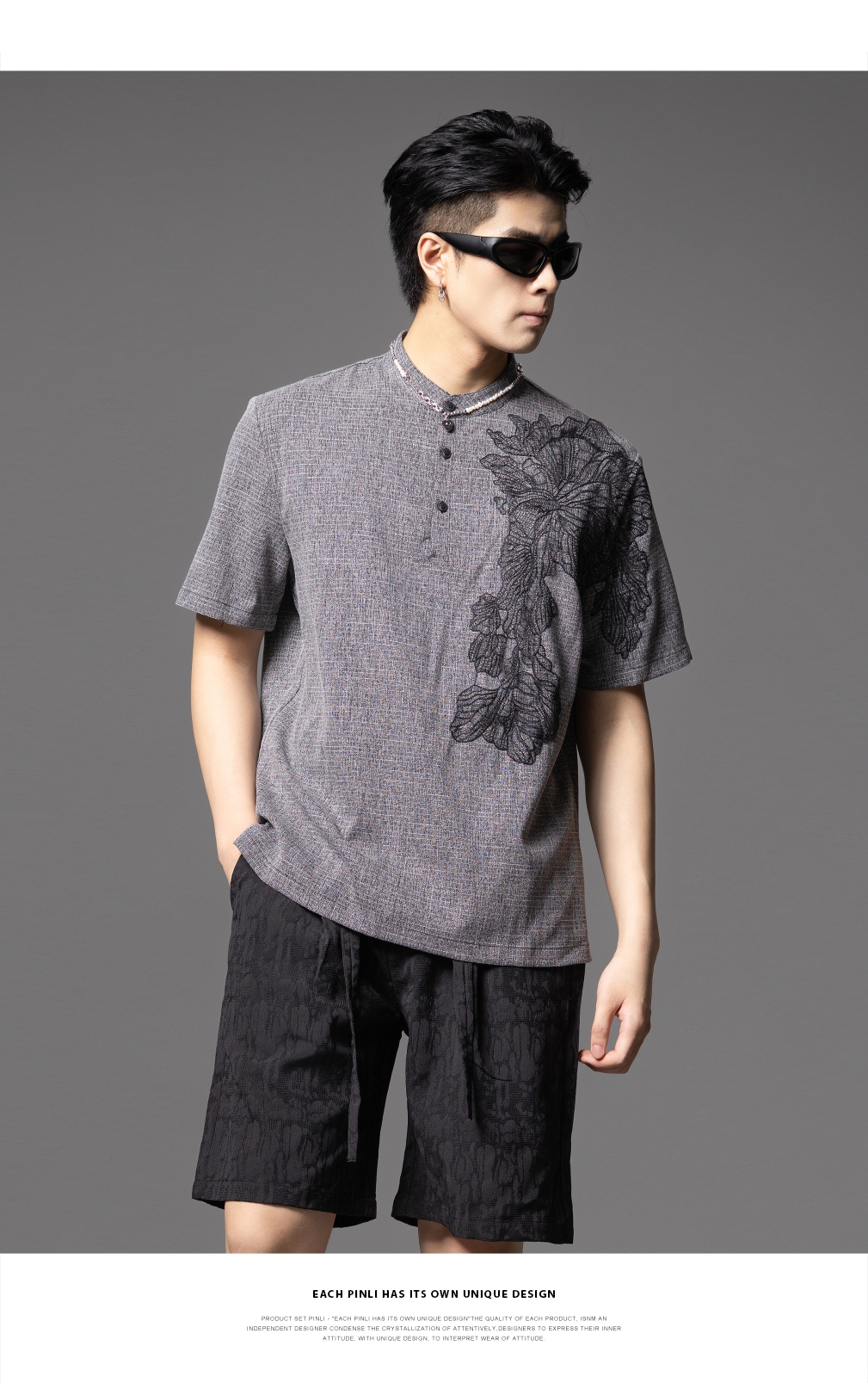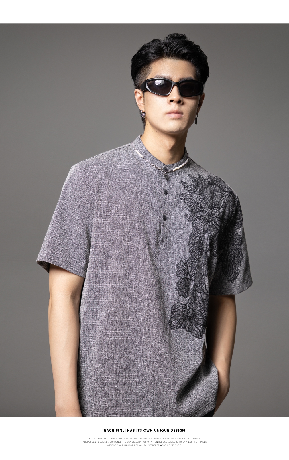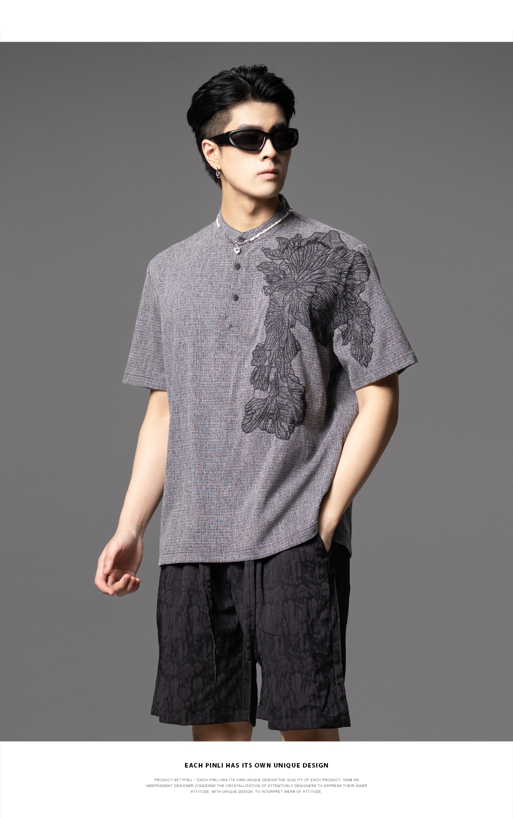 PINLI品立2025夏季新款贴布绣立领短袖T恤潮流宽松男士休闲上衣服BG252111097