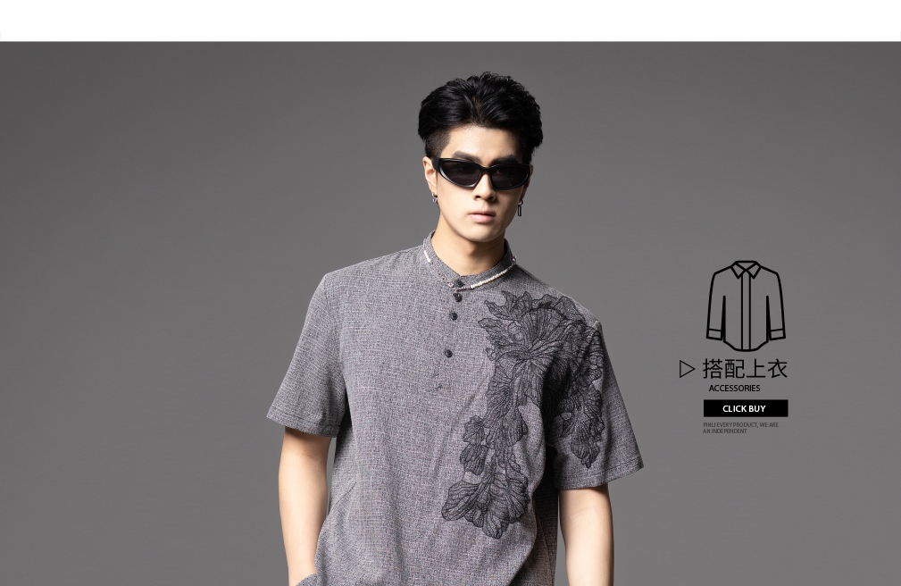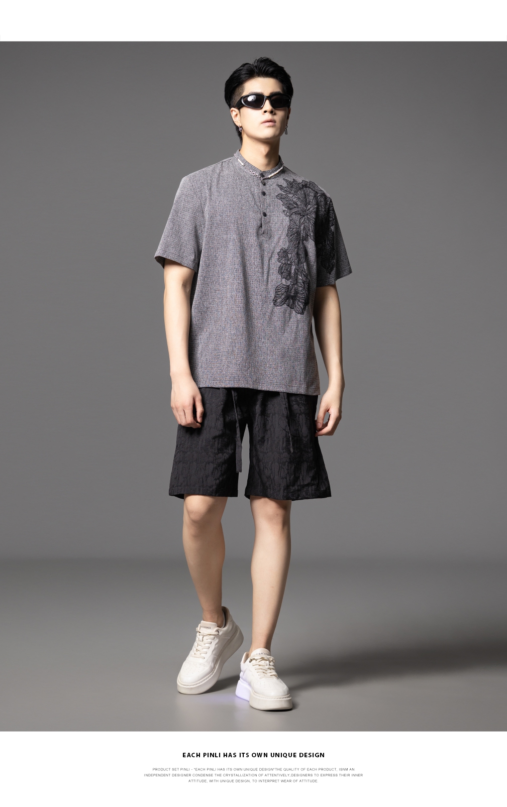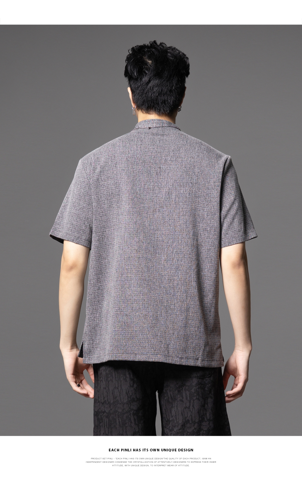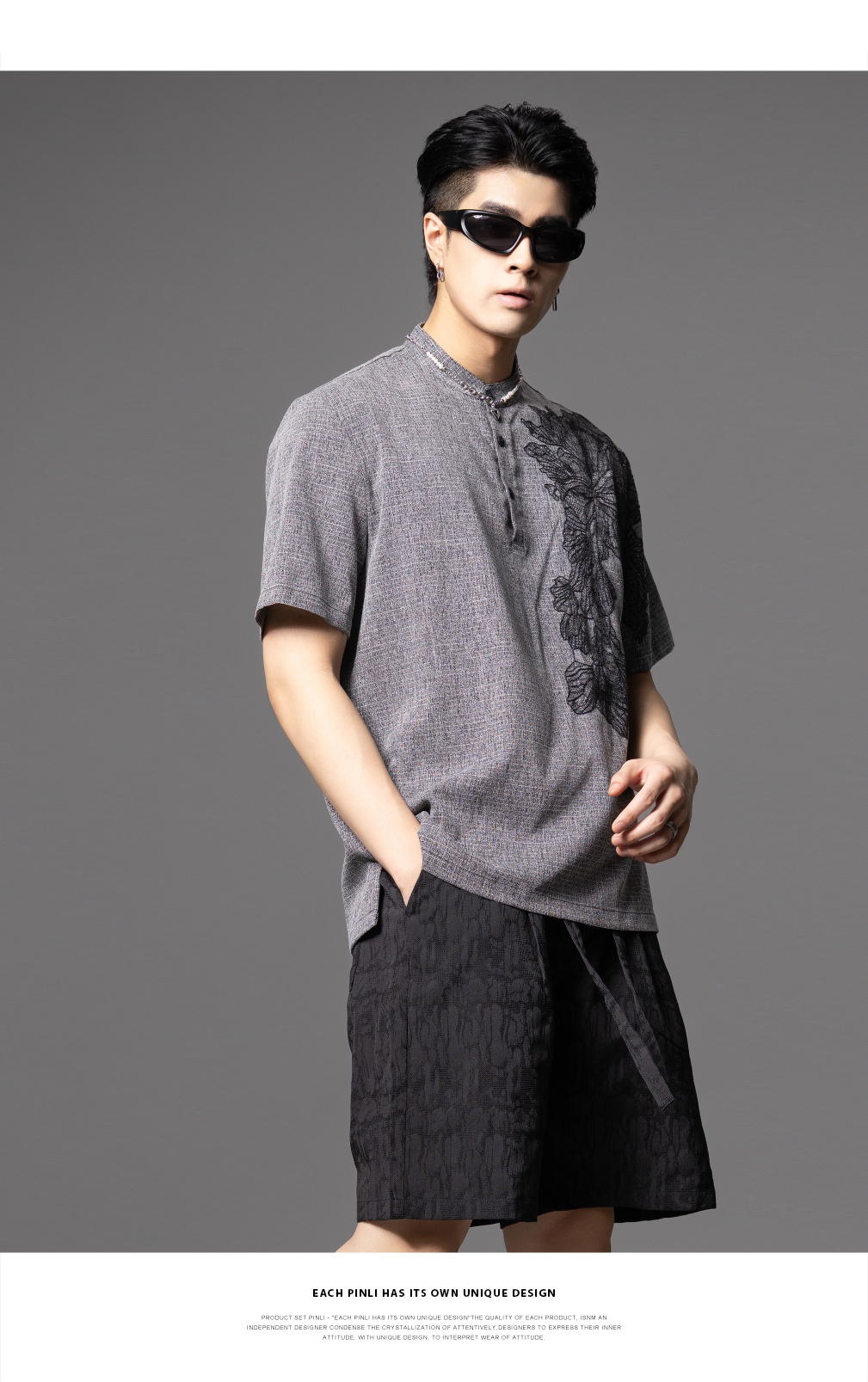 PINLI品立2025夏季新款贴布绣立领短袖T恤潮流宽松男士休闲上衣服BG252111097