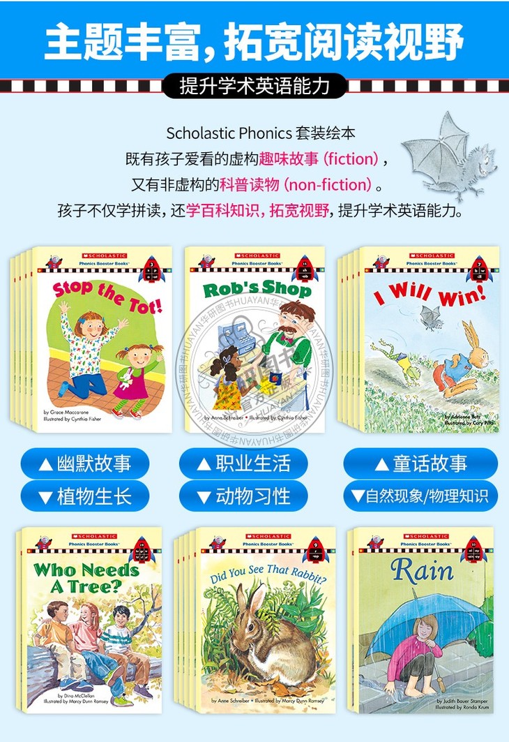 1.30本绘本集趣味故事(fiction)和科普读物(non-fiction)于一体,既练习英语拼读,也学百科知识;