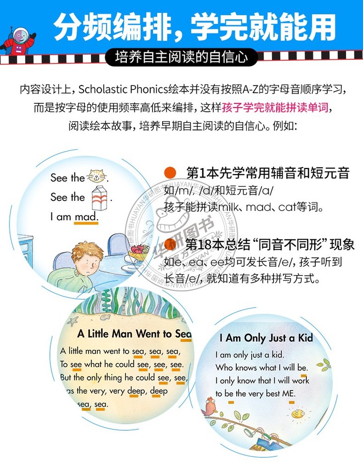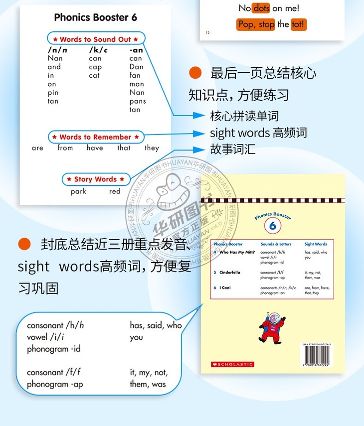 2.每本绘本集中教1-6个核心拼读字母或字母组合的发音,以及5-7个高频词(Sight Words),编排科学合理;
