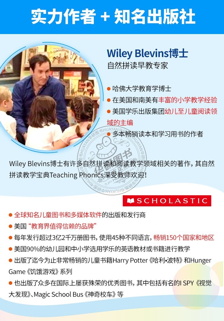 Scholastic Phonics是美国学乐出版社(Scholastic)出版的一套自然拼读分级绘本,由哈佛大学教育学博士Wiley Blevins以及Francie Alexander等知名儿童书作家共同创作。