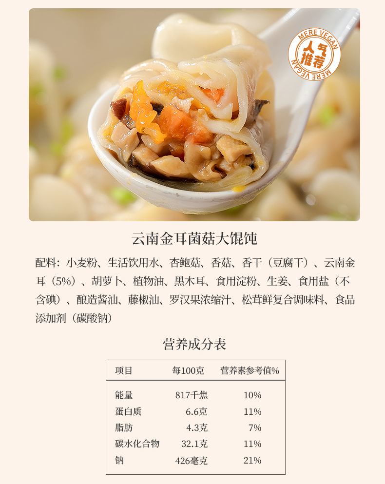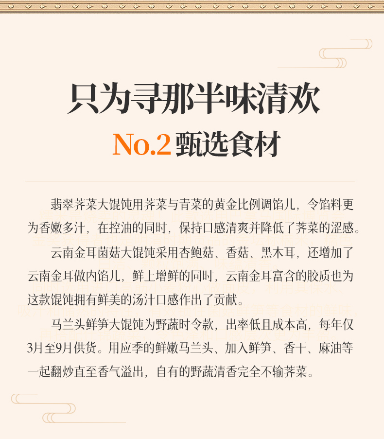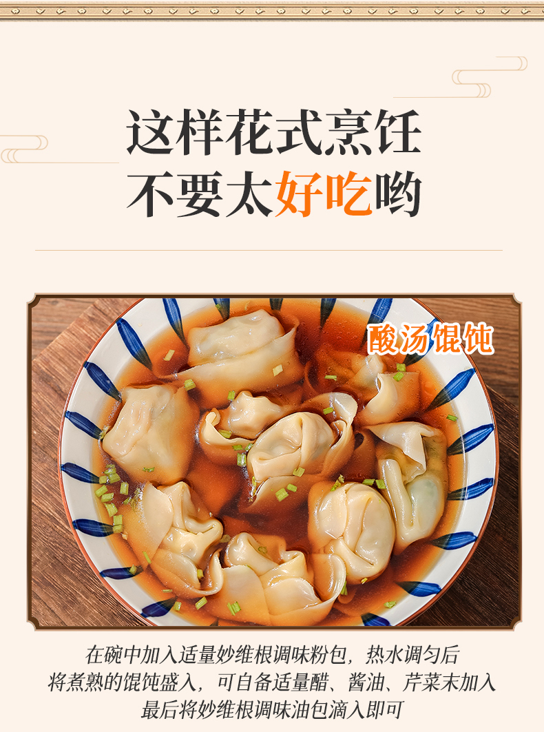 新增馄饨汤料包:包括6克调味粉包、2克调味油包,均为无添加。每袋重量更新为308克