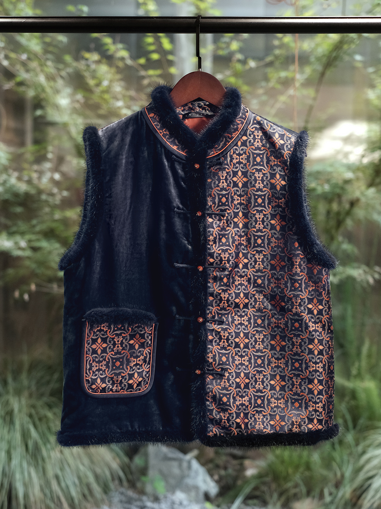 盛唐婧 | 新中式宋锦香云纱拼丝绒水貂对襟马甲