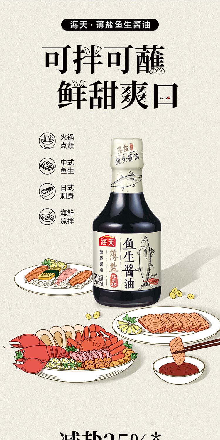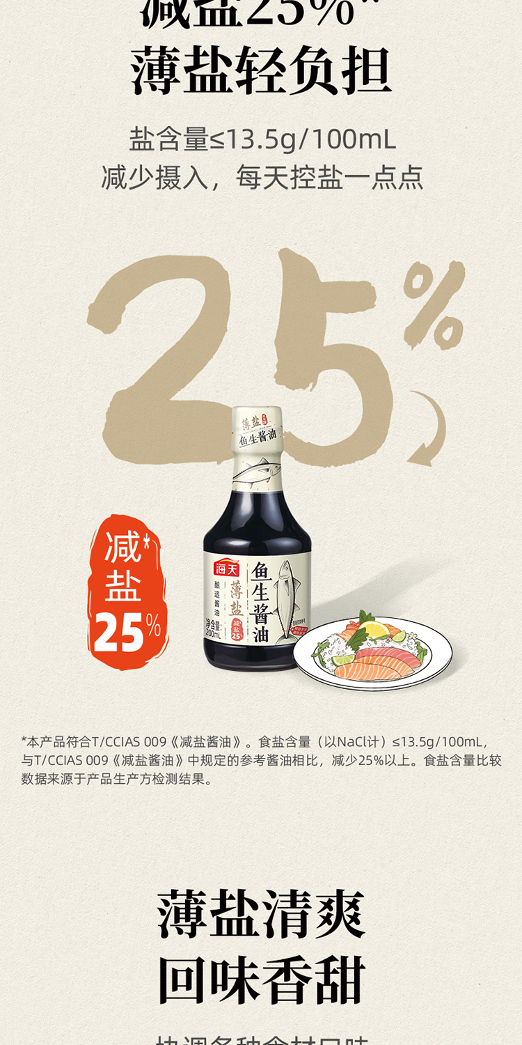 海天薄盐鱼生酱油200ml 减盐25% 海鲜凉拌 回味香甜