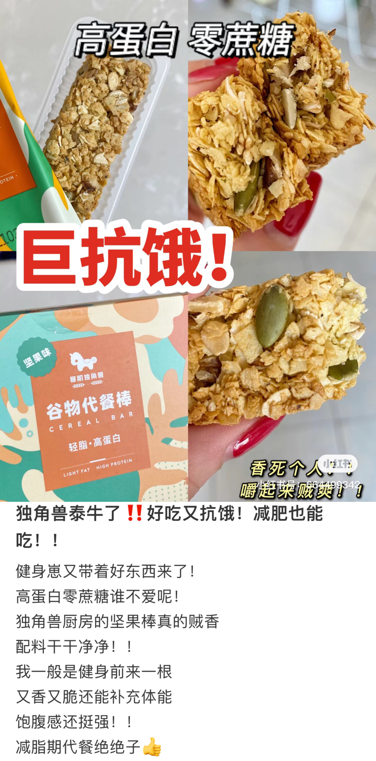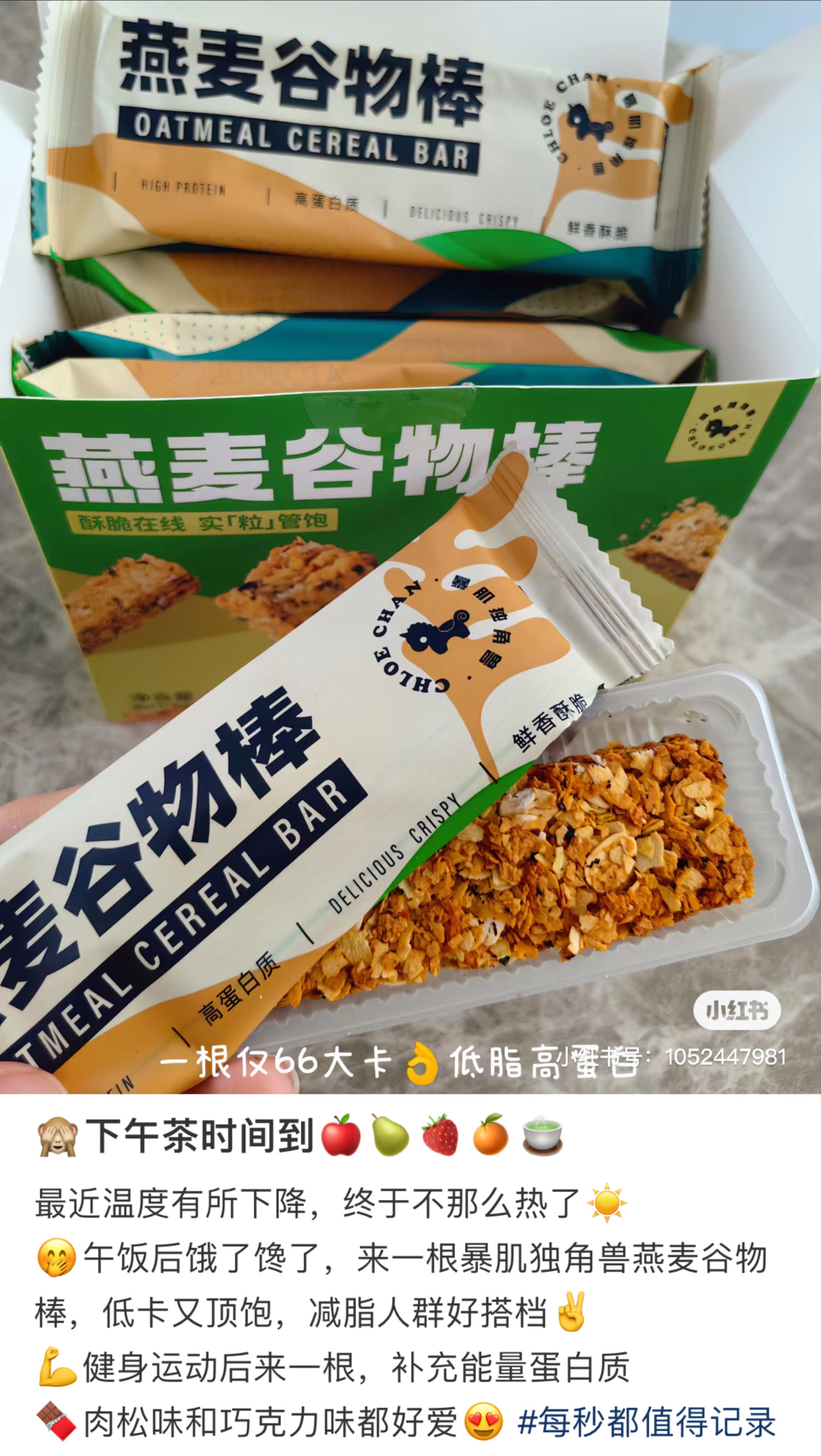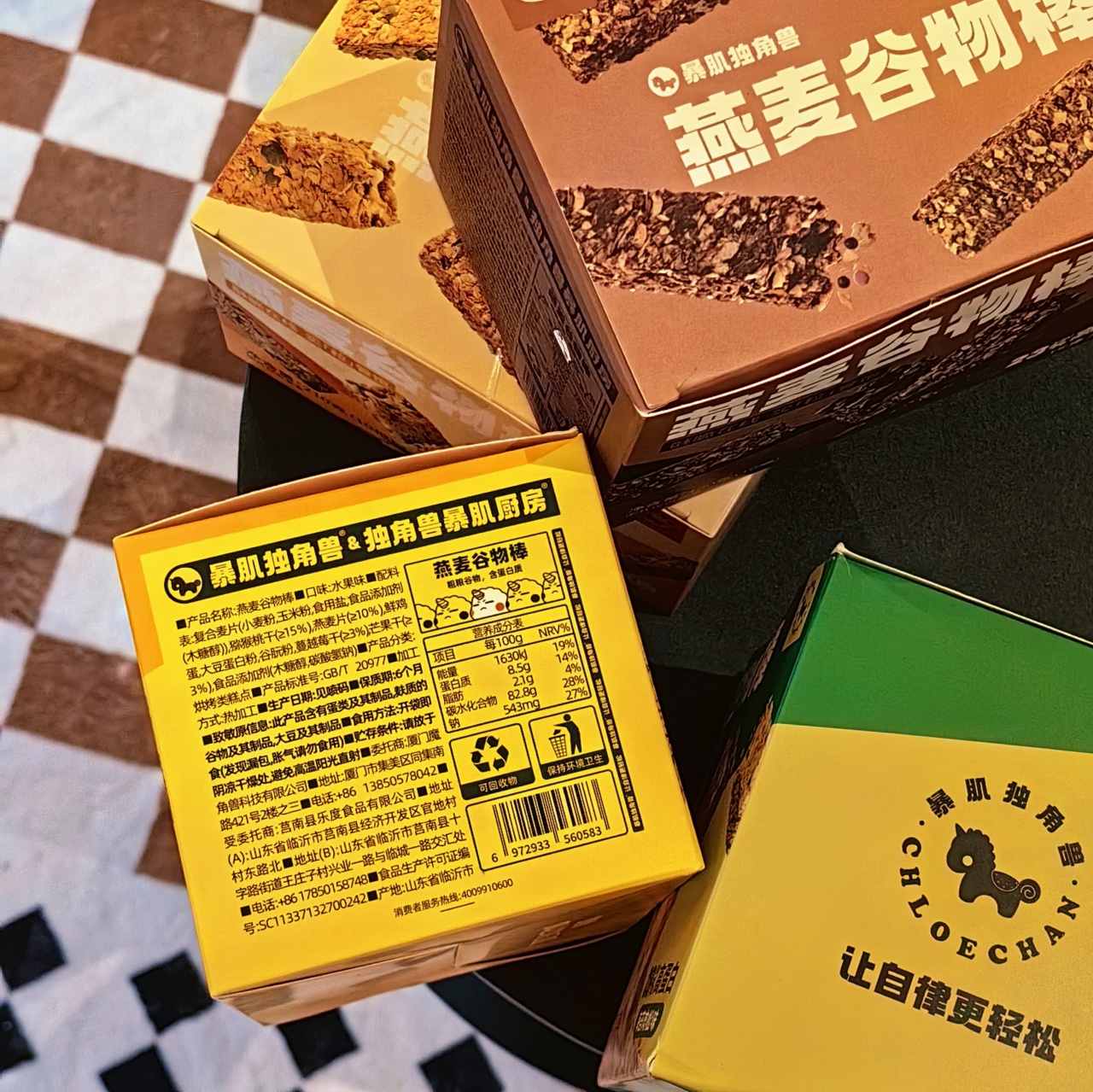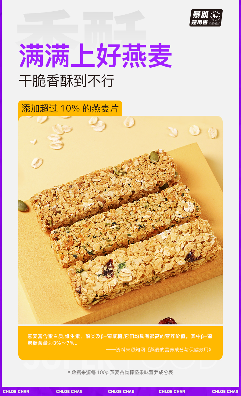 之前上了纯谷物的欧扎克全麦脆,真原汁原味,我个人非常爱,什么都不加就能啃,但考虑到喜欢咸咸甜甜的老粉,就把暴肌独角兽的谷物棒也上了吧,有坚果味、水果味、酸奶味,巧克力味和海苔肉松味,都很好吃,巨酥脆!