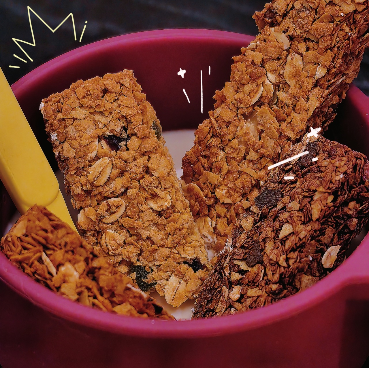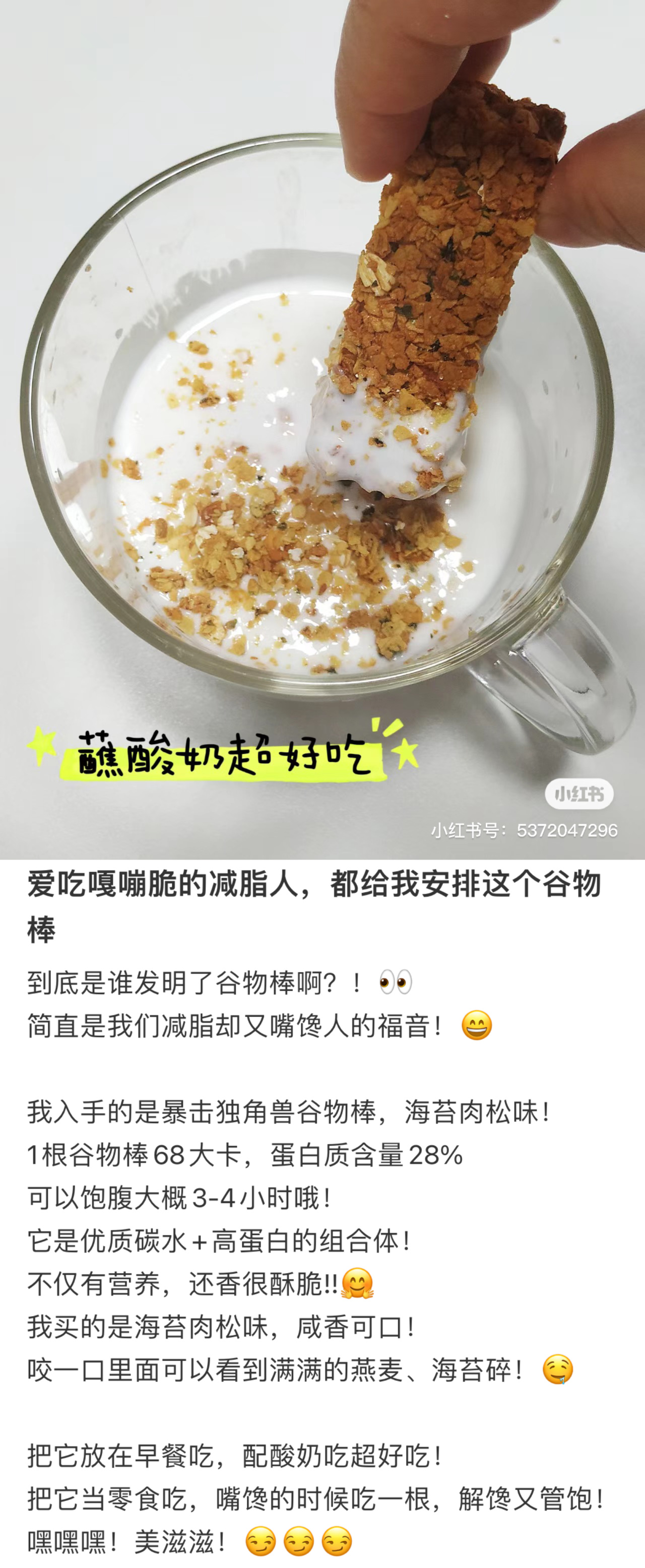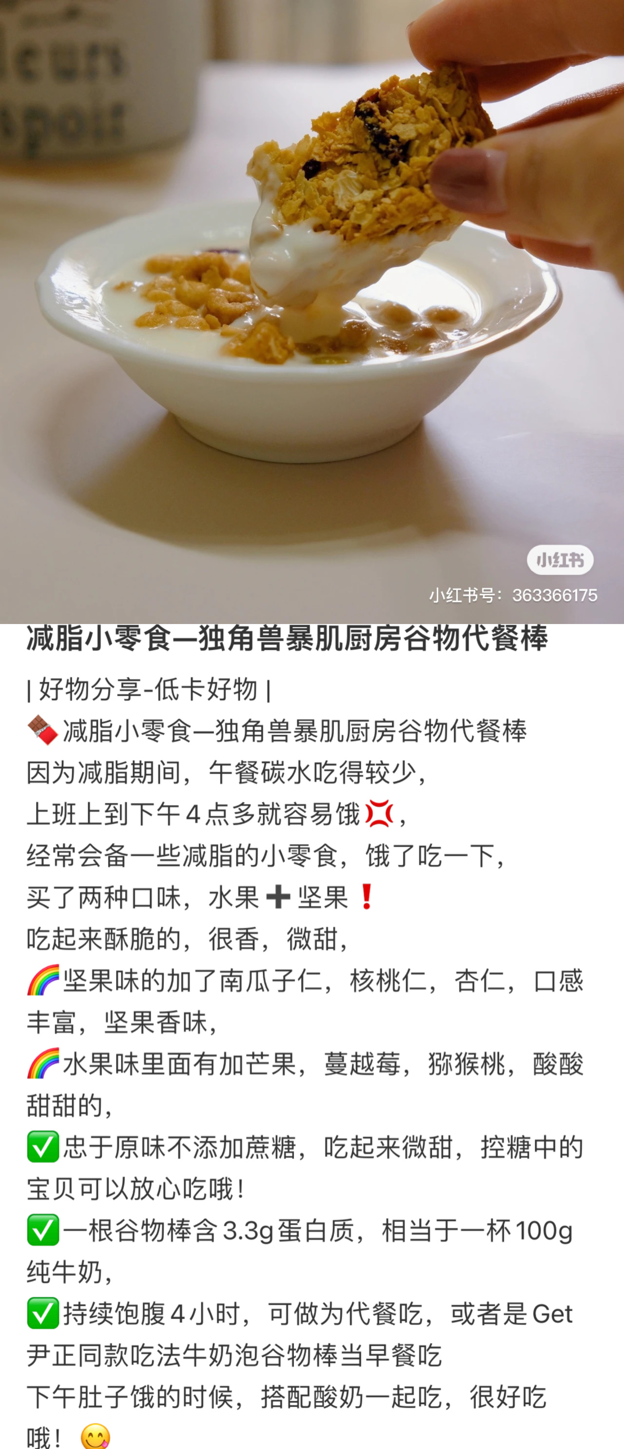 之前上了纯谷物的欧扎克全麦脆,真原汁原味,我个人非常爱,什么都不加就能啃,但考虑到喜欢咸咸甜甜的老粉,就把暴肌独角兽的谷物棒也上了吧,有坚果味、水果味、酸奶味,巧克力味和海苔肉松味,都很好吃,巨酥脆!